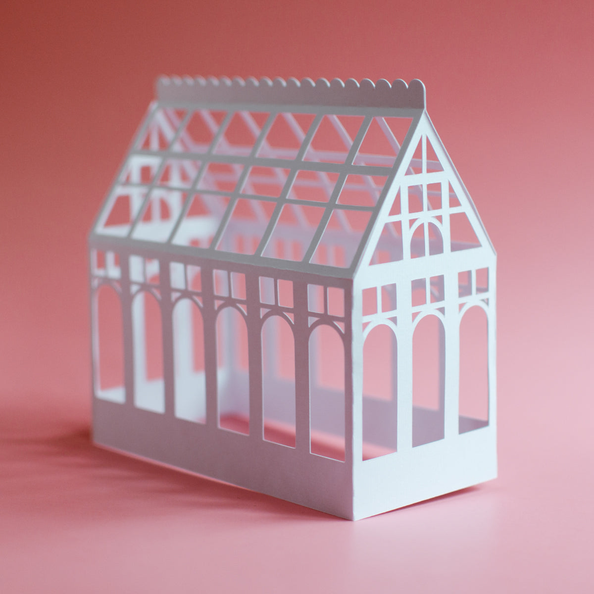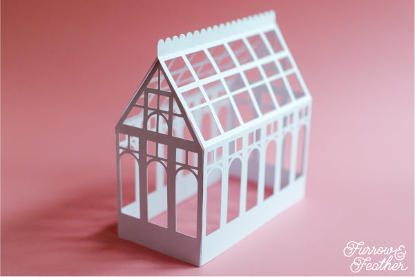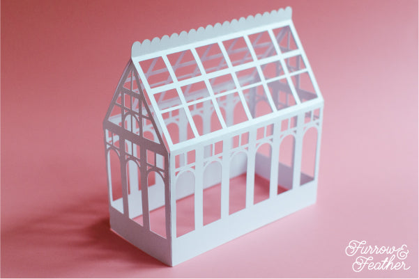 When cut out at the original file size, the greenhouse measures about 5” tall, 2.25” wide, and 5.25” deep. This design would work great cut out at a larger size.