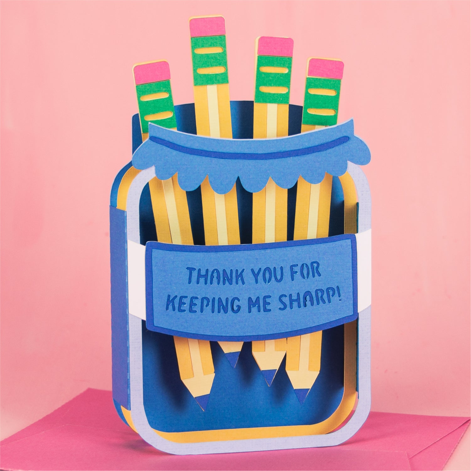 Create a fun Teacher Appreciation card with this Pencils in Jar Card - a 3D teacher gift card SVG! Includes the phrase 'Thank You for Keeping me Sharp!' on the front. Change the color of the cardstock to match your school colors! You could also add your own phrase, or the teacher's name. This is a great scrap-buster project. This cutting file is perfect for Cricut and Silhouette cutting machines. It folds flat for easy mailing and fits perfectly in the included 5x7” envelope cut file. Add your own phrase to the front! Explore more of my card designs for even more funny and creative ideas.