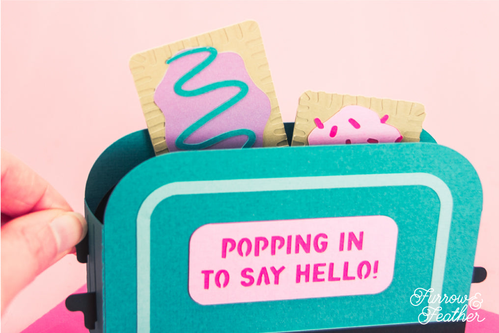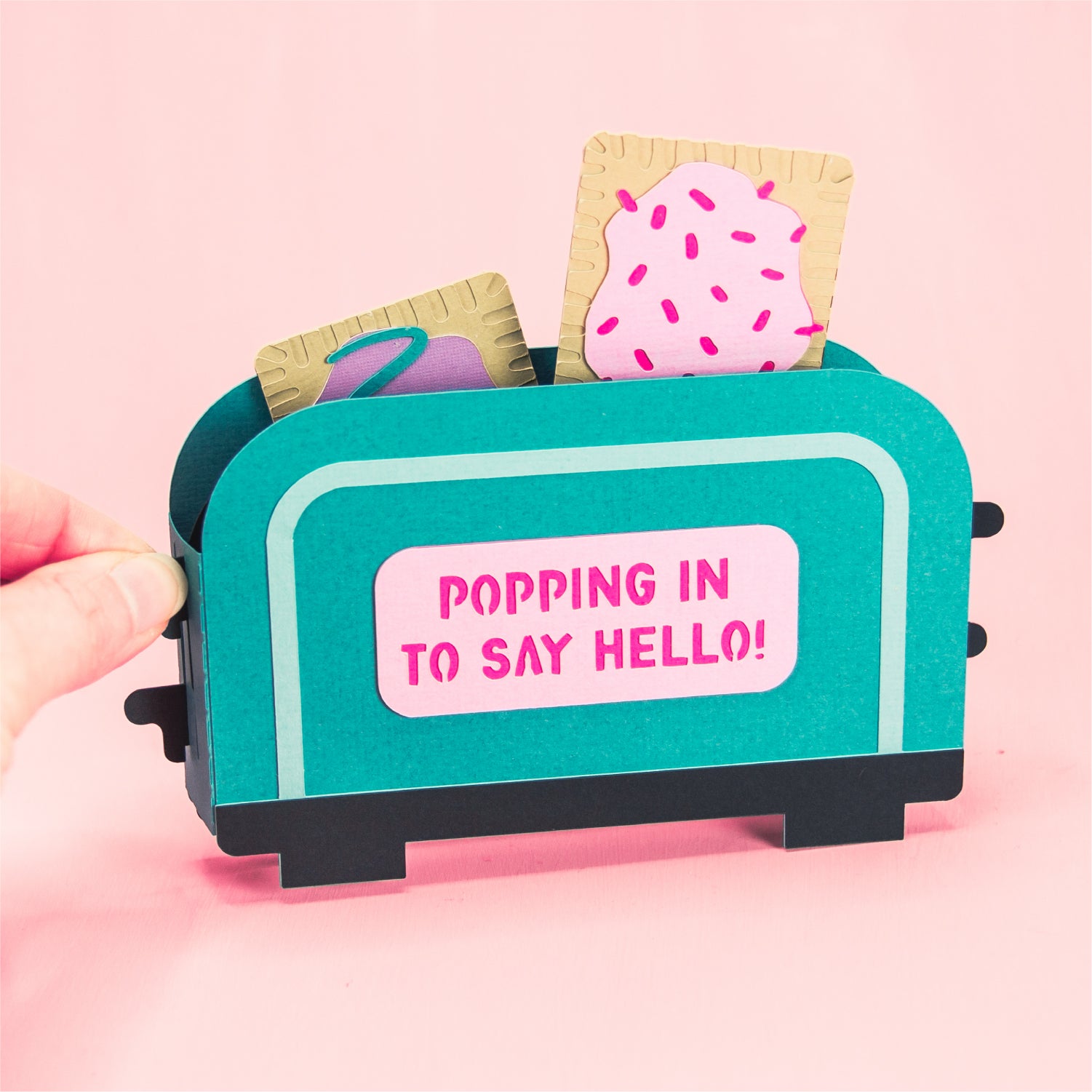 Create a fun card with this Toaster Pastries card - a 3D card SVG! This card is great for any occasion! The two middle pastry pieces are interactive, and can slide up. Includes the optional phrase 'Popping In To Say Hello!'. This cutting file is perfect for Cricut and Silhouette cutting machines. It folds flat for easy mailing and fits perfectly in the included 5x7” envelope cut file. Add your own phrase to the front! Explore more of my card designs for even more funny and creative ideas.