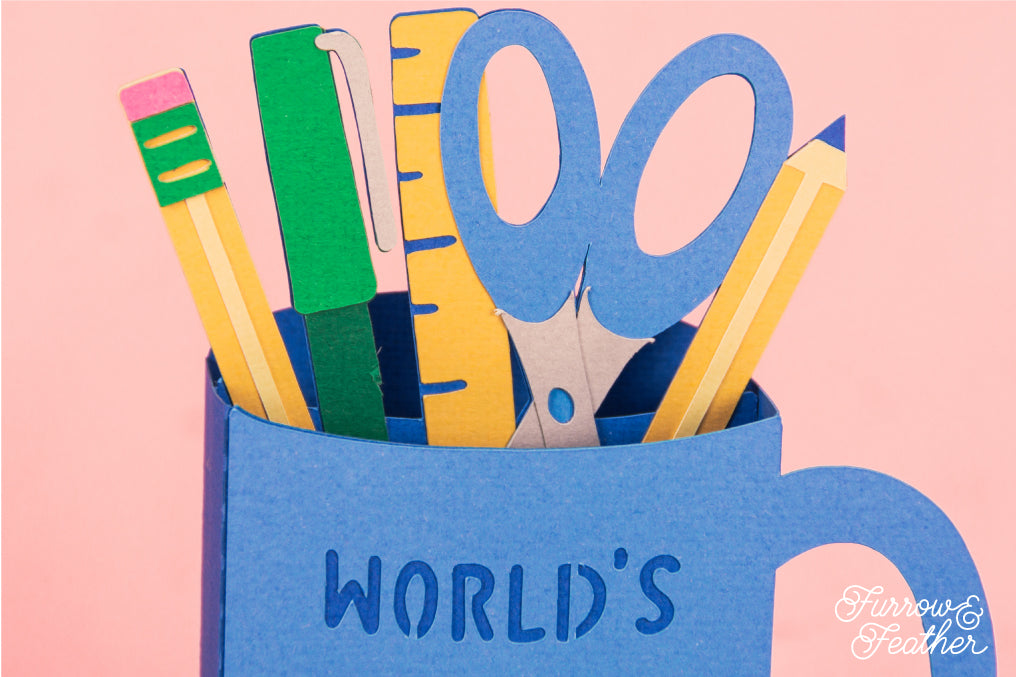 Create a fun Teacher Appreciation card with this World's Greatest Teacher Mug Card - a 3D teacher gift card SVG! Change the cardstock colors to match your school colors! This cutting file is perfect for Cricut and Silhouette cutting machines. It folds flat for easy mailing and fits perfectly in the included 5x7” envelope cut file. Add your own phrase to the front! Explore more of my card designs for even more funny and creative ideas.