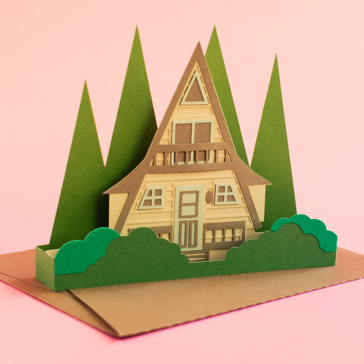 Calling all campers! This cute cabin card folds flat to fit in the included 5x7” envelope cut file. Really customize the colors of the cabin, I think red would look great for a Holiday theme! File includes a separate 5x7 white piece, so you can write a note.