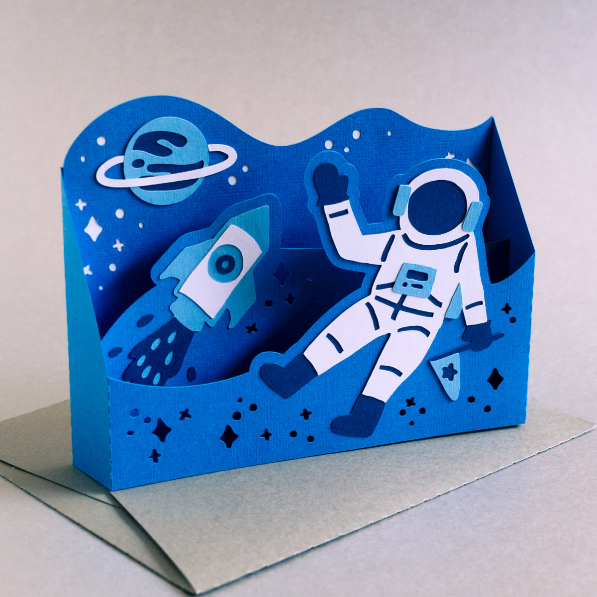 This is a great card for your favorite space explorer! Really simple & quick to put together, and only uses four colors if you cut the card as-is! Add you own sentiment to personalize the card, and you can write a note on the back. Folds flat to fit in the included 5x7” envelope cut file.