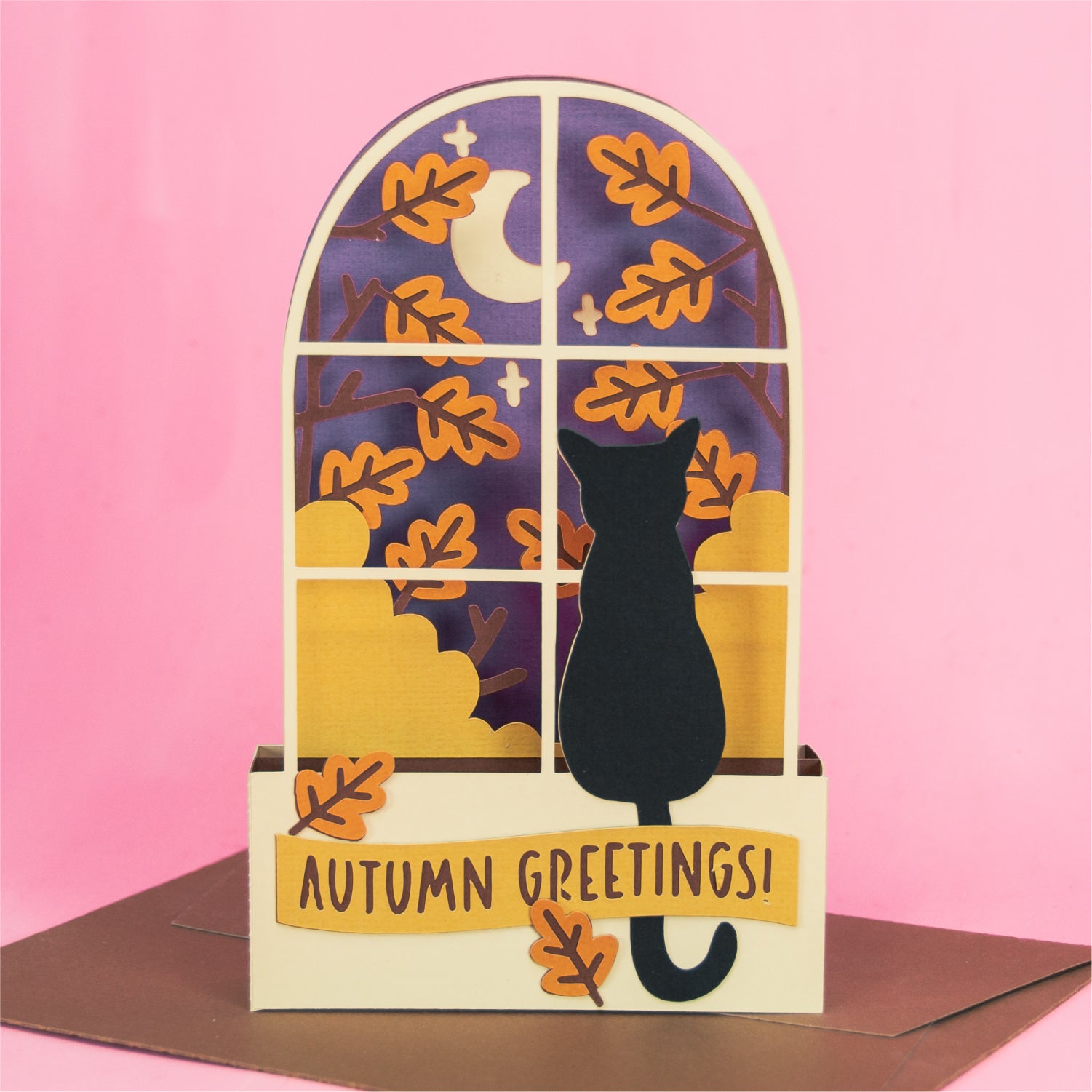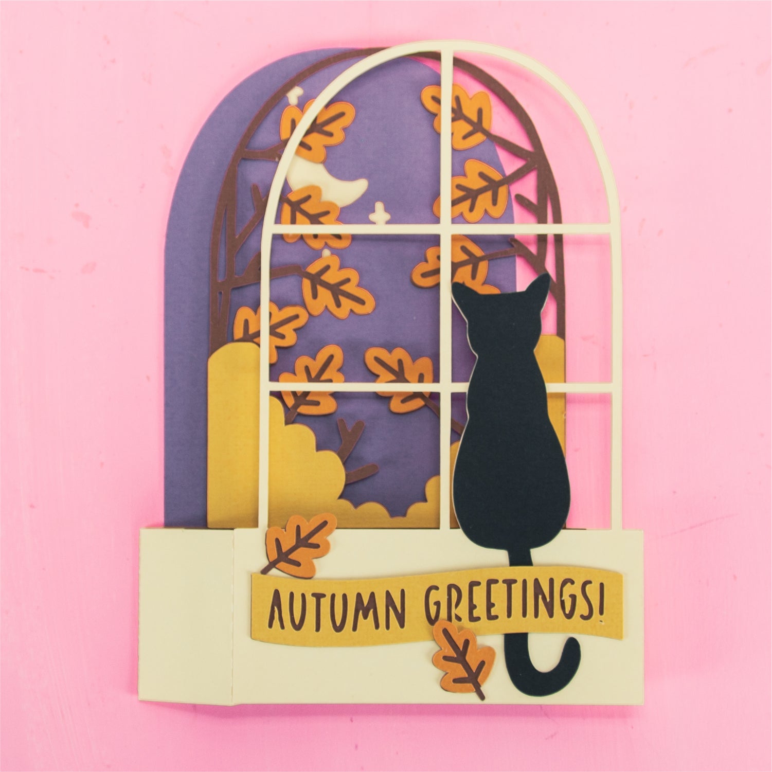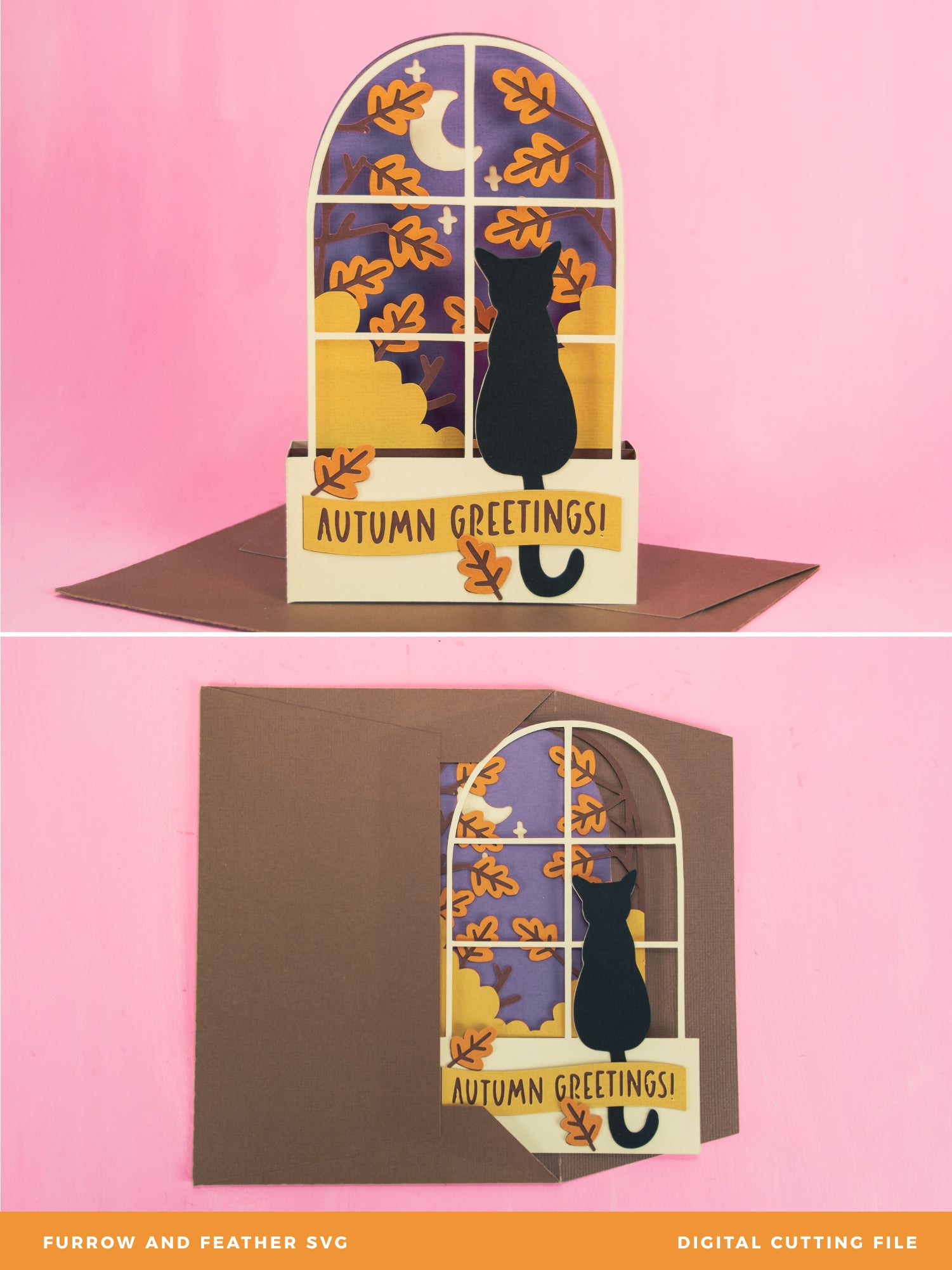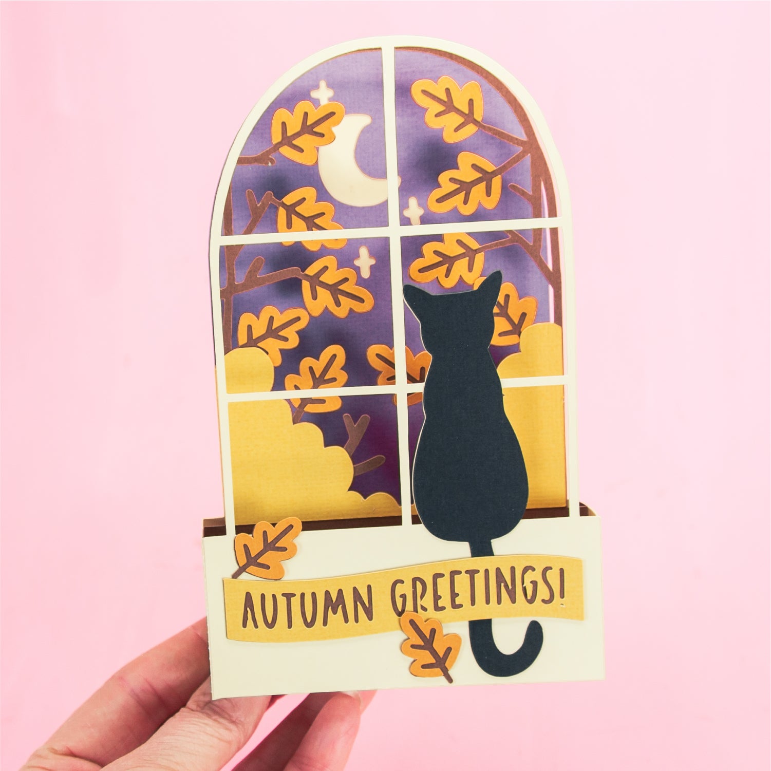 Create such a fun fall themed card with this Autumn Window card design - a 3D card SVG! It works well for any occasion. This design features a cat looking out of a window, with some fall colored trees in the background with a moon and stars. This file includes the optional phrase 'Autumn Greetings!', I love this one for Halloween too. Feel free to switch that out! You could also change the color of the cat. This cutting file is perfect for Cricut and Silhouette cutting machines, and is a great scrap buster project. The card folds flat for easy mailing and fits perfectly in the included 5x7” envelope cut file. Explore more of my card designs for even more cute and creative papercraft ideas!