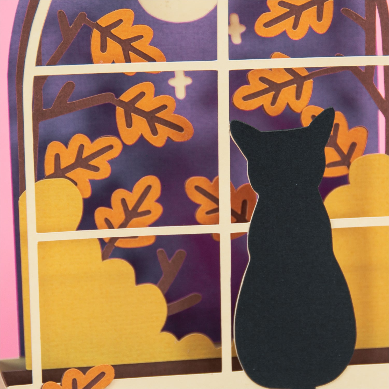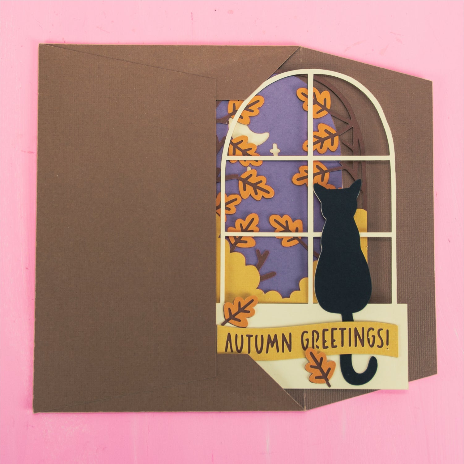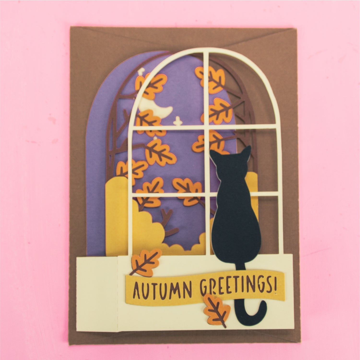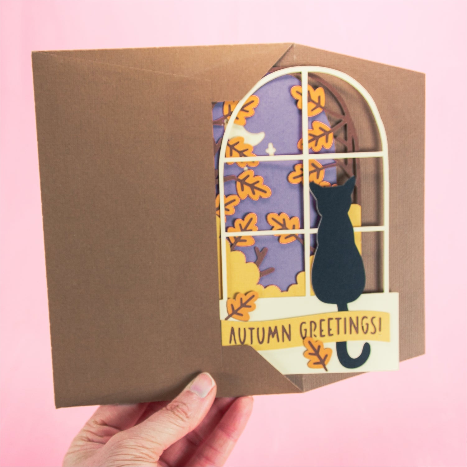 Create such a fun fall themed card with this Autumn Window card design - a 3D card SVG! It works well for any occasion. This design features a cat looking out of a window, with some fall colored trees in the background with a moon and stars. This file includes the optional phrase 'Autumn Greetings!', I love this one for Halloween too. Feel free to switch that out! You could also change the color of the cat. This cutting file is perfect for Cricut and Silhouette cutting machines, and is a great scrap buster project. The card folds flat for easy mailing and fits perfectly in the included 5x7” envelope cut file. Explore more of my card designs for even more cute and creative papercraft ideas!