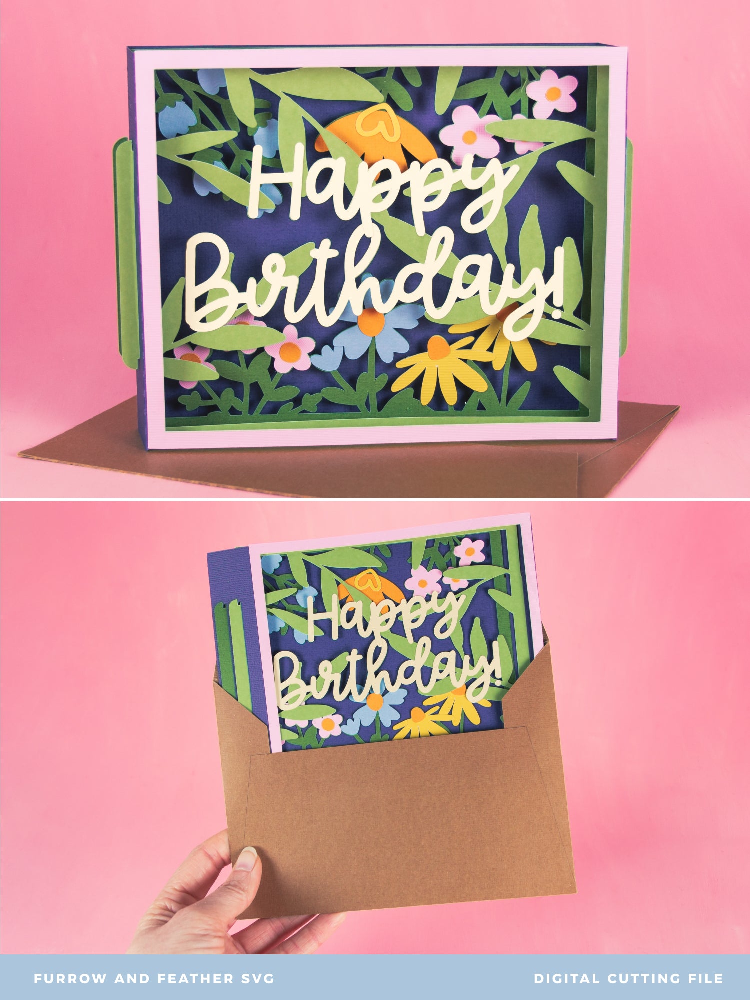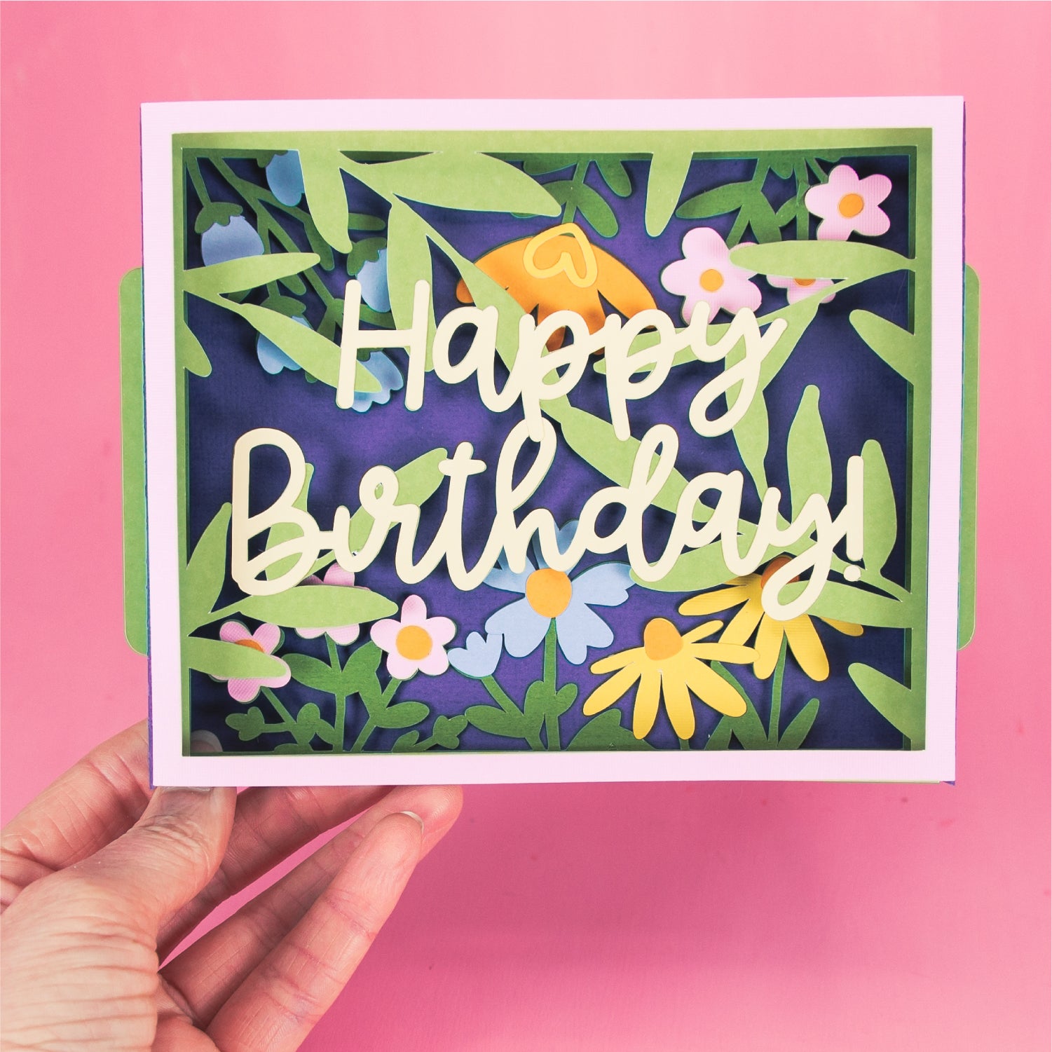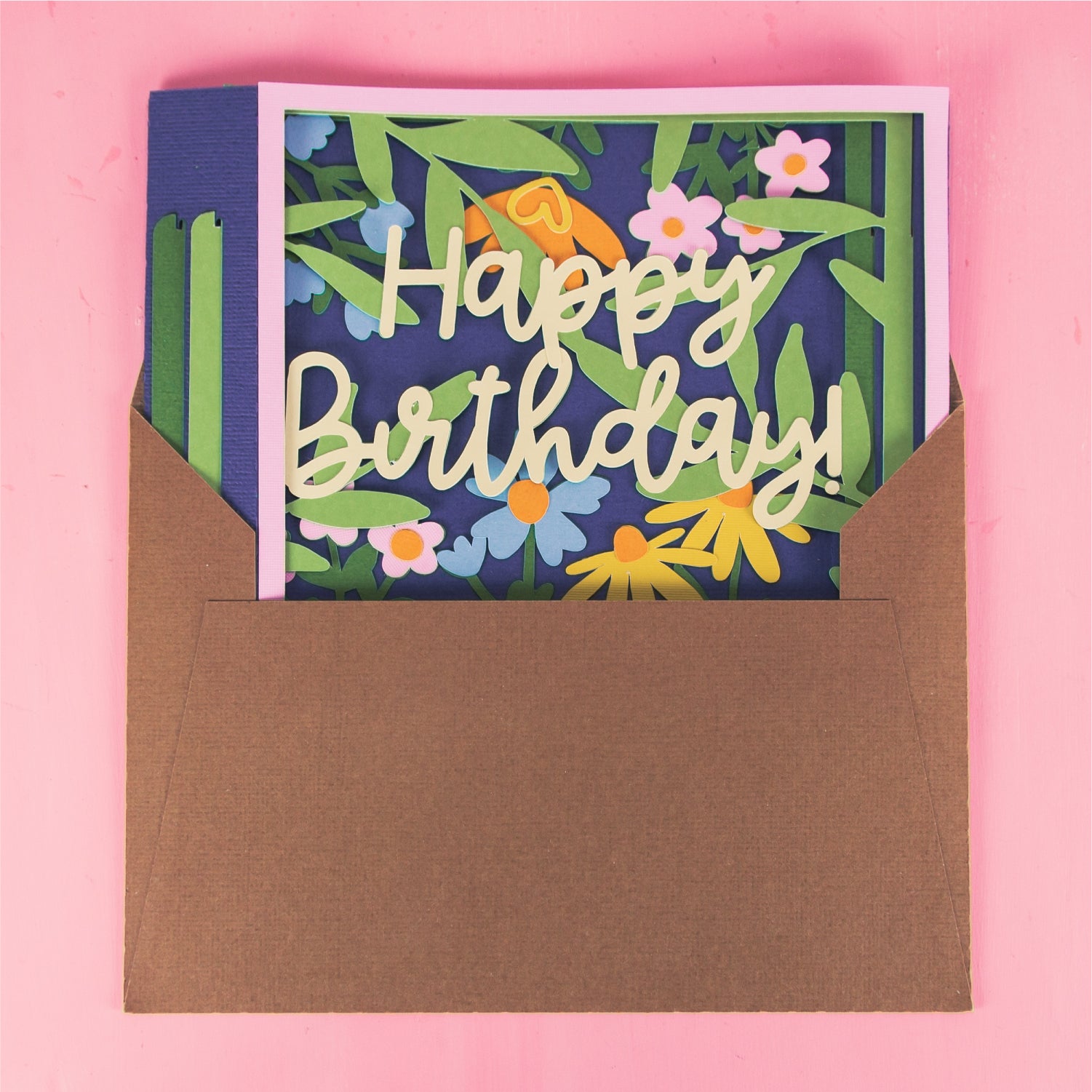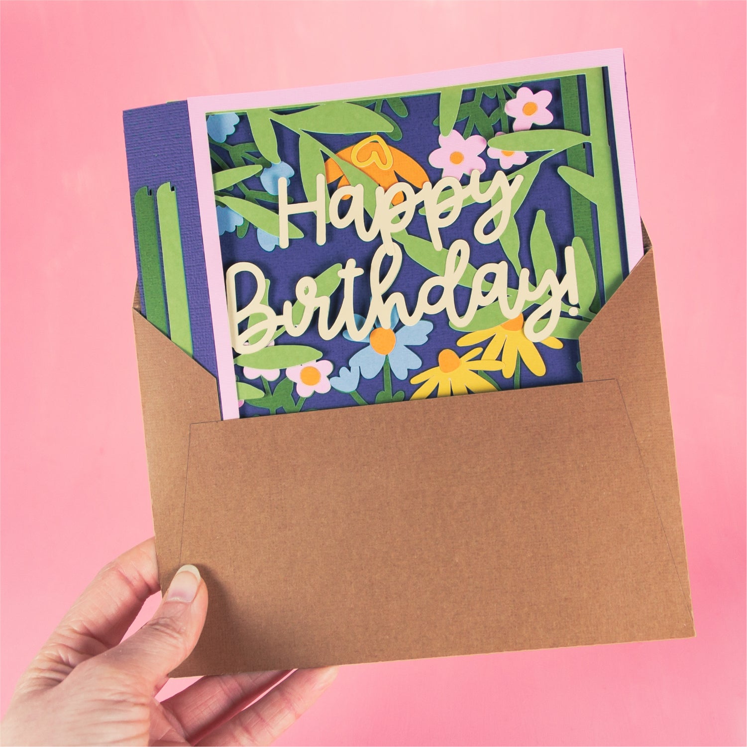 Create a stunning birthday card with this Birthday Card Layered with Flowers - a 3D card SVG! This is a gorgeous birthday card for mom, a co-worker, grandma, a friend and more! I love updating the cardstock colors to match the recipients favorite flowers! This cutting file is perfect for Cricut and Silhouette cutting machines. The card folds flat for easy mailing and fits perfectly in the included 5x7” envelope cut file. Explore more of my card designs for even more cute and creative ideas!