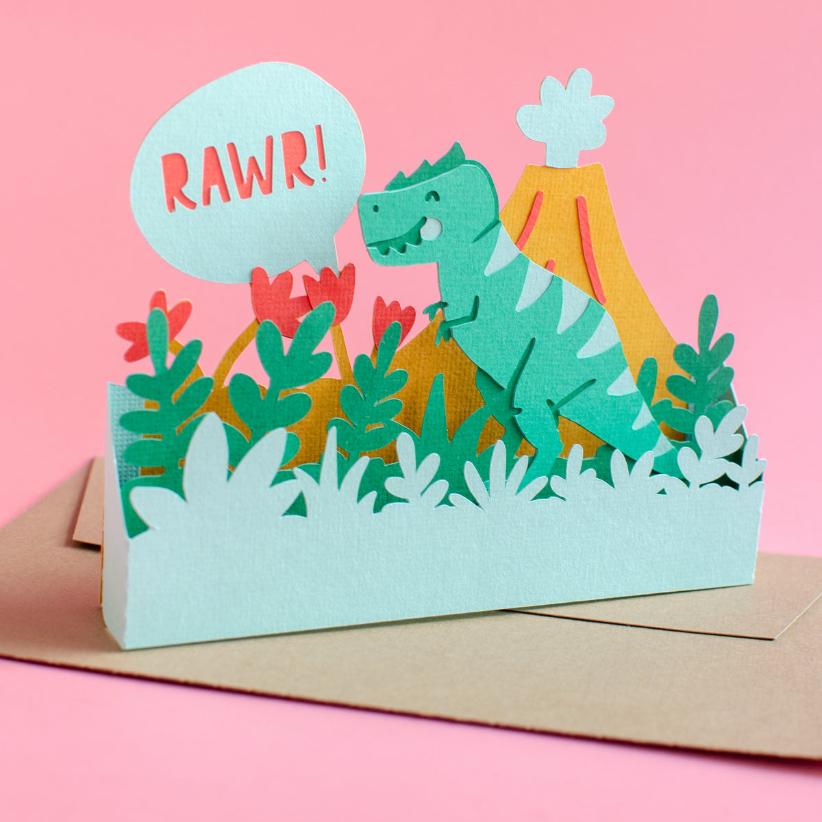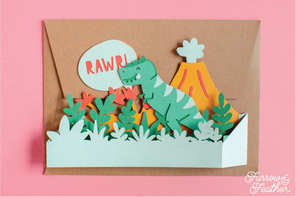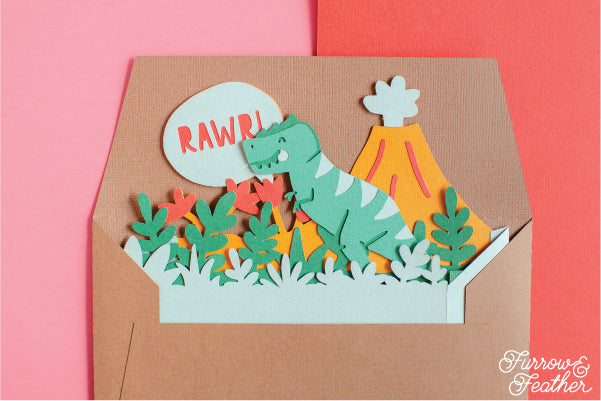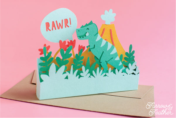 This is such a fun birthday card for the dino-lover in your life! Use the included sentiments to personalize the card, or write your own message! Folds flat to fit in the included 5x7” envelope cut file.
