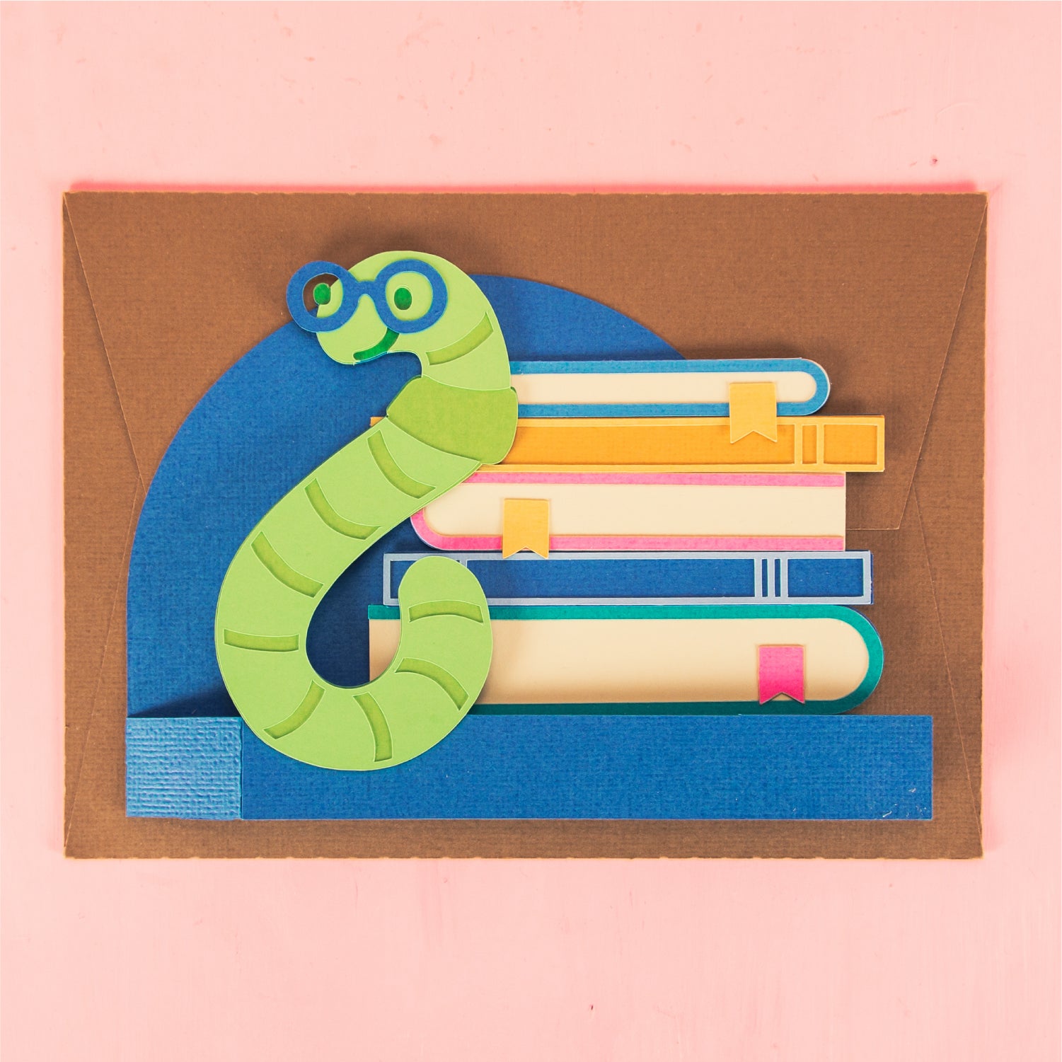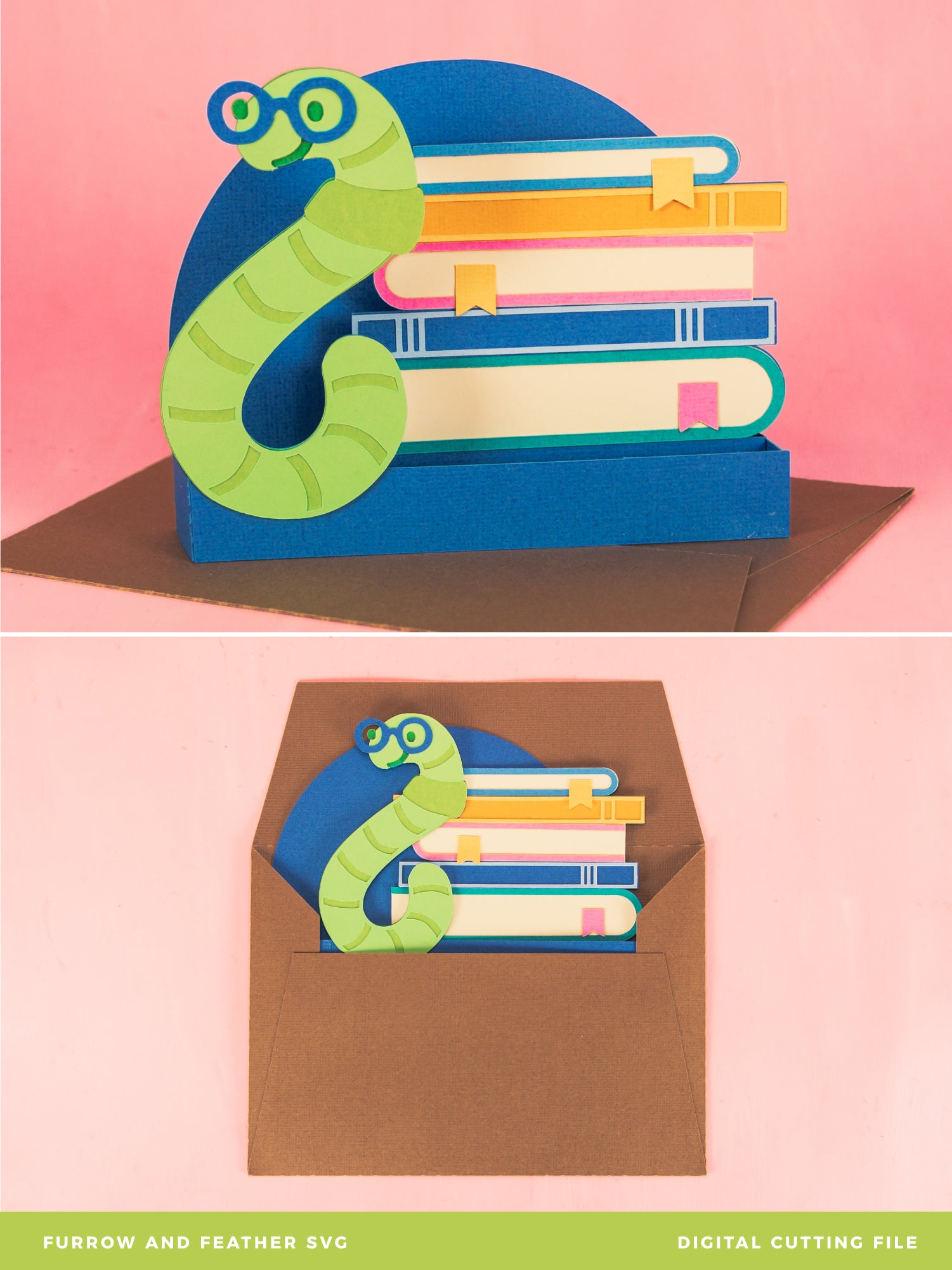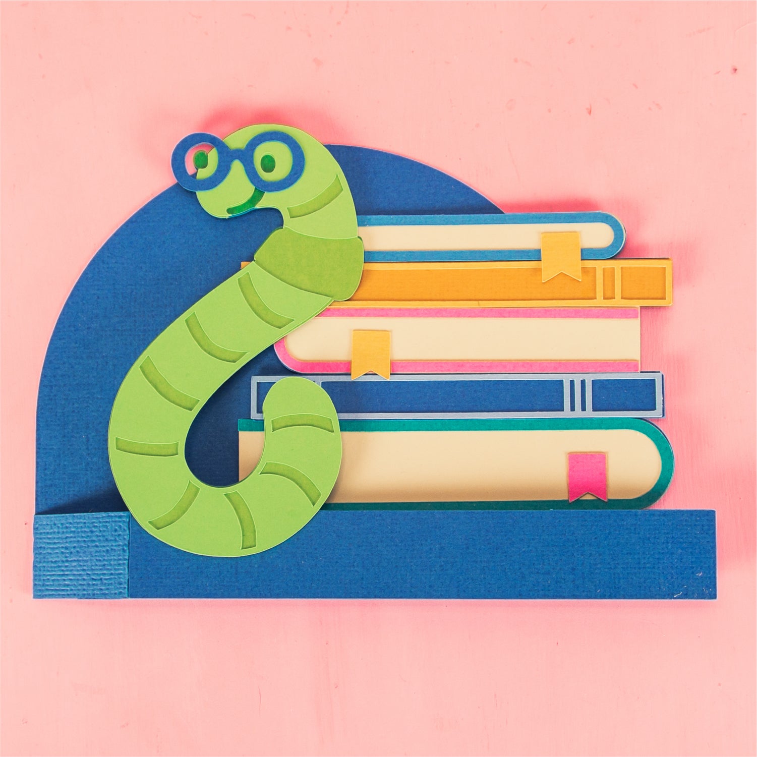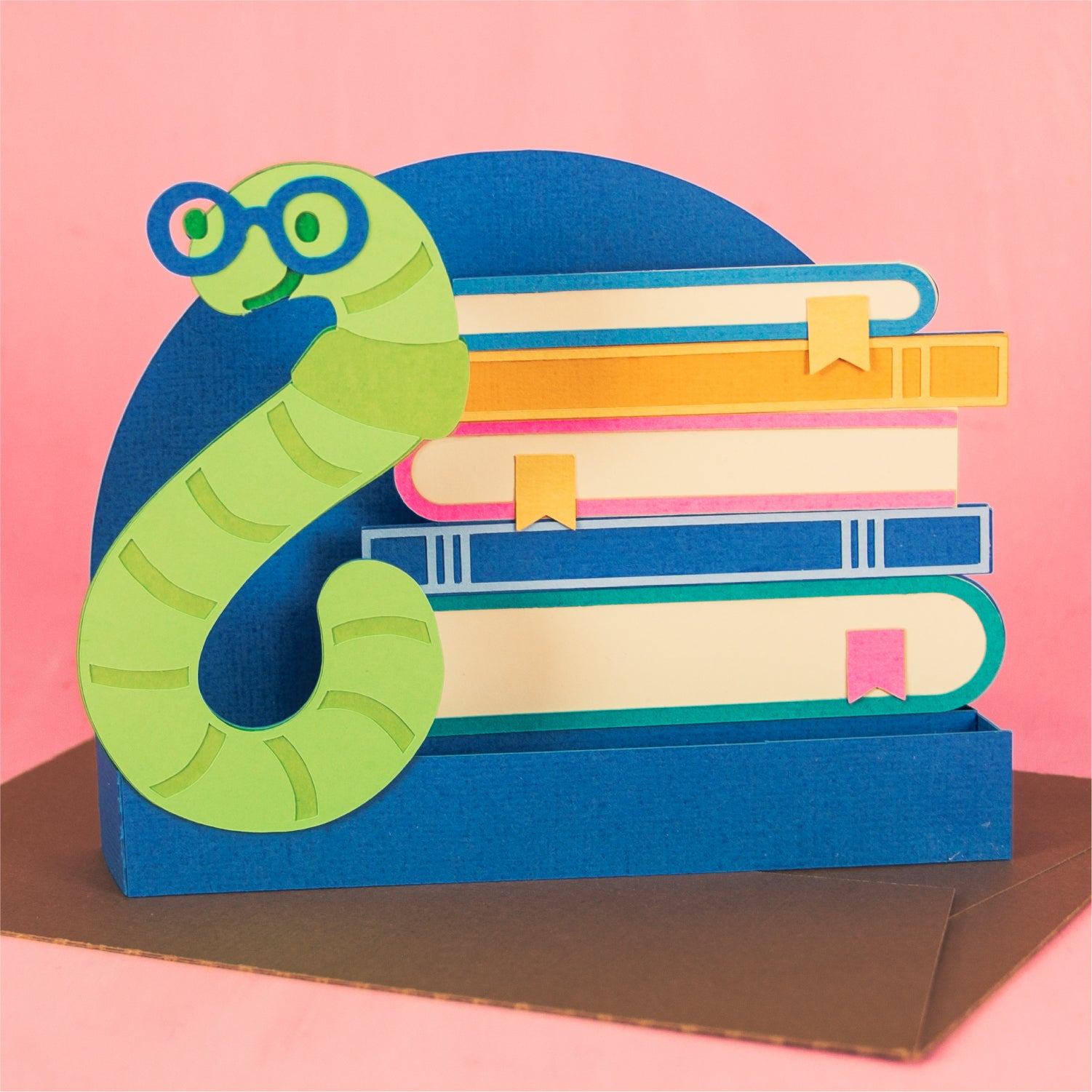 Create such a fun card for your favorite graduate, teacher, or reader with this Book Worm Card - a 3D school themed card SVG! This works great for a school graduation, teacher appreciation, or as a back to school card. This design features a book worm leaning on a stack of books. I love to change the cardstock colors to match the recipients school! This cutting file is perfect for Cricut and Silhouette cutting machines. The card folds flat for easy mailing and fits perfectly in the included 5x7” envelope cut file. Explore more of my card designs for even more cute and creative ideas!