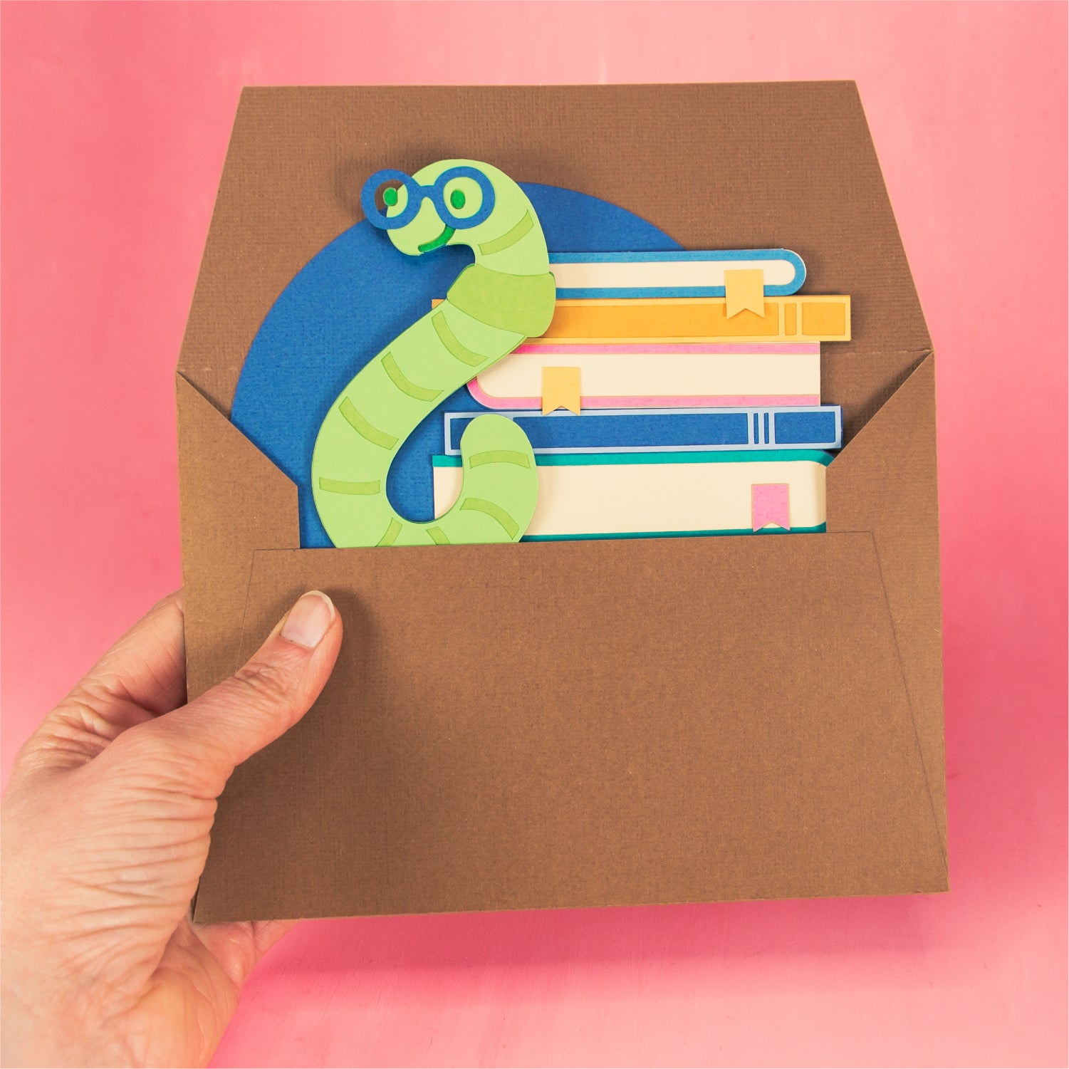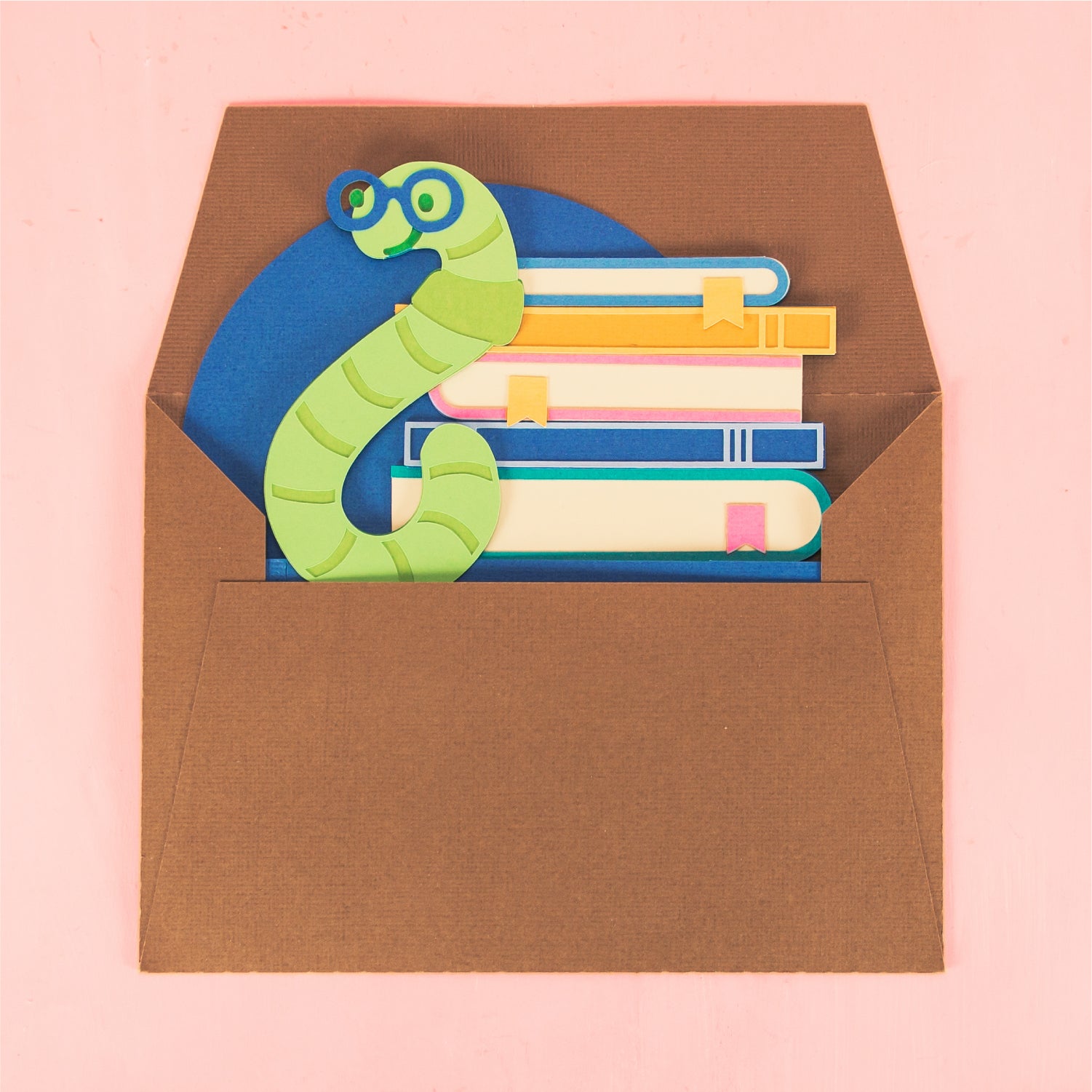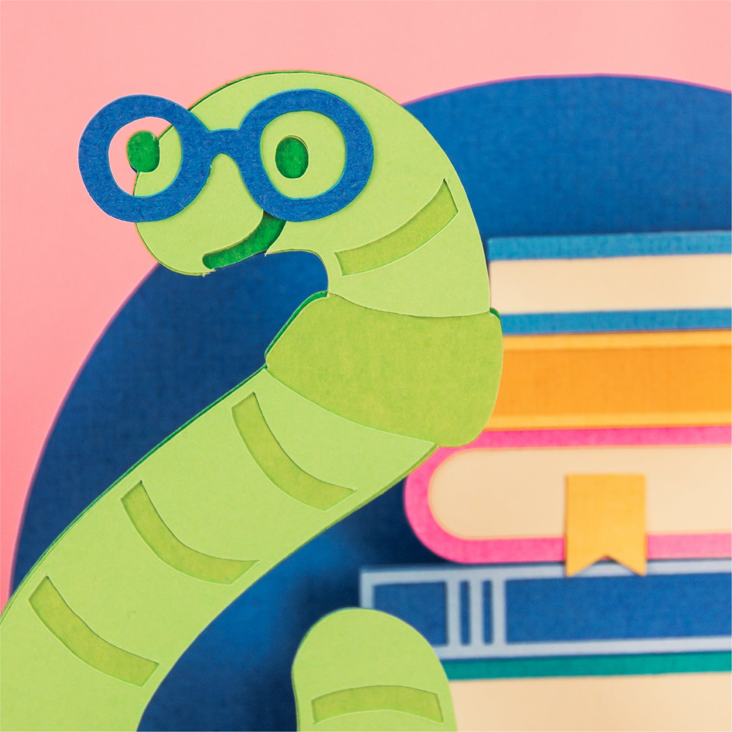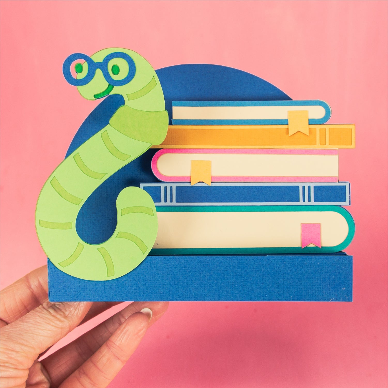 Create such a fun card for your favorite graduate, teacher, or reader with this Book Worm Card - a 3D school themed card SVG! This works great for a school graduation, teacher appreciation, or as a back to school card. This design features a book worm leaning on a stack of books. I love to change the cardstock colors to match the recipients school! This cutting file is perfect for Cricut and Silhouette cutting machines. The card folds flat for easy mailing and fits perfectly in the included 5x7” envelope cut file. Explore more of my card designs for even more cute and creative ideas!