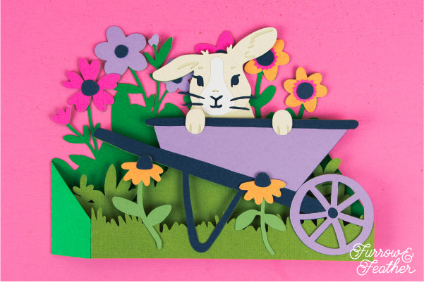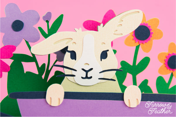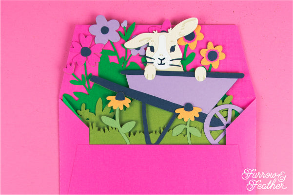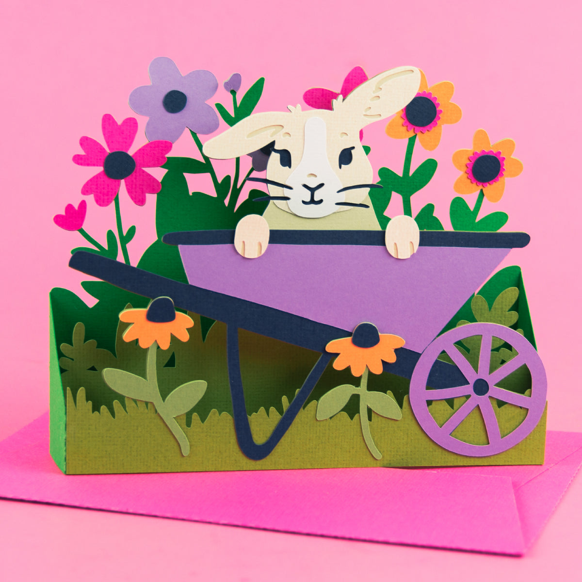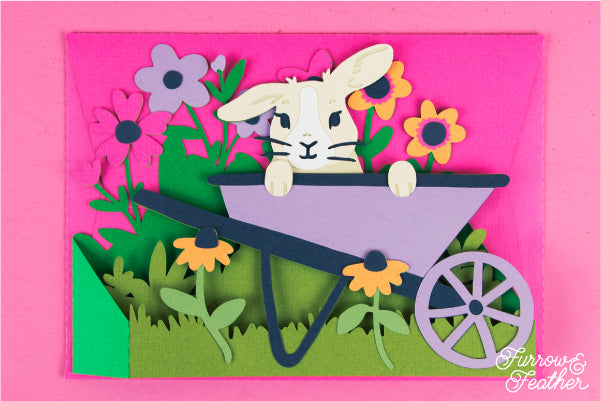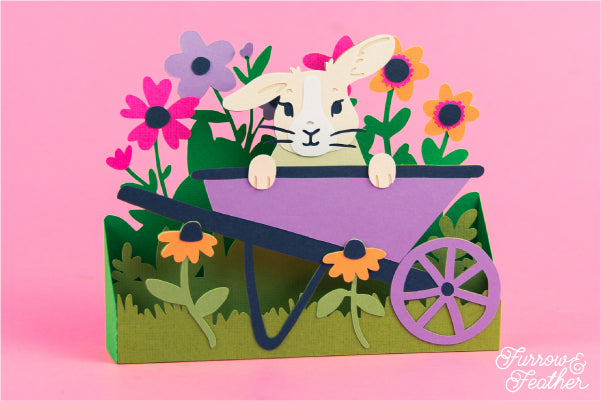 The cutest card for Easter or spring! Change the color of the bunny to customize the card (brown would be cute!), or add your own sentiment! Folds flat to fit in the included 5x7” envelope cut file.
