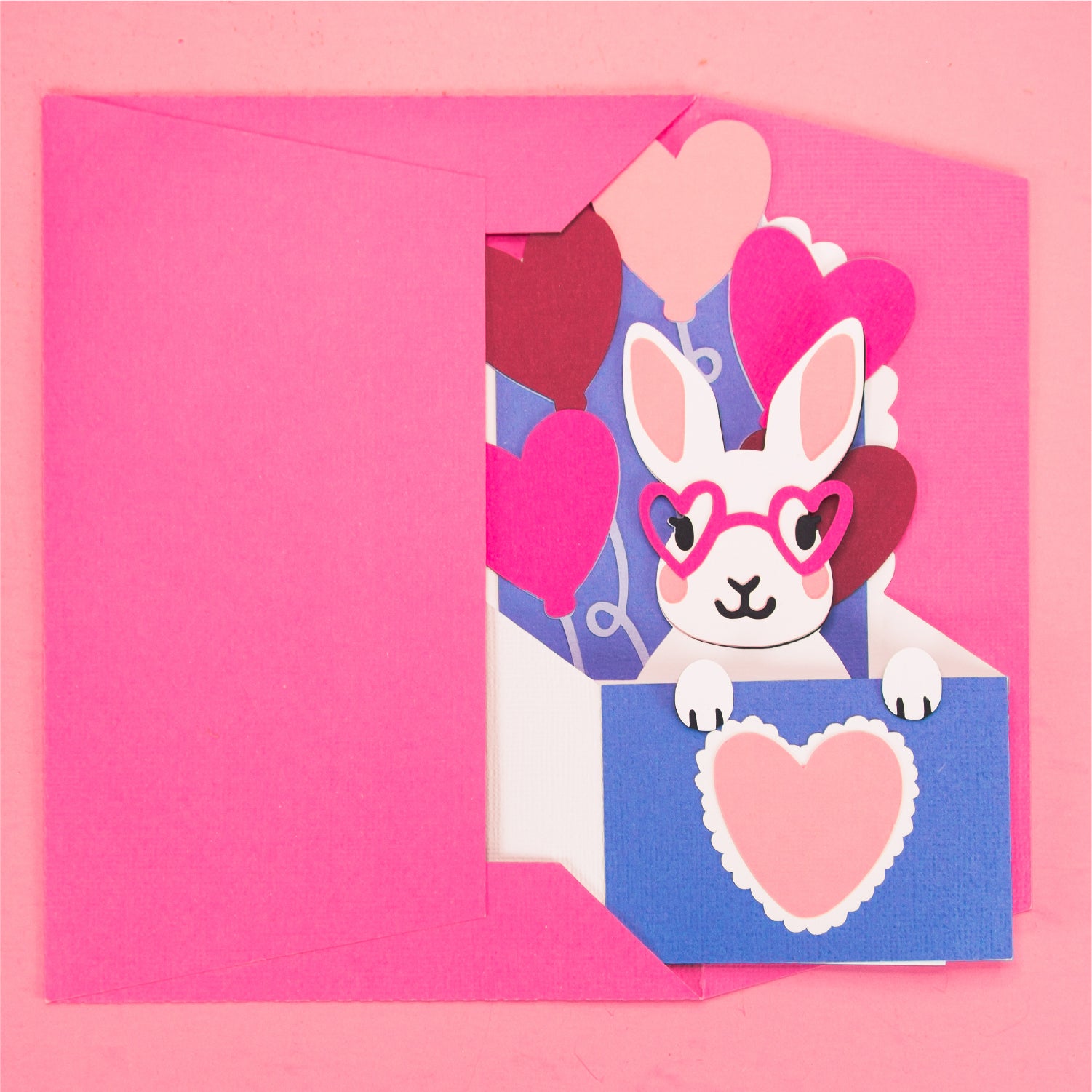 Create an adorable Valentine's Day card with this Bunny with Heart Balloons Card SVG! This design features a rabbit in heart glasses, in front of some colorful heart balloons. I love this one for Valentine's Day, a birthday, or for a new pet! I'd love to see the balloons in a patterned or glitter cardstock! This cutting file is perfect for Cricut and Silhouette cutting machines. This design folds flat for easy mailing and fits perfectly in the included 5x7” envelope cut file. Explore more of my card designs for even more cute and creative papercraft ideas!
