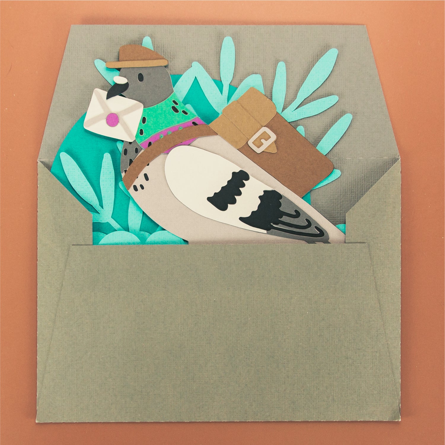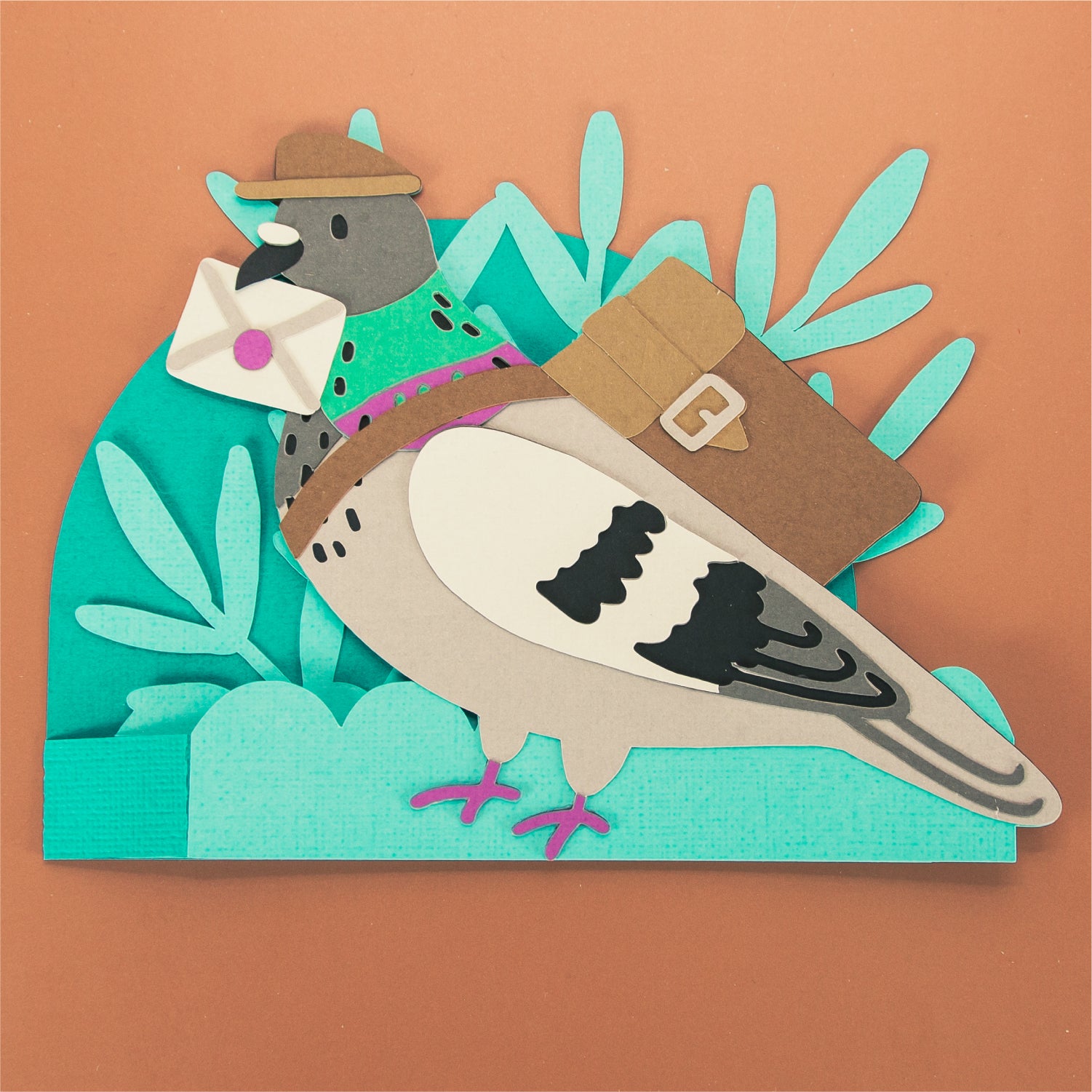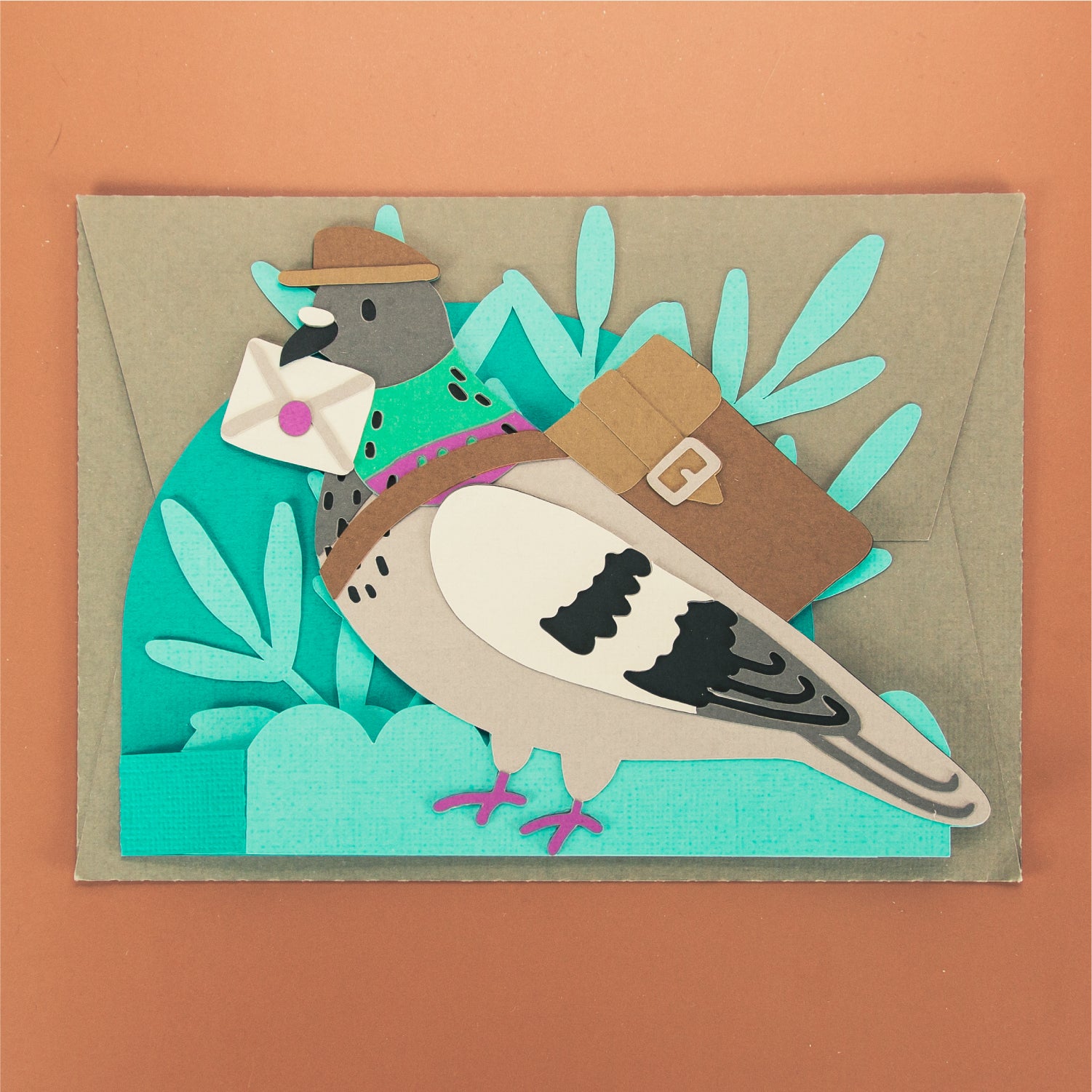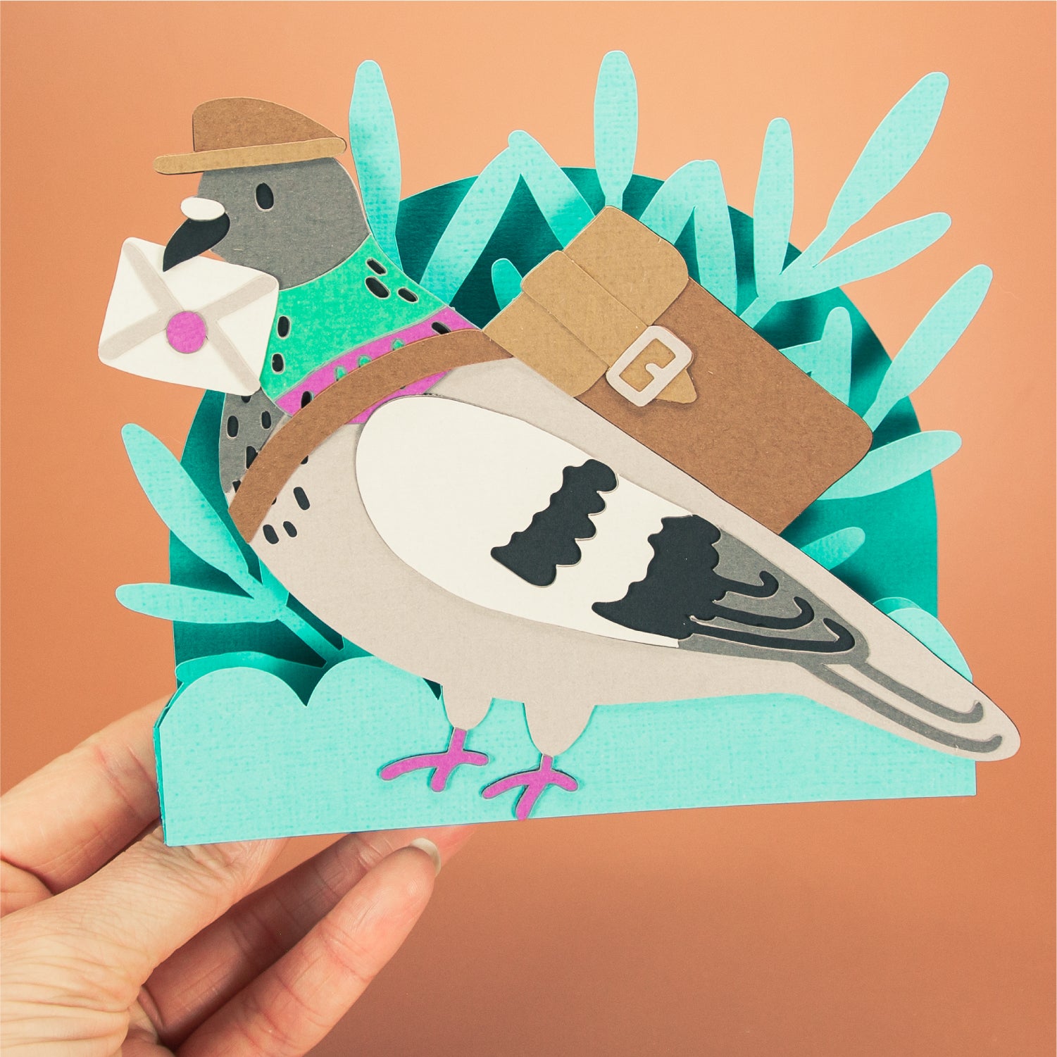 Create a super fun card with this Carrier Pigeon Card - a 3D 'just because' card SVG! This is such a fun card to mail to a friend! This design features a carrier pigeon with an adorable backpack & cap, holding a letter in their beak. I love updating the cardstock colors for the middle & back pieces. You could also write a fun word on the letter in the pigeon's beak! You could also make that letter larger and tuck it under the wing. This cutting file is perfect for Cricut and Silhouette cutting machines. The card folds flat for easy mailing and fits perfectly in the included 5x7” envelope cut file. Explore more of my card designs for even more cute and creative papercraft ideas!