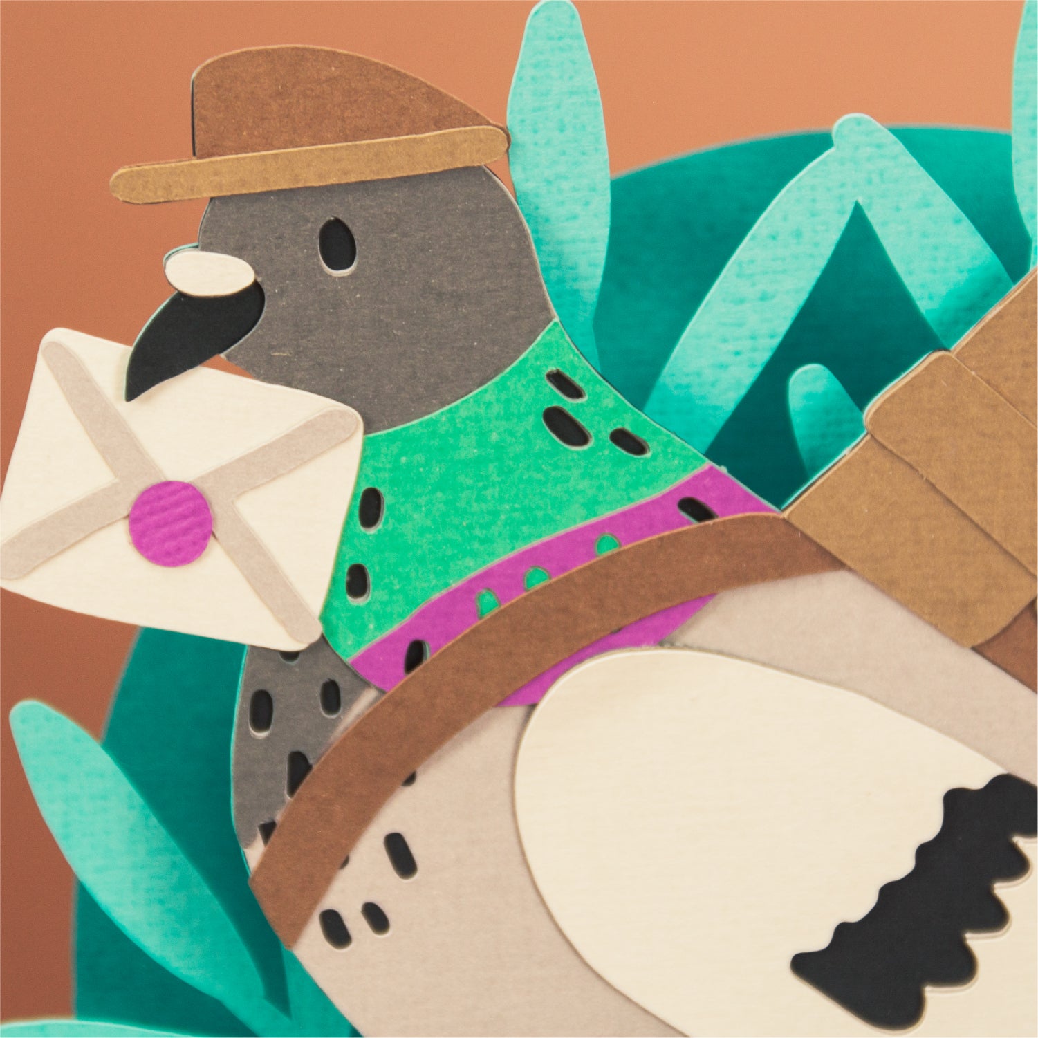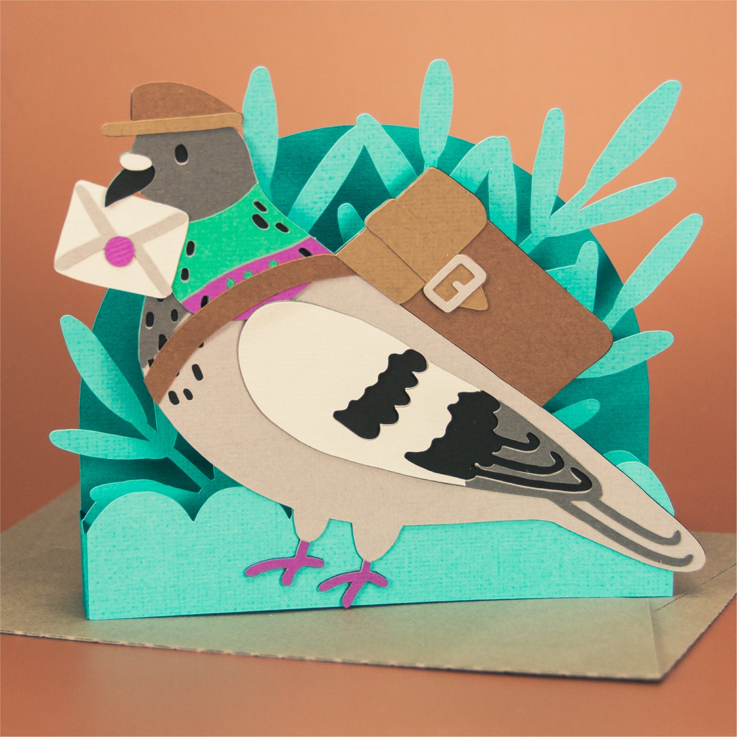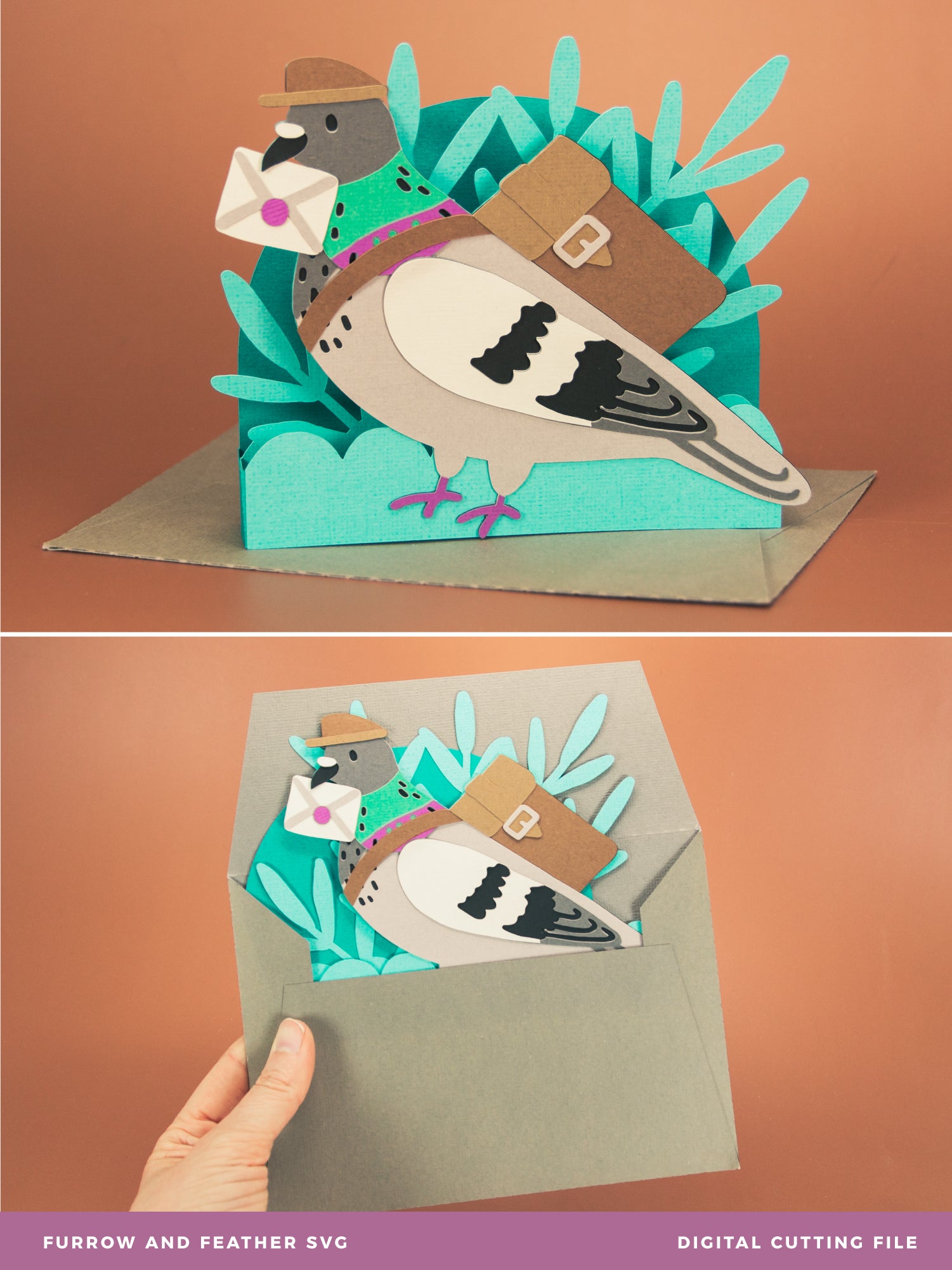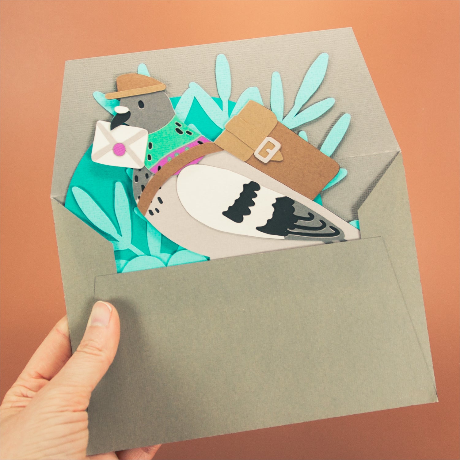 Create a super fun card with this Carrier Pigeon Card - a 3D 'just because' card SVG! This is such a fun card to mail to a friend! This design features a carrier pigeon with an adorable backpack & cap, holding a letter in their beak. I love updating the cardstock colors for the middle & back pieces. You could also write a fun word on the letter in the pigeon's beak! You could also make that letter larger and tuck it under the wing. This cutting file is perfect for Cricut and Silhouette cutting machines. The card folds flat for easy mailing and fits perfectly in the included 5x7” envelope cut file. Explore more of my card designs for even more cute and creative papercraft ideas!