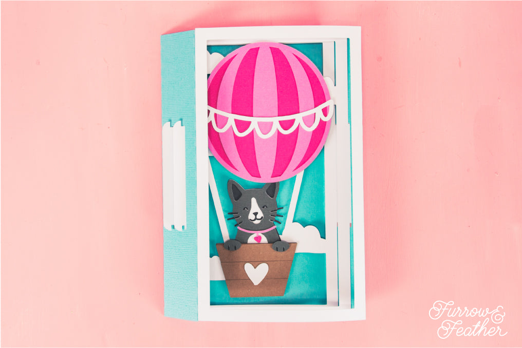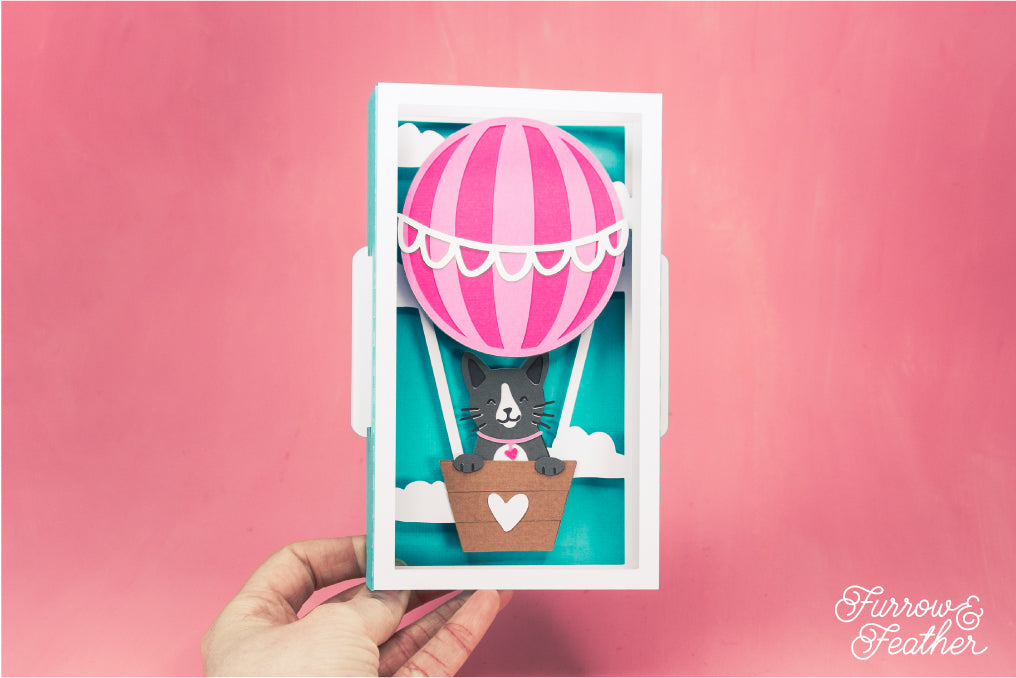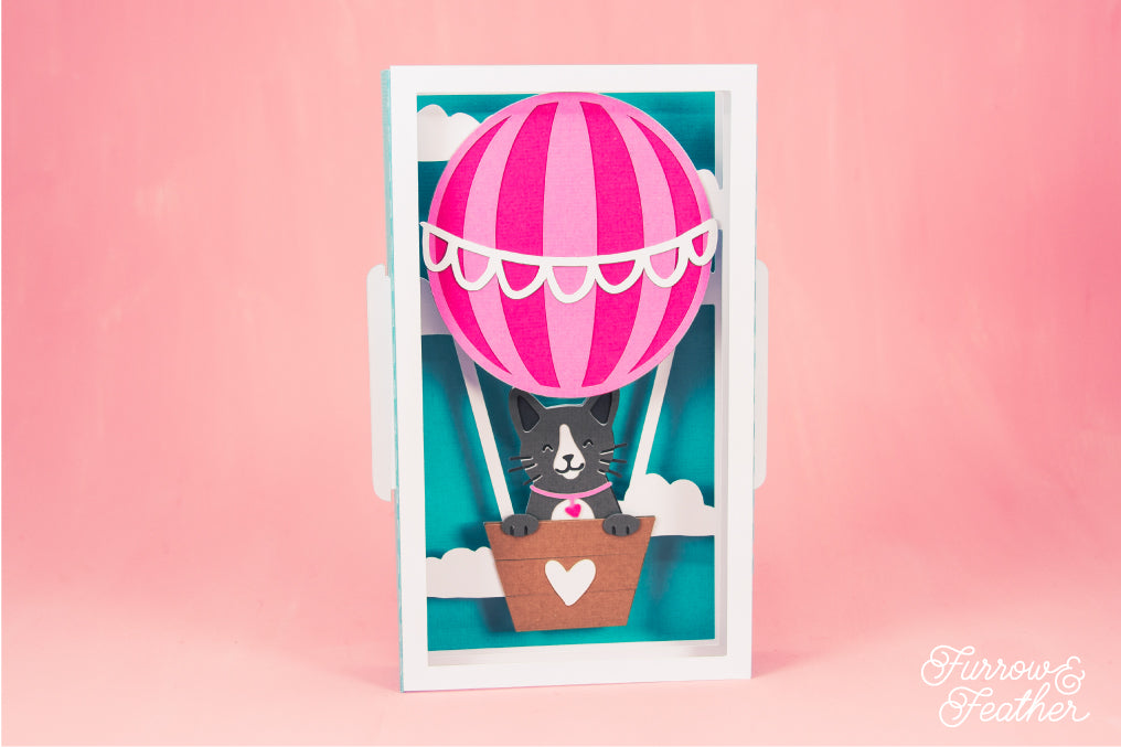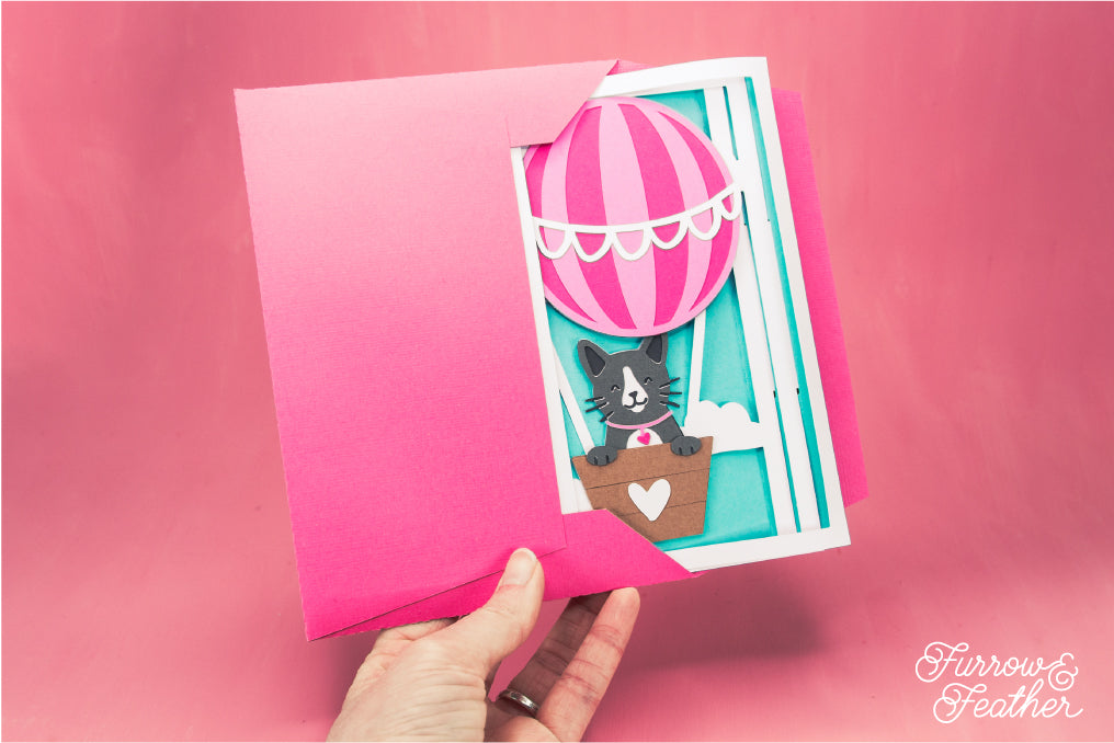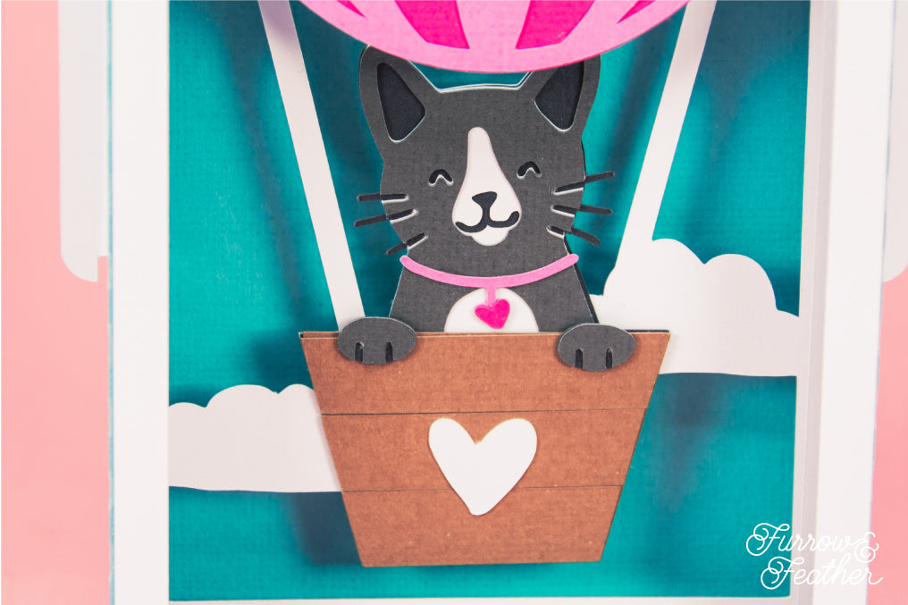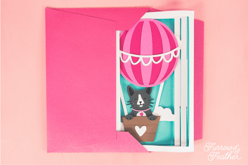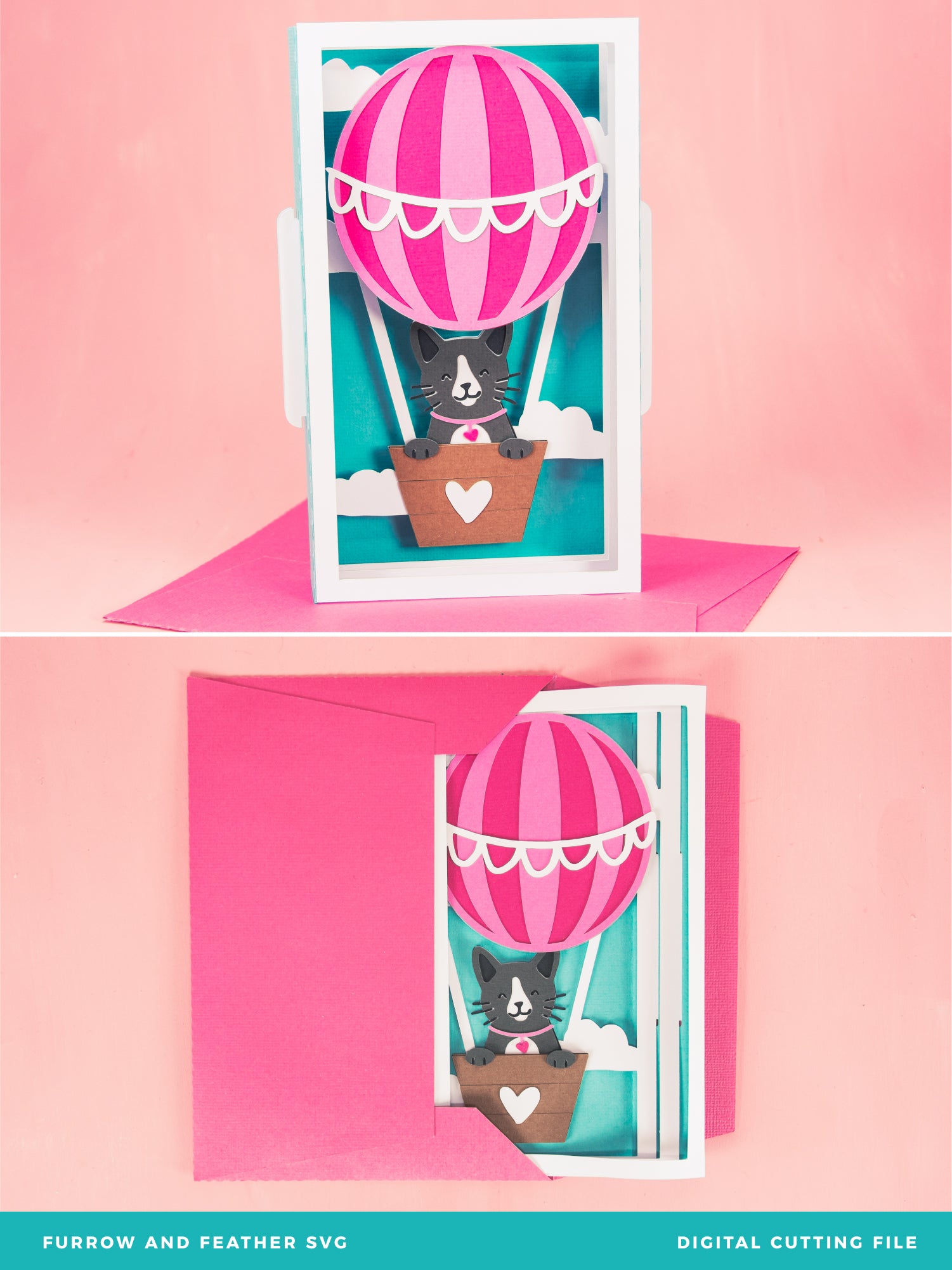 Create a super cute Valentine's Card with this Cat Hot Air Balloon - Valentine's Day Card SVG! Featuring a hot air balloon with a kitty passenger, this cutting file is perfect for Cricut and Silhouette cutting machines. Change the color of the balloon or the cat for a more unique look! It folds flat for easy mailing and fits perfectly in the included 5x7” envelope cut file. Explore more of my Valentine's Day card designs for even more cute and creative ideas!