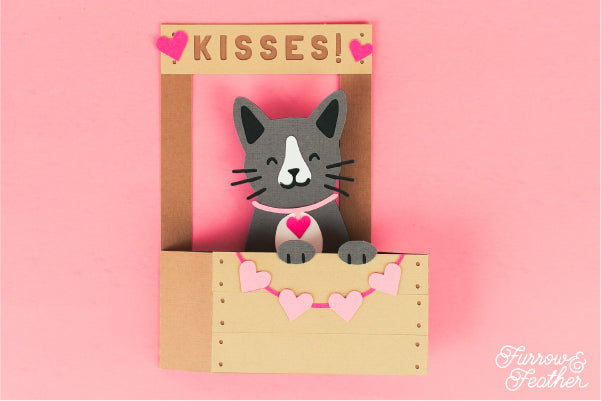 Such a cute & easy card! Change the colors of the kitty to match your own furry friend, or draw on stripes! This card is great for Valentines Day, Anniversaries, Birthdays or to welcome a new pet to the family. Folds flat to fit in the included 5x7” envelope cut file.