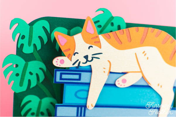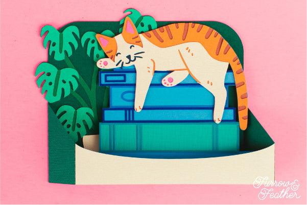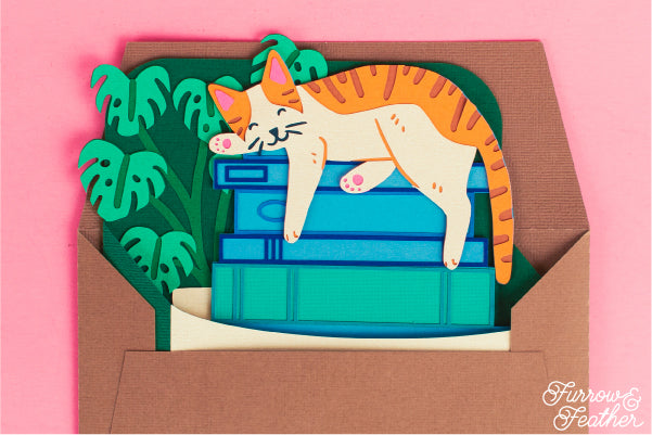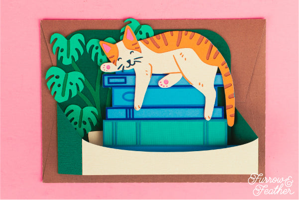 Such a fun card for your favorite reader or cat person! Change the color of the kitty to customize the card. Add your own book titles with a sketch pen! Folds flat to fit in the included 5x7” envelope cut file. Includes a white piece for the back so you can write a note.