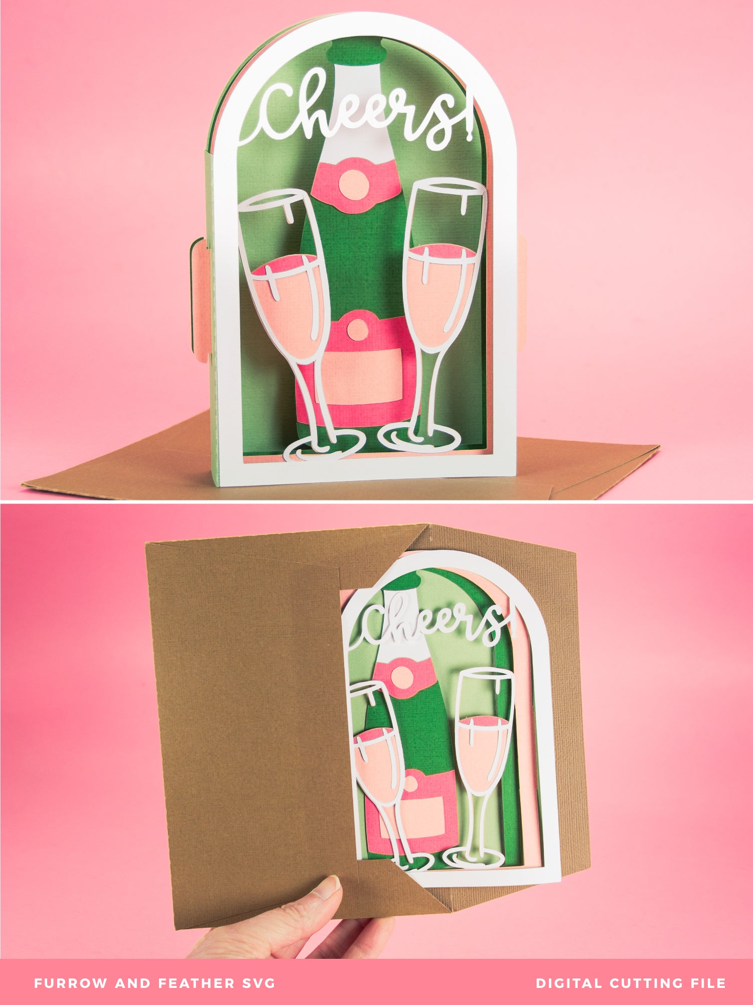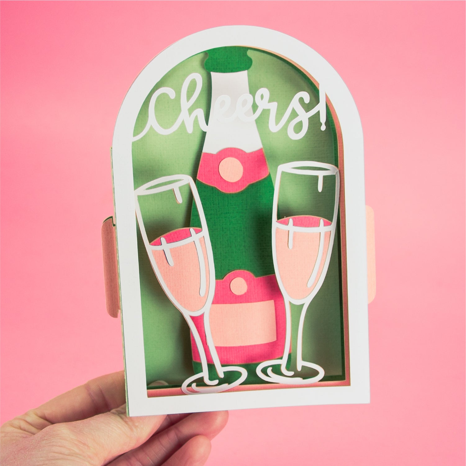 Create a super fun card with this Cheers! Champagne Flutes Card - a 3D Congratulations Card SVG! I love this card for an engagement, a new job, a graduation, a new home, or anything to celebrate! This design features a champagne bottle with two champagne flutes, and the word 'Cheers!' on the front piece. This cutting file is perfect for Cricut and Silhouette cutting machines. The card folds flat for easy mailing and fits perfectly in the included 5x7” envelope cut file. Explore more of my card designs for even more cute and creative ideas!