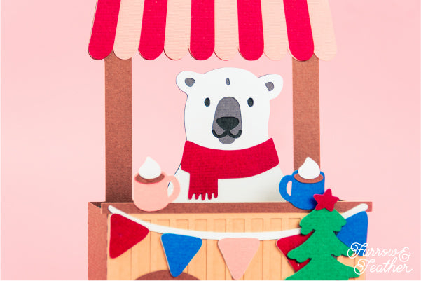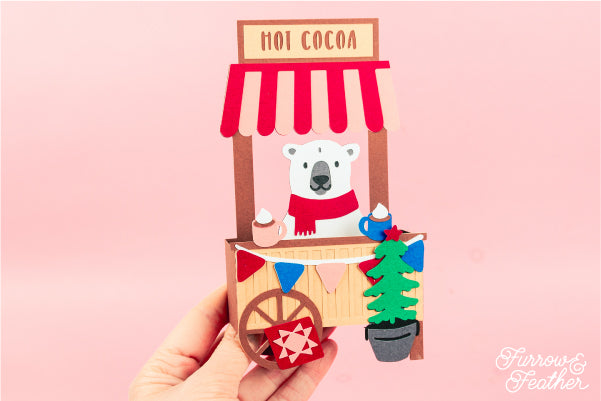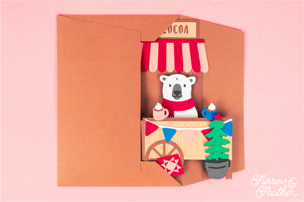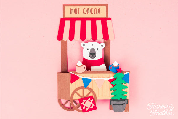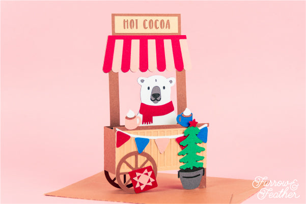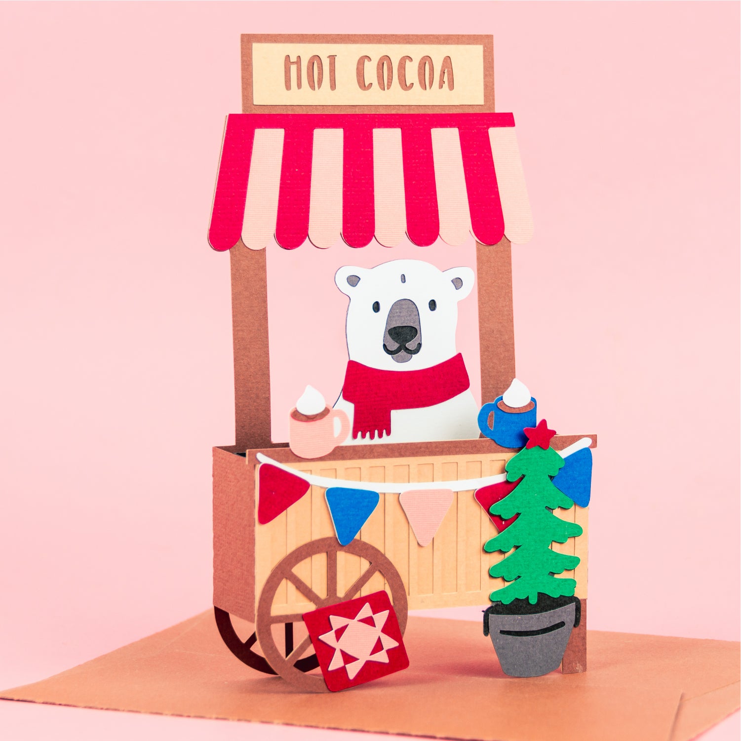 An adorable card for Christmas or the holidays! Features a cute polar bear selling cocoa. Folds flat to fit in the included 5x7” envelope cut file.