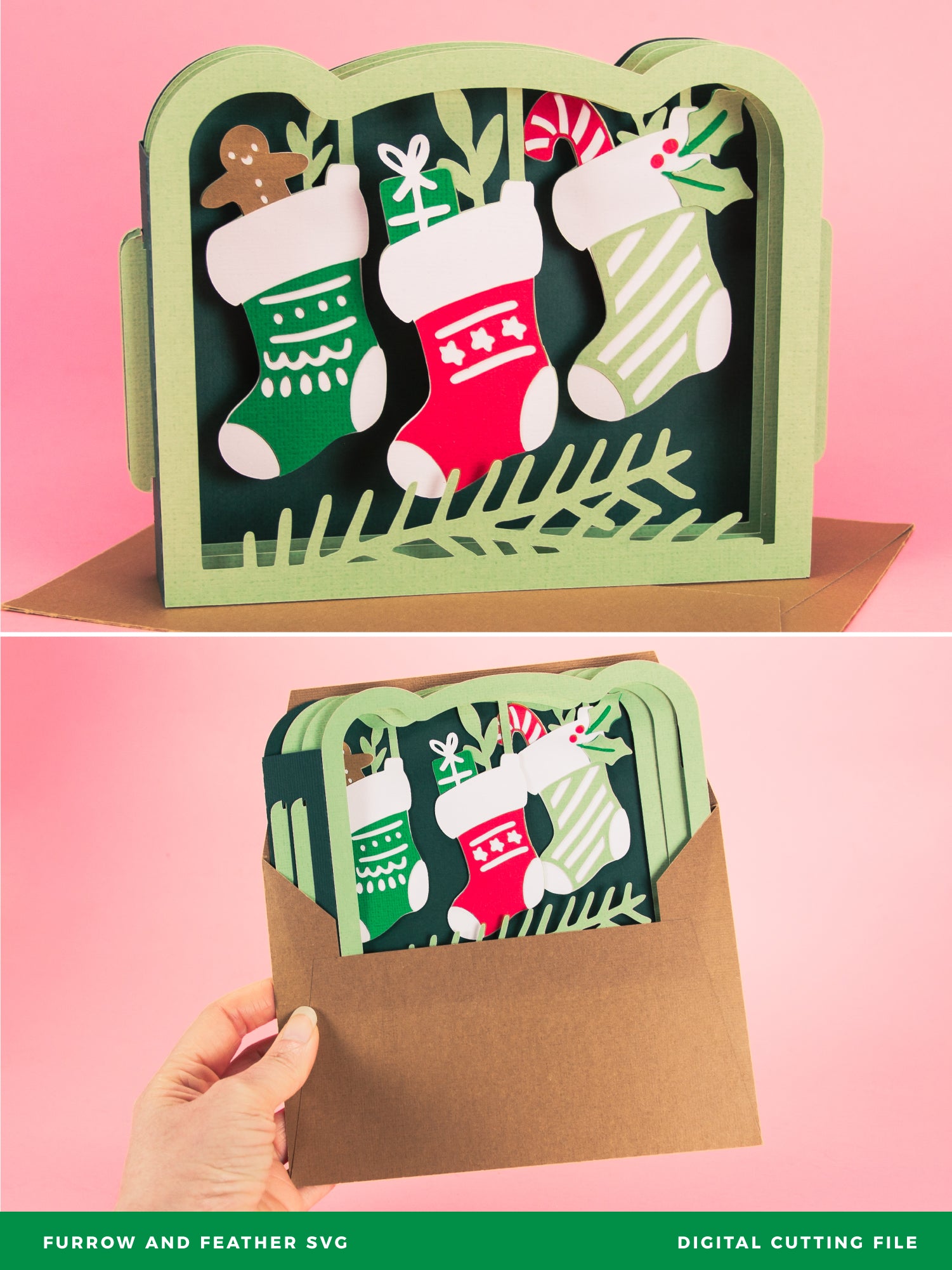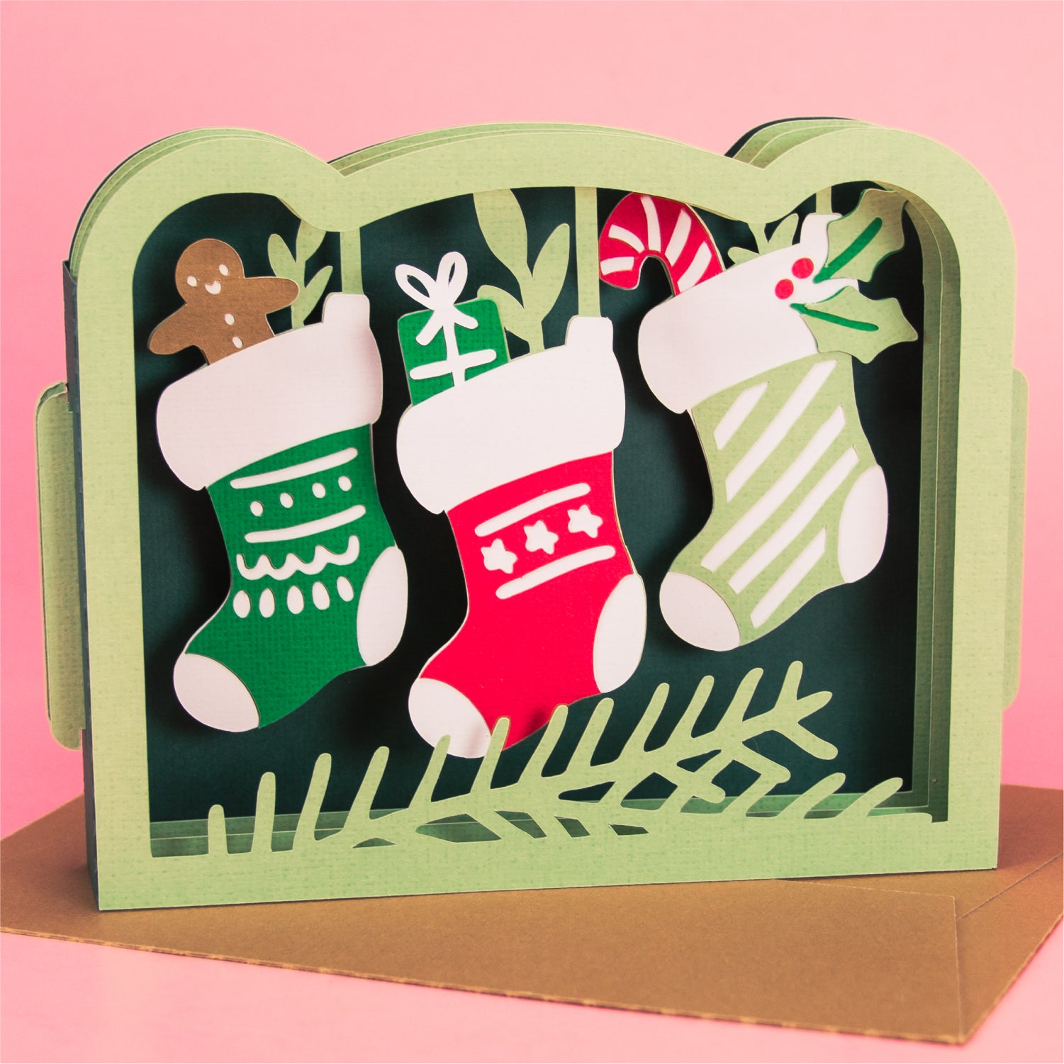 Create a super sweet card for Christmas with this Christmas Stockings card design - a 3D Christmas card SVG! This is a layered design, with three colorful stockings full of holiday goodies! I love updating the cardstock colors for the stockings! This cutting file is perfect for Cricut and Silhouette cutting machines. The card folds flat for easy mailing and fits perfectly in the included 5x7” envelope cut file. Explore more of my card designs for even more cute and creative Christmas papercraft ideas!