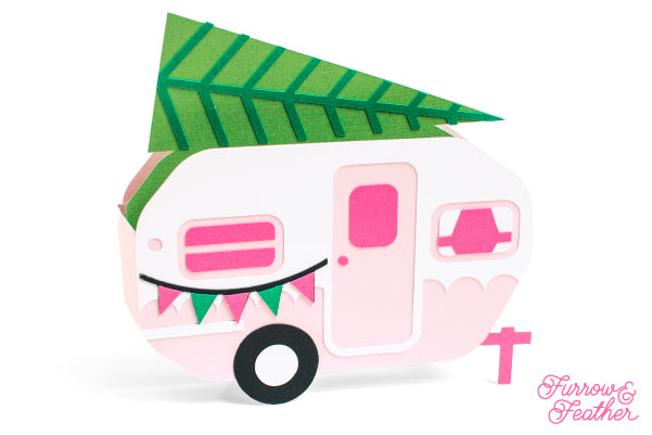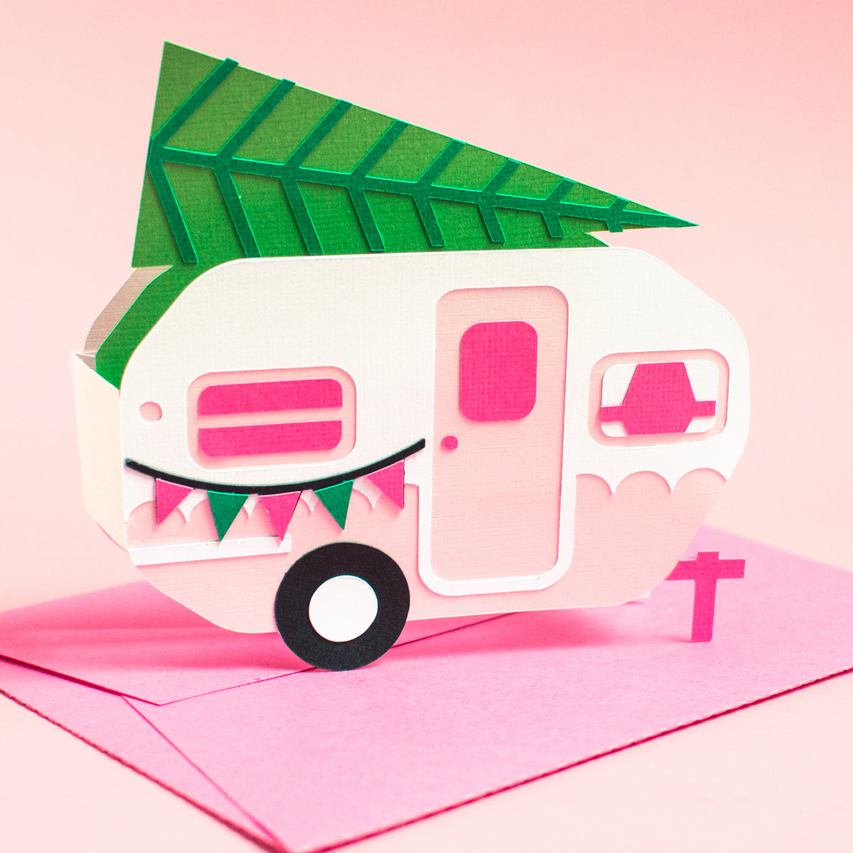 I love this fun Christmas card! It’s super easy to put together. Use patterned paper for the camper to get a unique look. Add ornaments to the tree! You can add your own sentiment to the front. Folds flat to fit in the included 5x7” envelope cut file.