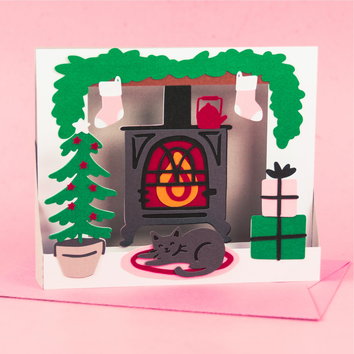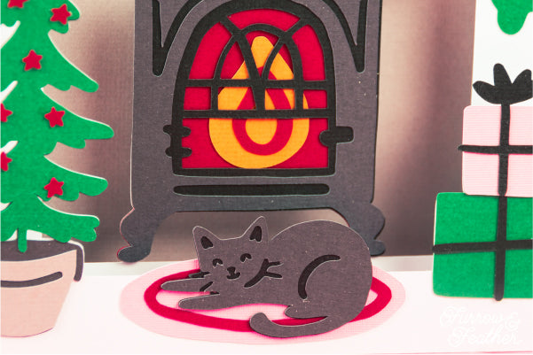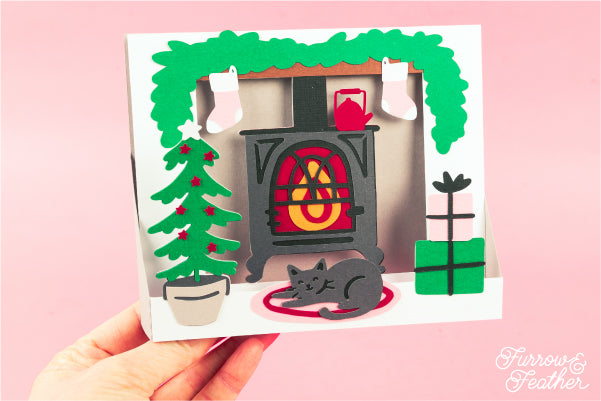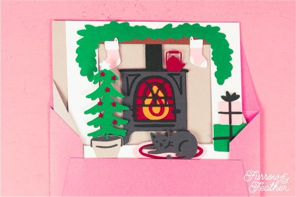 The coziest card for the holidays! Change the color of the kitty to match your own. Add initials to the stockings! Folds flat to fit in the included 5x7” envelope cut file.