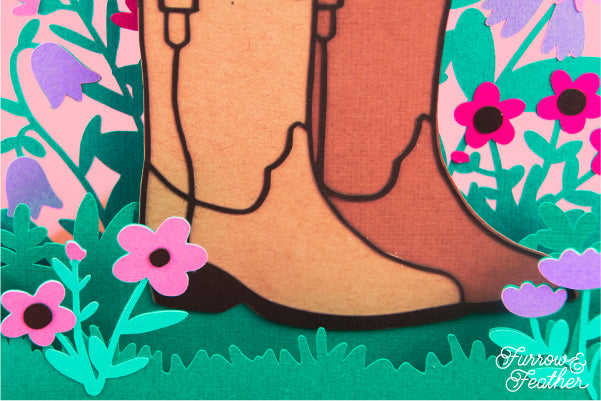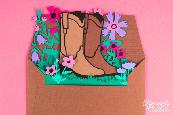 The cutest card for your favorite western cowgirl! Change the colors of the flowers to really customize the card. Or, use colored pencils to add details to the cowgirl boots! Folds flat to fit in the included 5x7” envelope cut file.