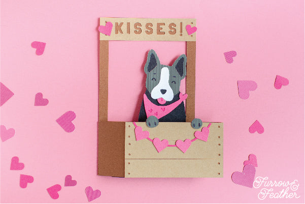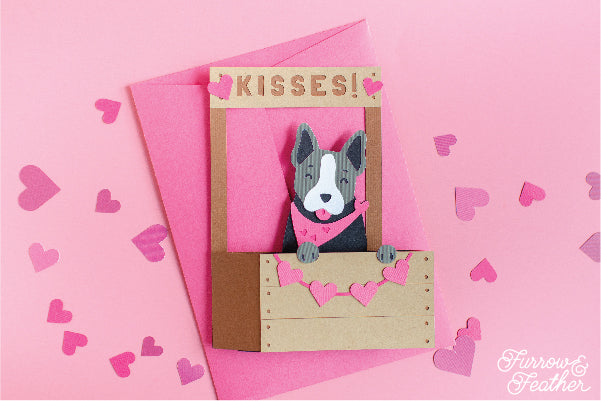 I love this card! Change the colors of the dog to match your own furry friend. This pup could work for a pittie, a boston terrier, a french bulldog or other breed! This card is great for Valentines Day, Anniversaries, Birthdays or to welcome a new pet to the family. Folds flat to fit in the included 5x7” envelope cut file.