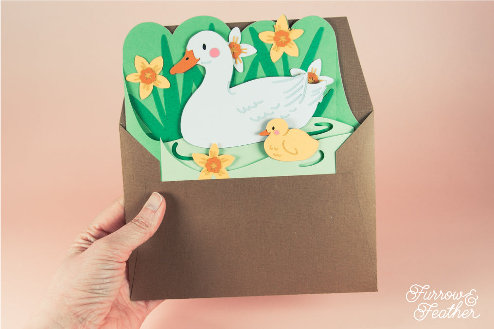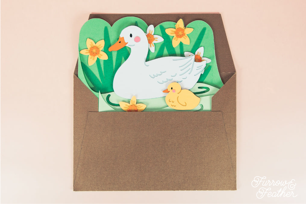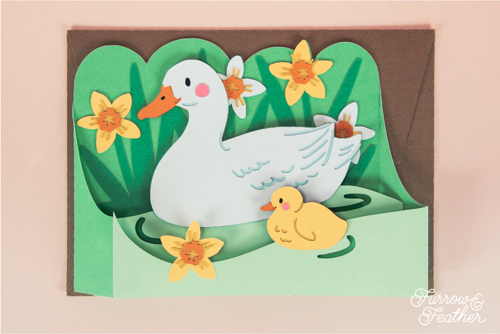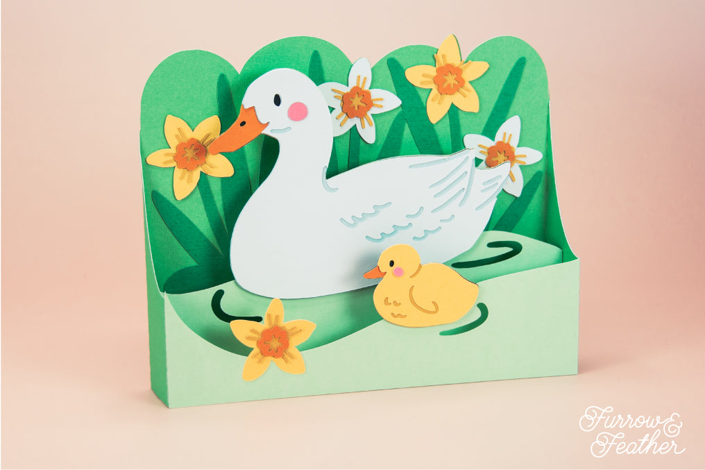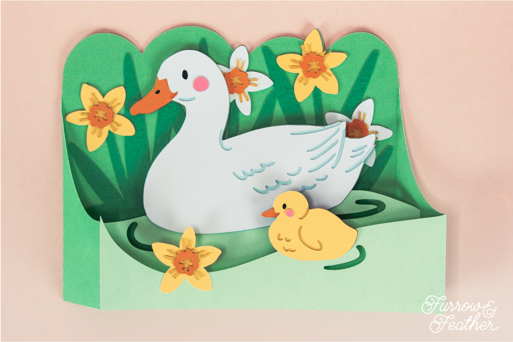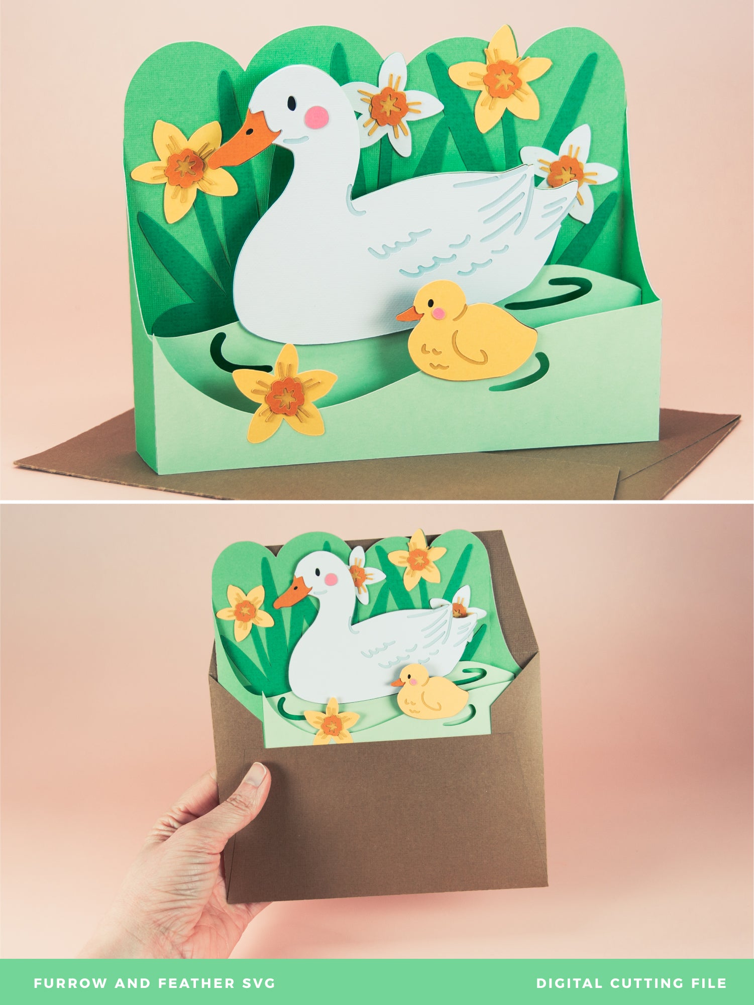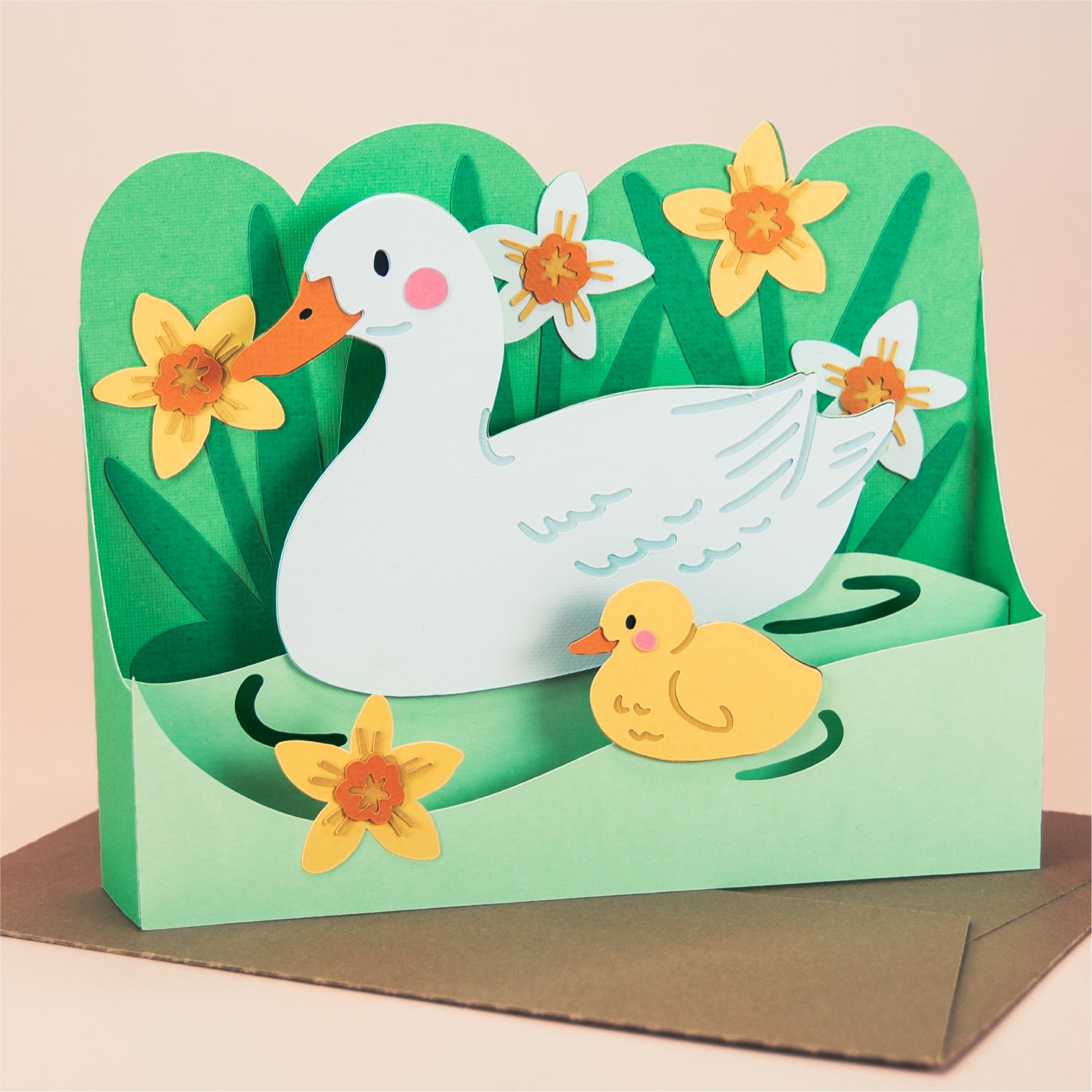 Create a super fun card with this Duck & Duckling Card - a 3D Easter Card SVG! I love this card for Easter, a baby shower, or for Mother's Day! Featuring a mama duck with a duckling, as well as daffodils, this cutting file is perfect for Cricut and Silhouette cutting machines. The card folds flat for easy mailing and fits perfectly in the included 5x7” envelope cut file. Add as many ducklings as you'd like! Explore more of my birthday card designs for even more cute and creative ideas!
