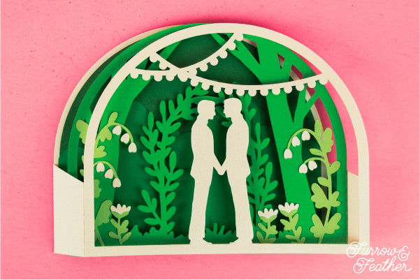 A beautiful card for your favorite couple. This card is super simple and uses only a handful of cardstock colors. Change the color of the flowers to customize the card, or add your own sentiment! Folds flat to fit in the included 5x7” envelope cut file.