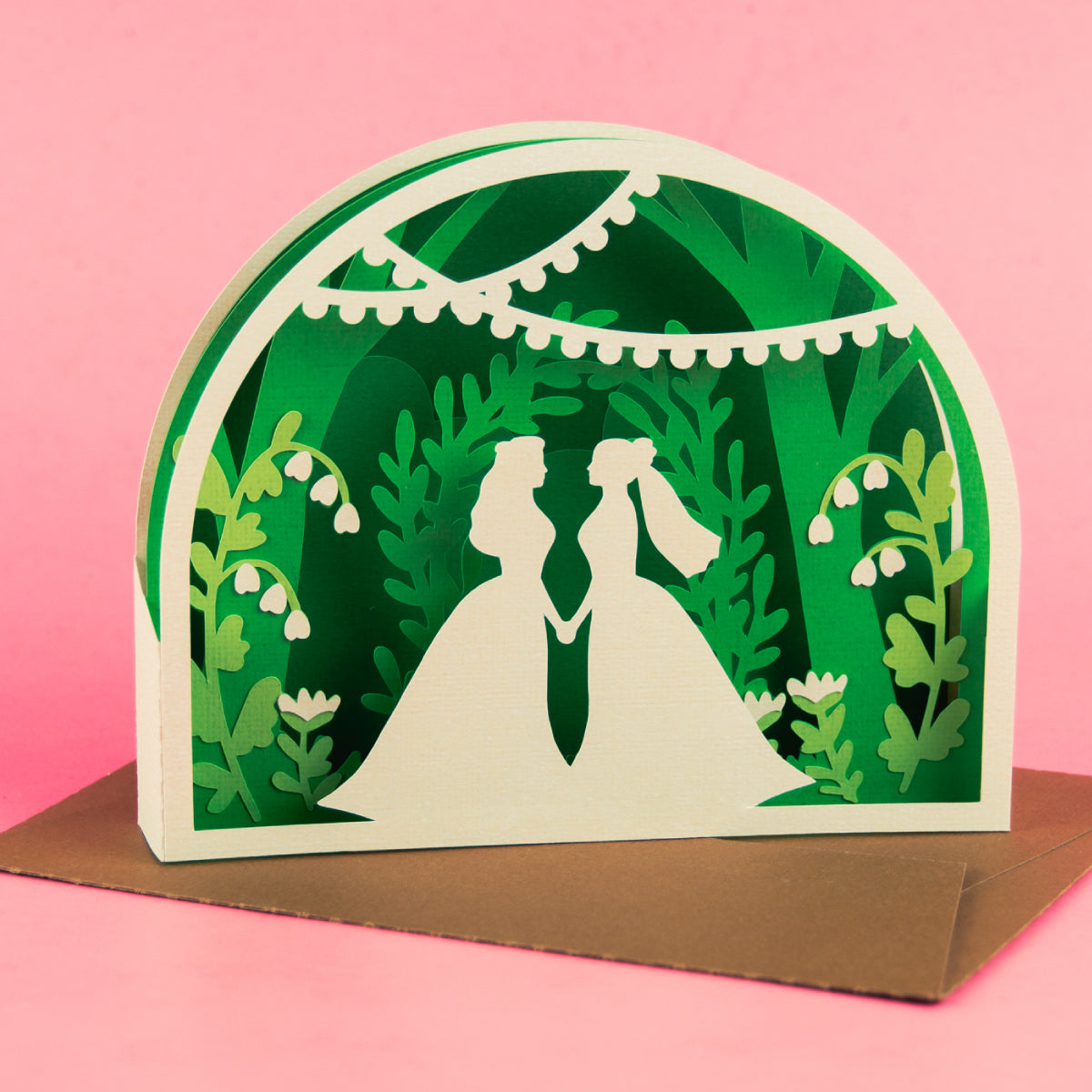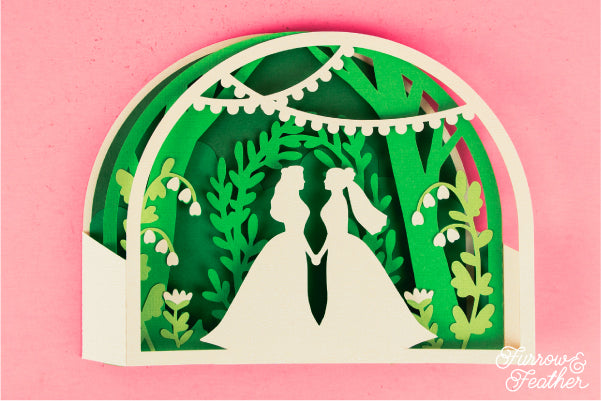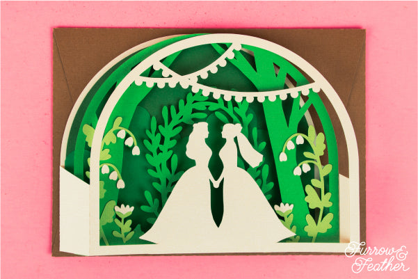 A beautiful card for your favorite couple. This card is super simple and uses only a handful of cardstock colors. Change the color of the flowers to customize the card, or add your own sentiment! Folds flat to fit in the included 5x7” envelope cut file.