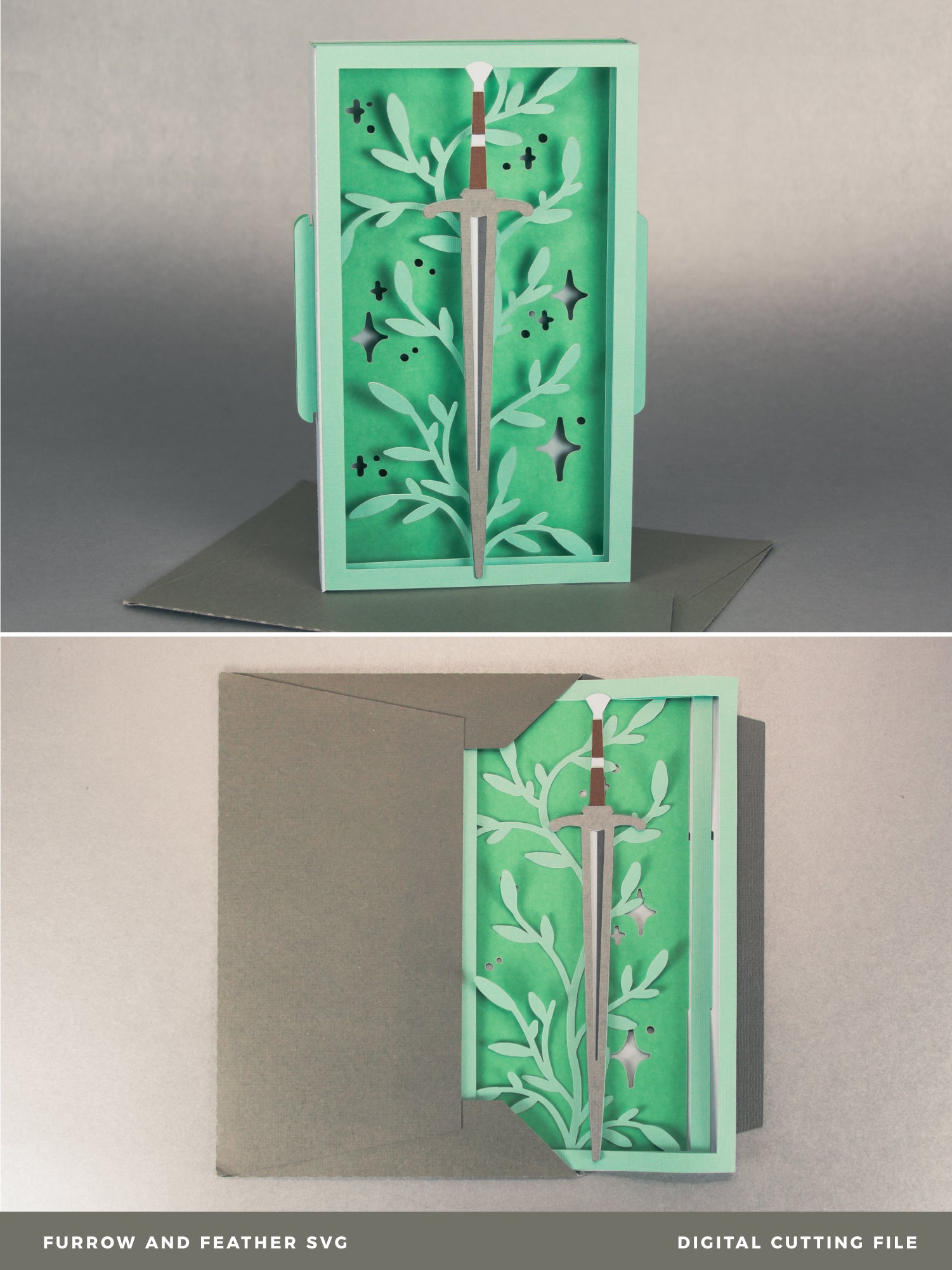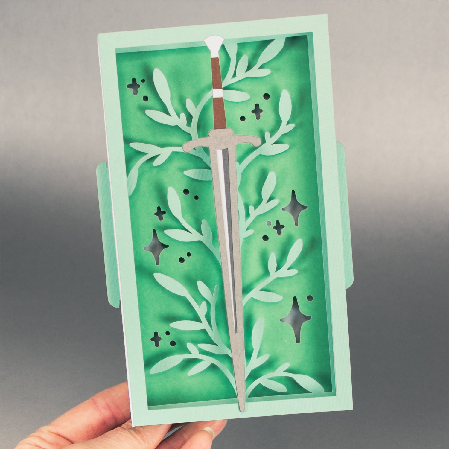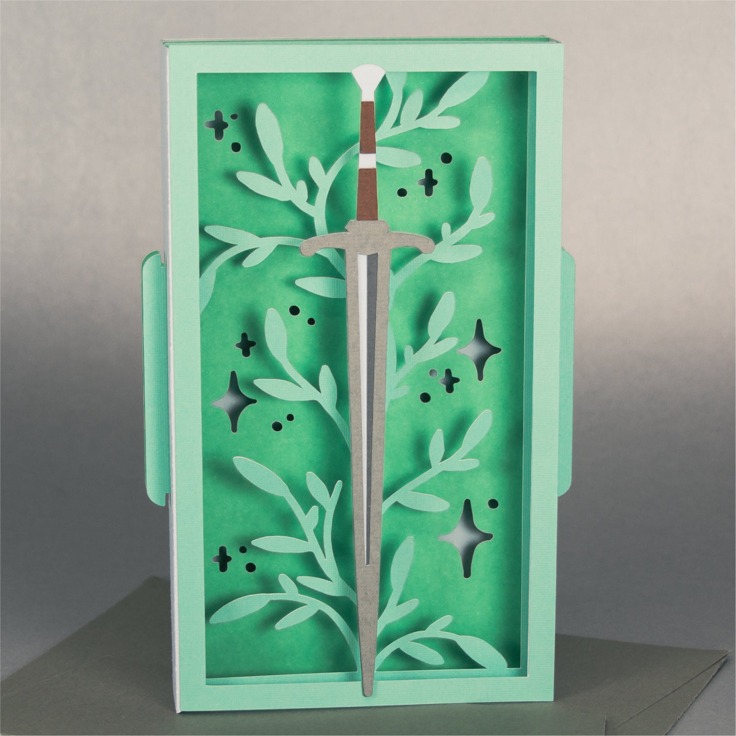 Create a magical card with this Fantasy Sword Card - a 3D any occasion card SVG! I love this card design for a reader, a fantasy nerd, or a D&D player! It works great for a birthday, as a congratulations card, or for any occasion. This design features a sword surrounded by leaves and stars. This cutting file is perfect for Cricut and Silhouette cutting machines. The card folds flat for easy mailing and fits perfectly in the included 5x7” envelope cut file. Explore more of my card designs for even more cute and creative ideas!