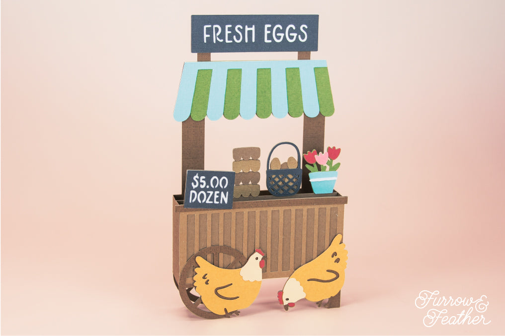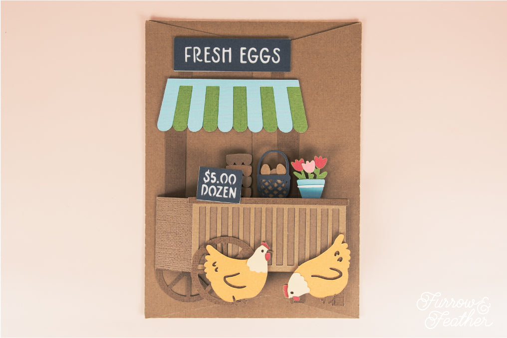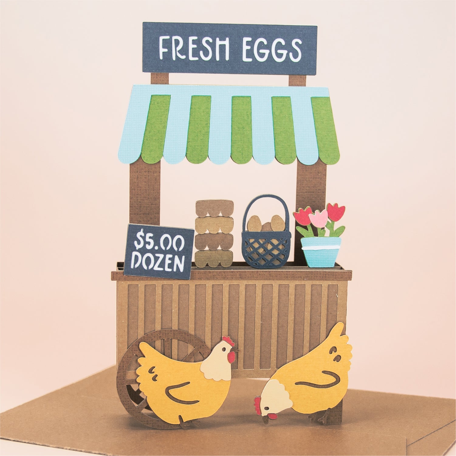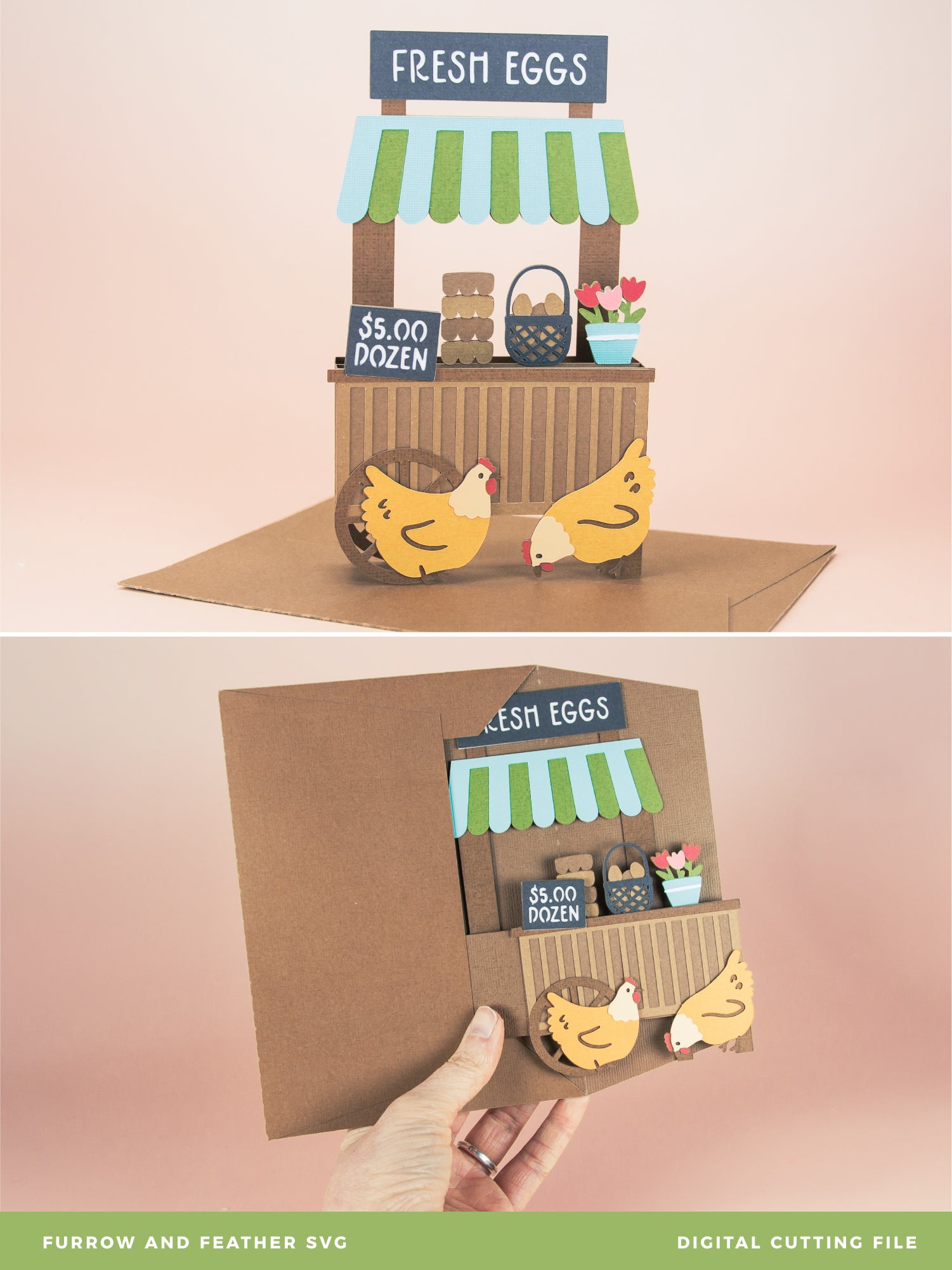 Create an a super fun card with this Fresh Eggs Stand Card - a 3D Card SVG! Featuring an egg stand with some chickens, this cutting file is perfect for Cricut and Silhouette cutting machines. The card folds flat for easy mailing and fits perfectly in the included 5x7” envelope cut file. Change the color of the awning and chickens for a more customized look! Explore more of my birthday card designs for even more cute and creative ideas!