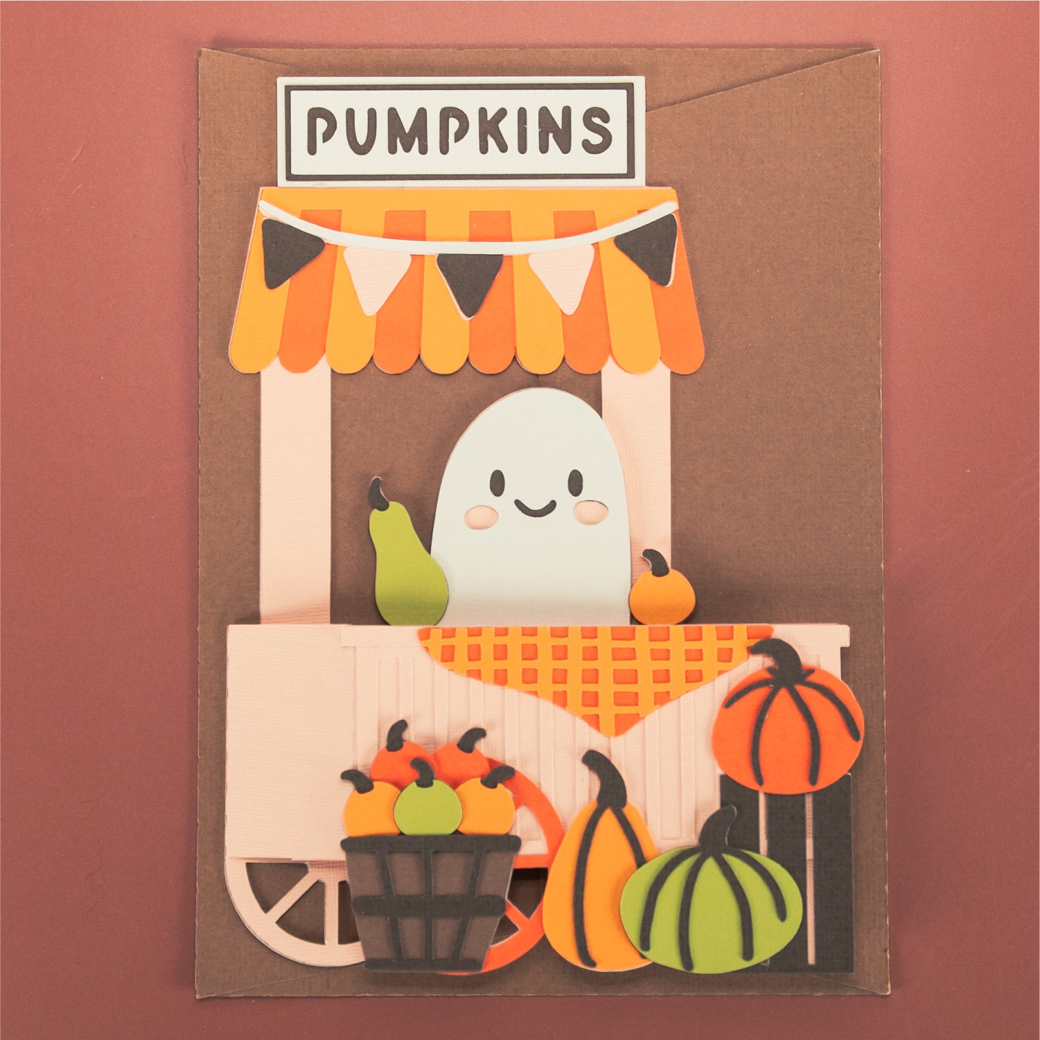 Create the cutest fall & Halloween themed card with this Ghost Pumpkin Stand card design - a 3D autumn card SVG! This design features a ghost selling farm fresh pumpkins from a cart. I love updating the cardstock color of the awning and bunting. Use plaid patterned cardstock! This cutting file is perfect for Cricut and Silhouette cutting machines. The card folds flat for easy mailing and fits perfectly in the included 5x7” envelope cut file. Explore more of my card designs for even more cute and creative papercraft ideas!