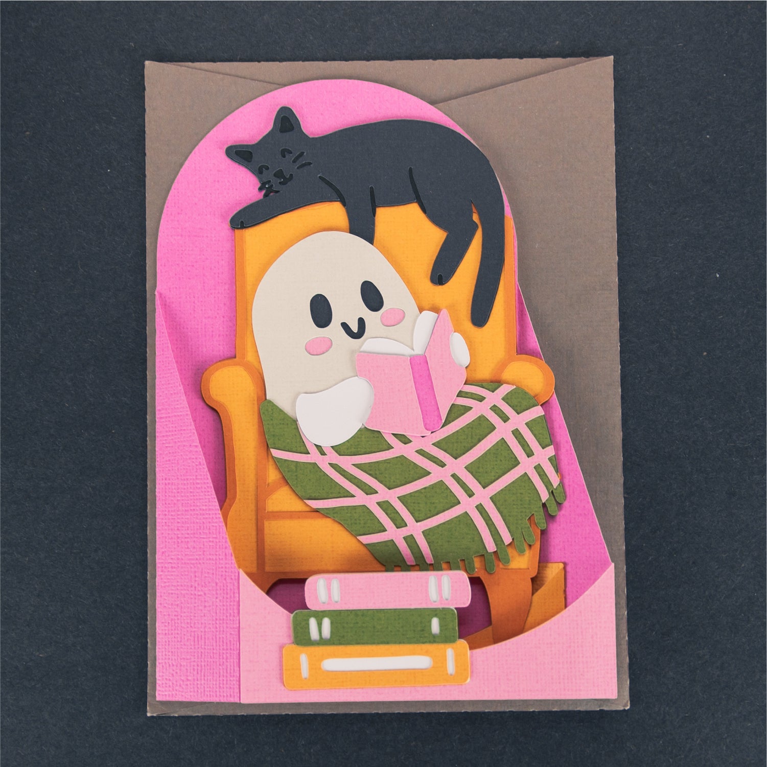 Create an adorable Halloween card with this Ghost Reading in a Chair card design - a 3D Halloween SVG! This design features a cute ghost reading a book in a comfy arm chair. There's a black cat sleeping on top of the chair, and the ghost is wrapped up in a cozy plaid quilt. I love updating the cardstock colors of the book pieces and background! This cutting file is perfect for Cricut and Silhouette cutting machines. The card folds flat for easy mailing and fits perfectly in the included 5x7” envelope cut file. Explore more of my card designs for even more cute and creative Halloween papercraft ideas!