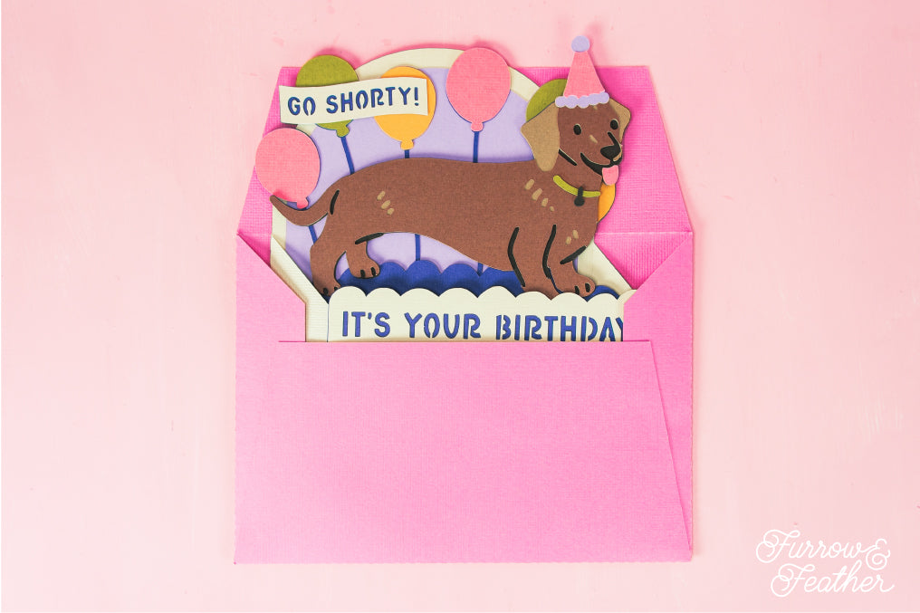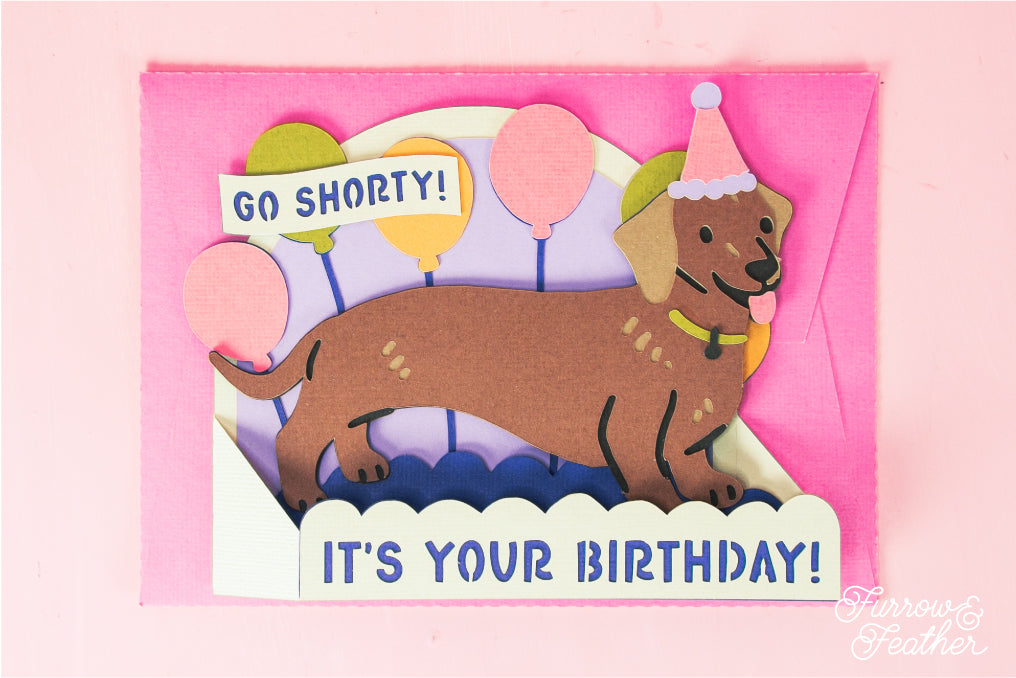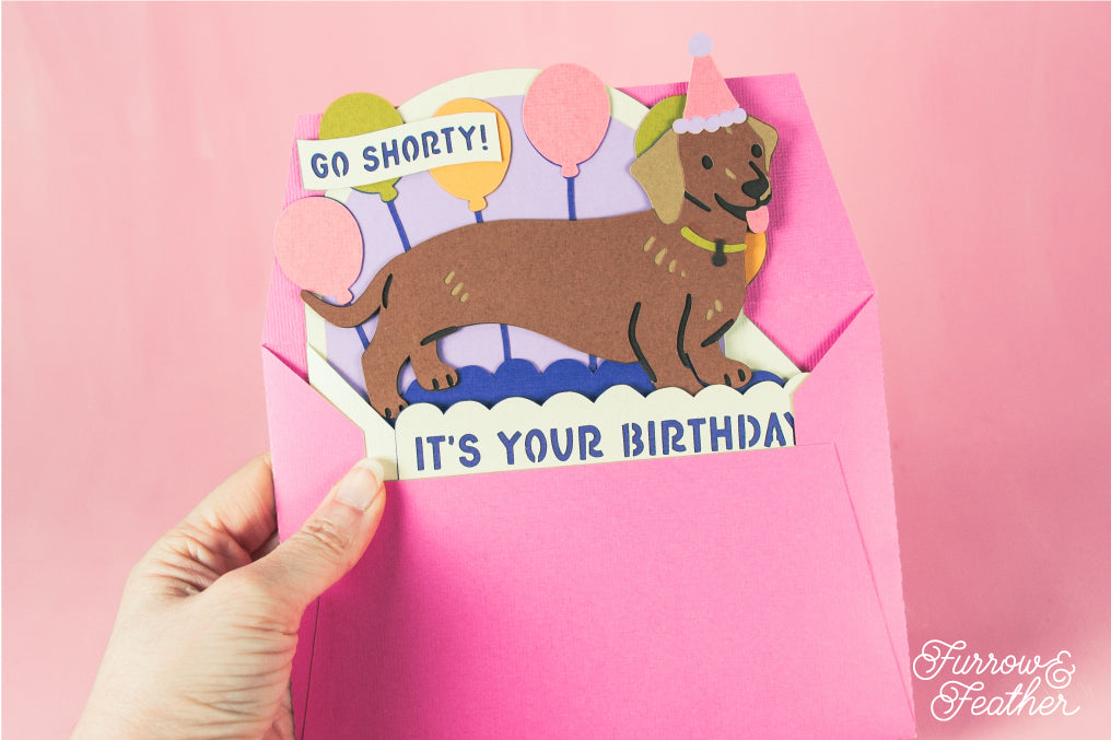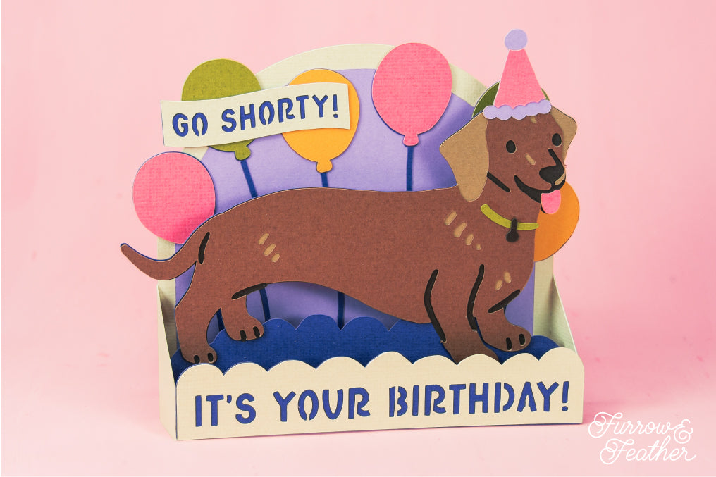 Create an adorable birthday card with this 'Go Shorty, It's Your Birthday' - Dachshund Birthday Card SVG! This file includes optional numbers for the balloons, and a plain 'front piece' if you want to include your own phrase. Featuring an adorable wiener dog puppy in front of some colorful balloons, this card is perfect for Cricut and Silhouette cutting machines. This design folds flat for easy mailing and fits perfectly in the included 5x7” envelope cut file. Explore more of my birthday card designs for even more cute and unique crafting ideas!
