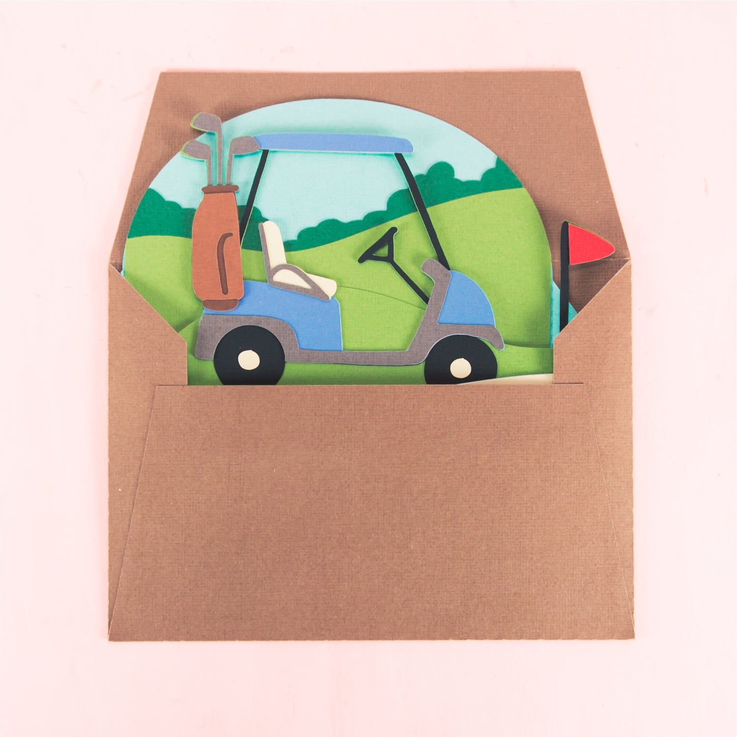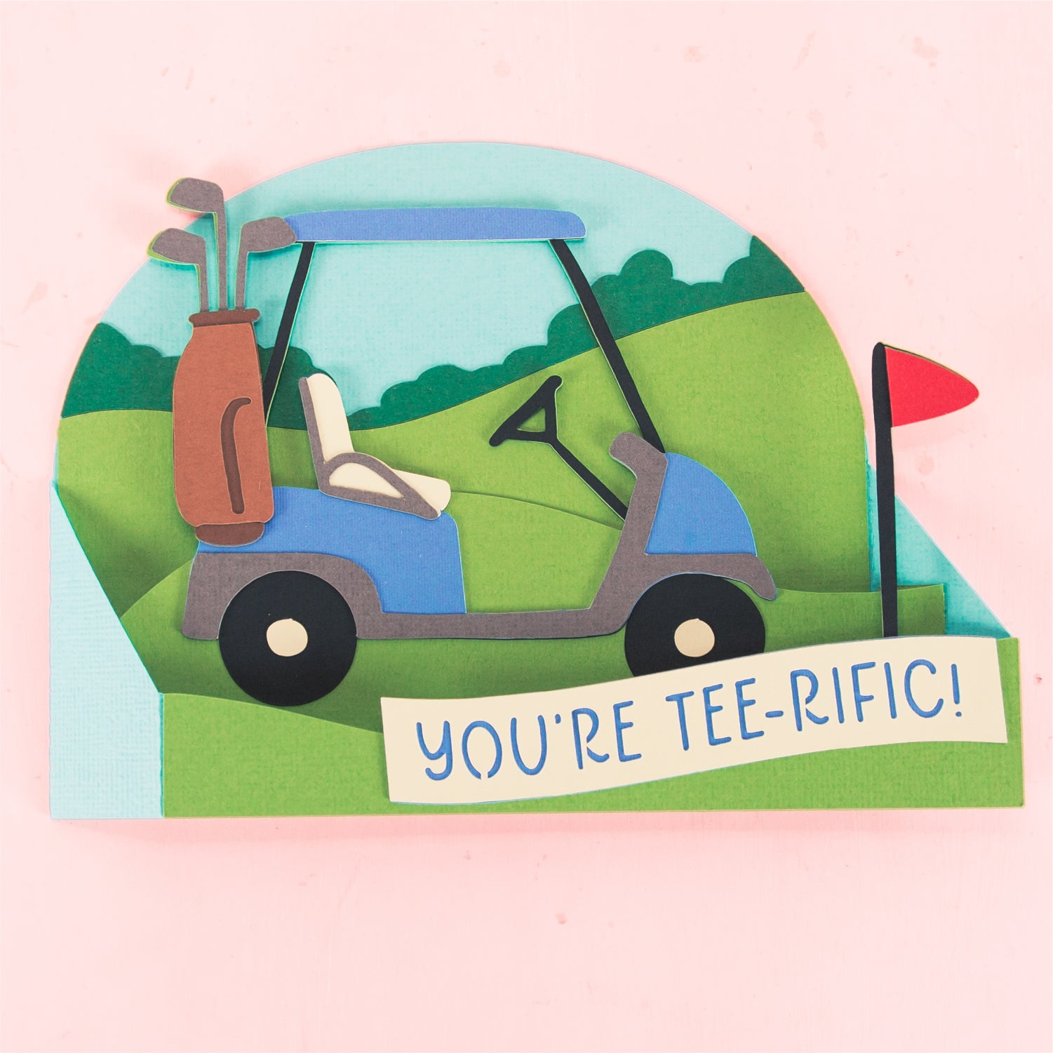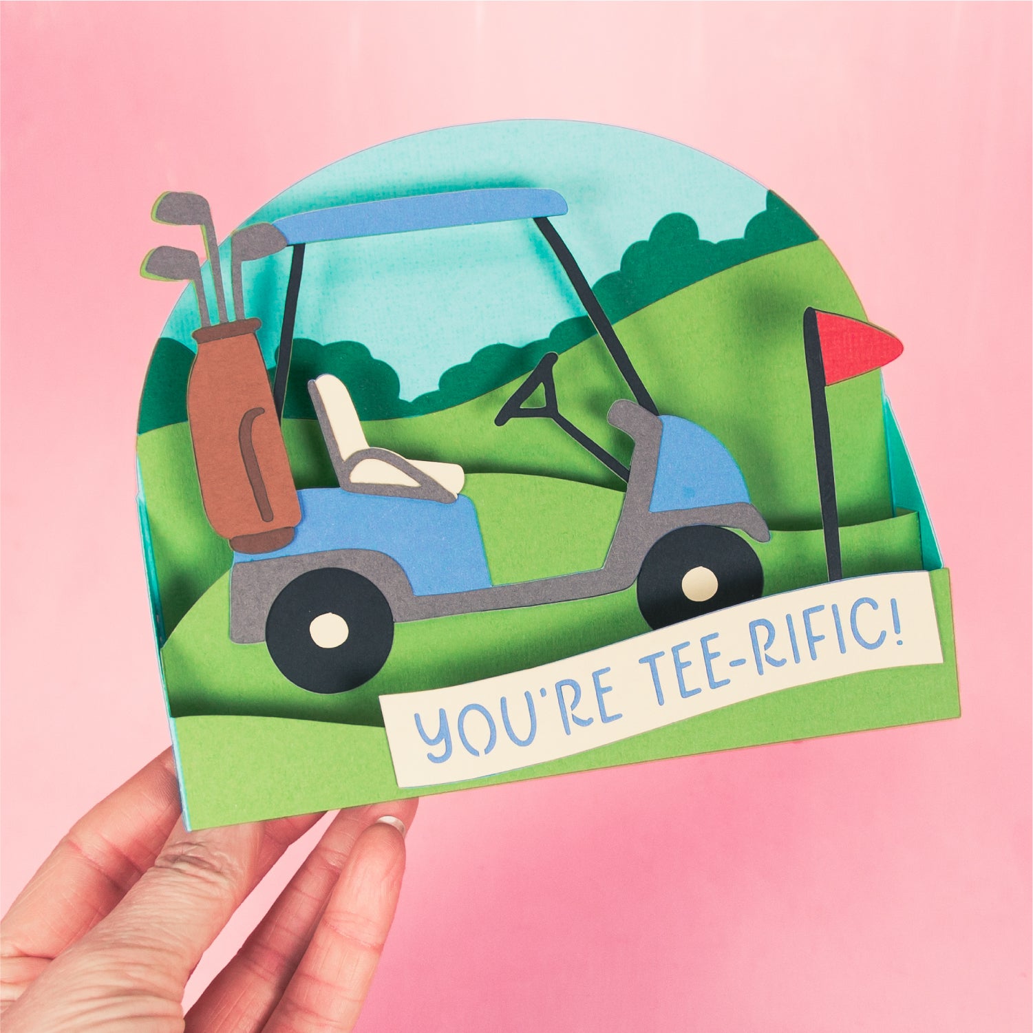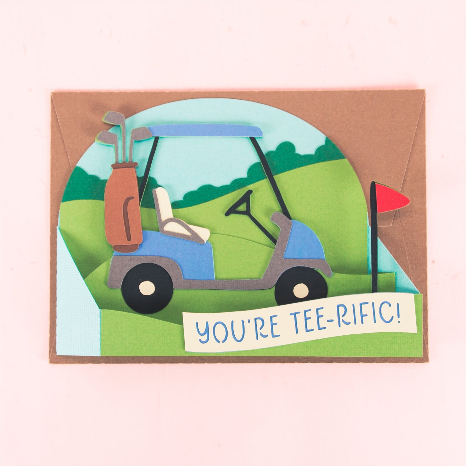 Create a super fun card for any occasion with this Golf Cart card - a 3D golfing card SVG! This is such a fun card for Father's Day, as a birthday card for grandpa, a thank you card, or for any occasion! Includes a the optional phrase 'You're Tee-Rific!'. This cutting file is perfect for Cricut and Silhouette cutting machines. The card folds flat for easy mailing and fits perfectly in the included 5x7” envelope cut file. Explore more of my card designs for even more cute and creative craft ideas!
