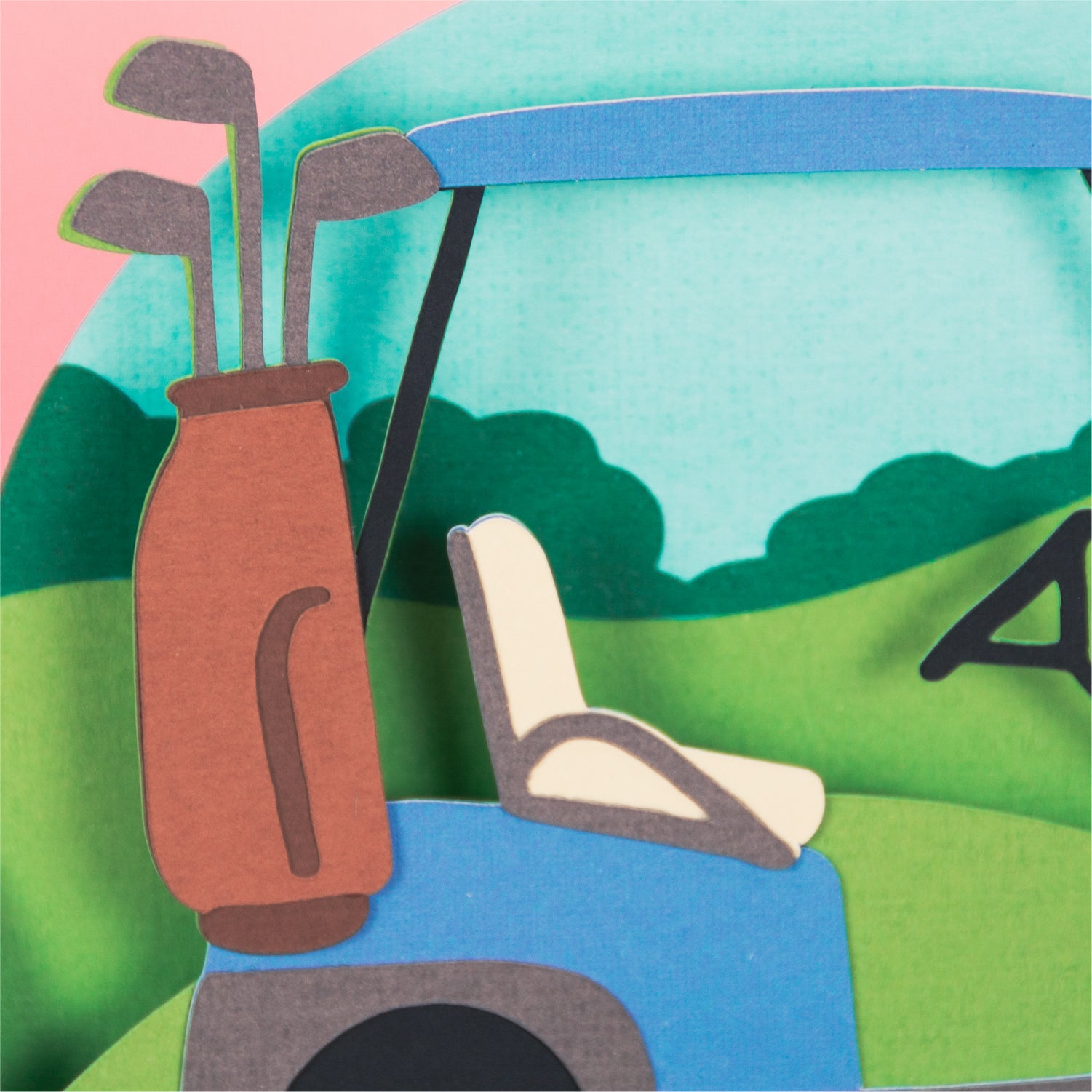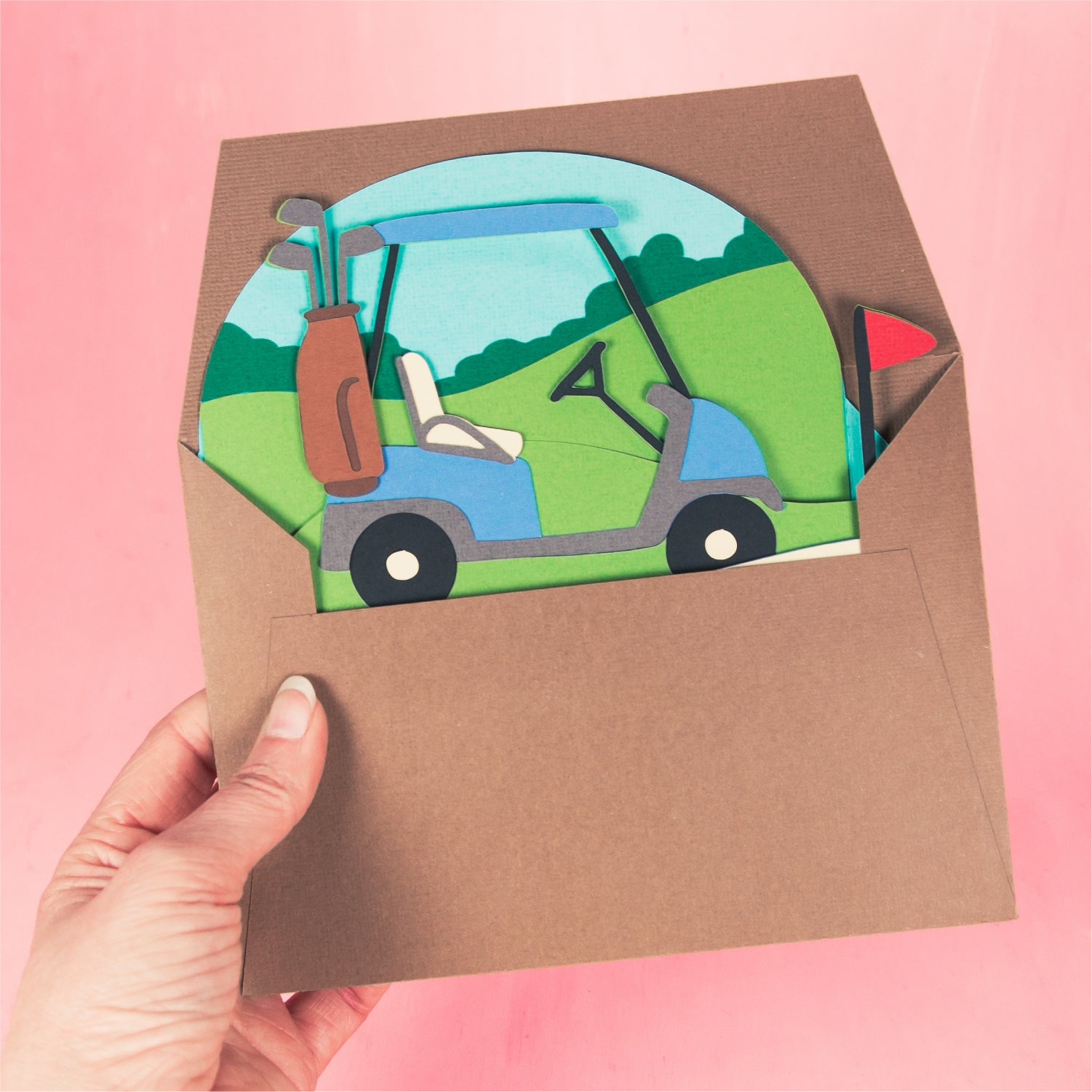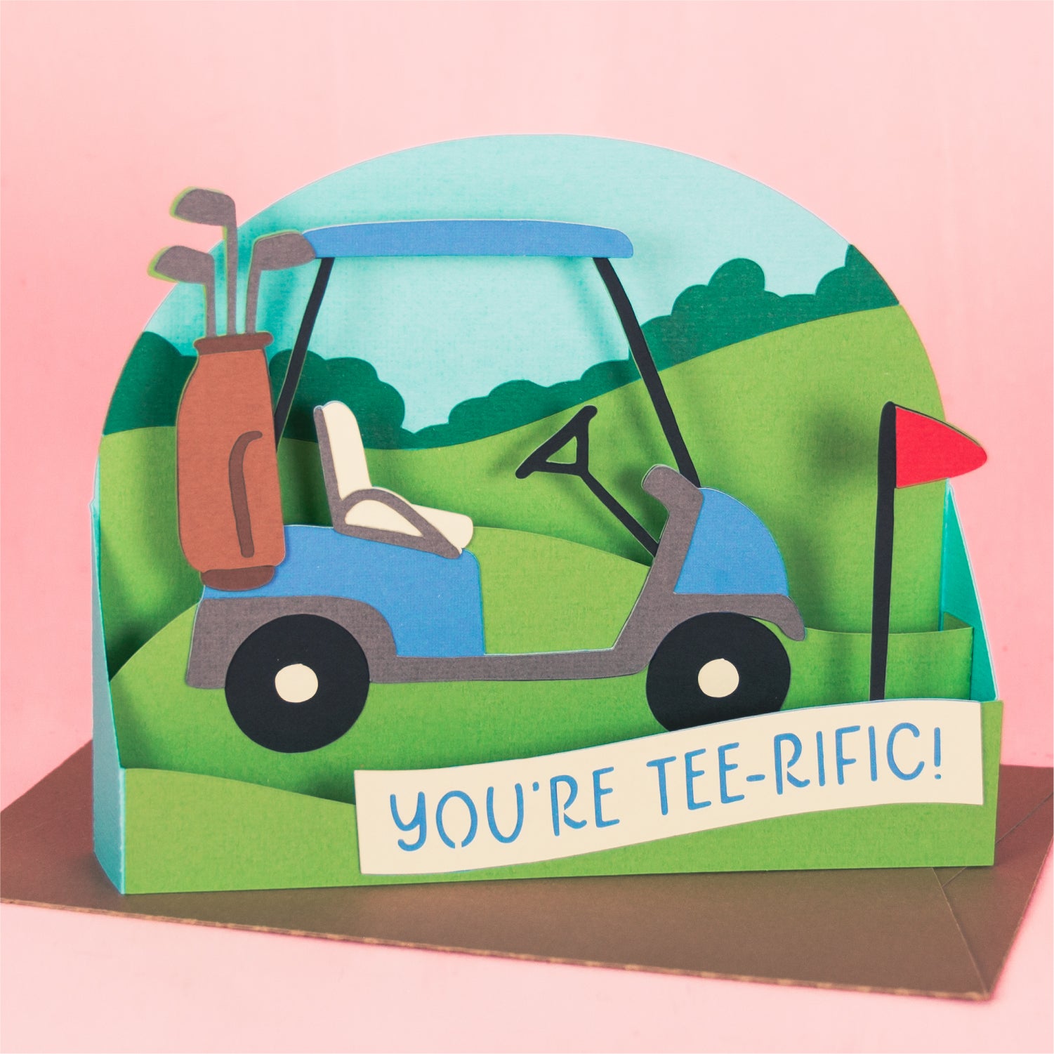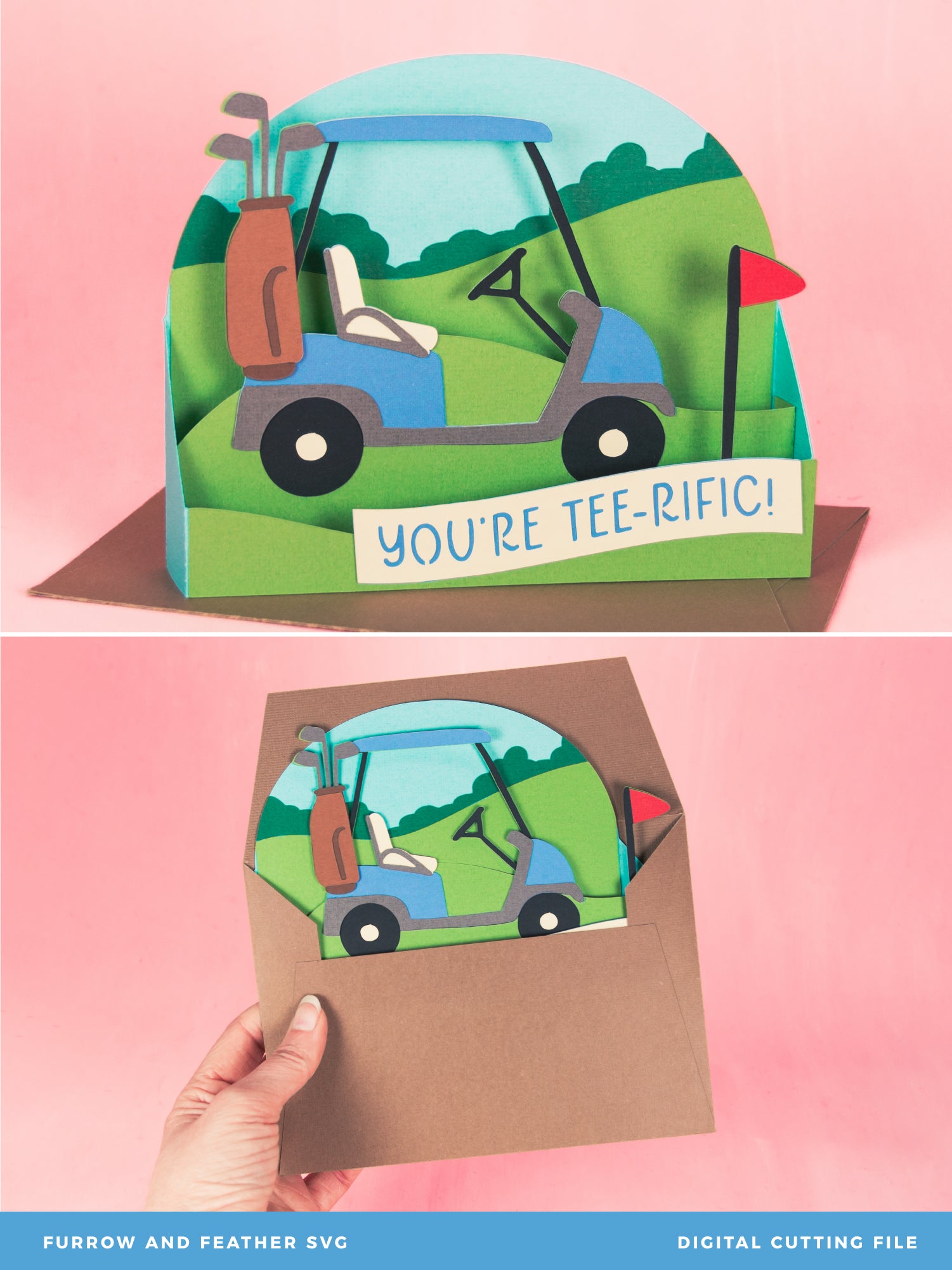 Create a super fun card for any occasion with this Golf Cart card - a 3D golfing card SVG! This is such a fun card for Father's Day, as a birthday card for grandpa, a thank you card, or for any occasion! Includes a the optional phrase 'You're Tee-Rific!'. This cutting file is perfect for Cricut and Silhouette cutting machines. The card folds flat for easy mailing and fits perfectly in the included 5x7” envelope cut file. Explore more of my card designs for even more cute and creative craft ideas!