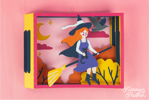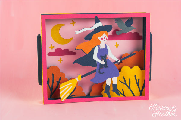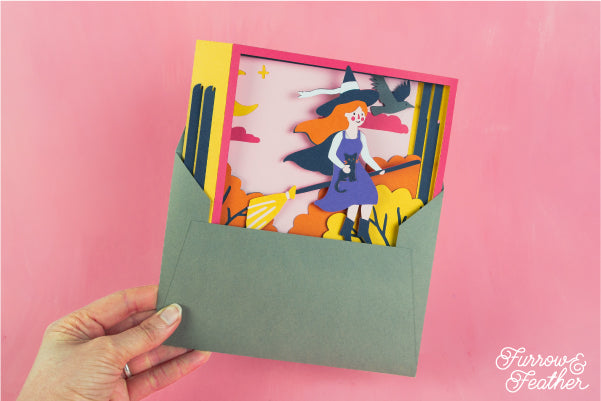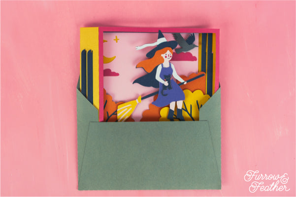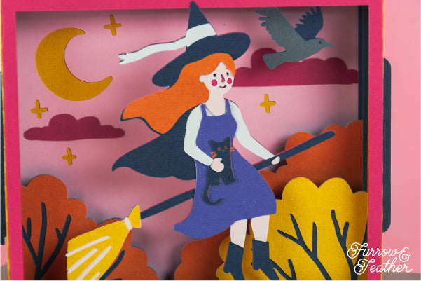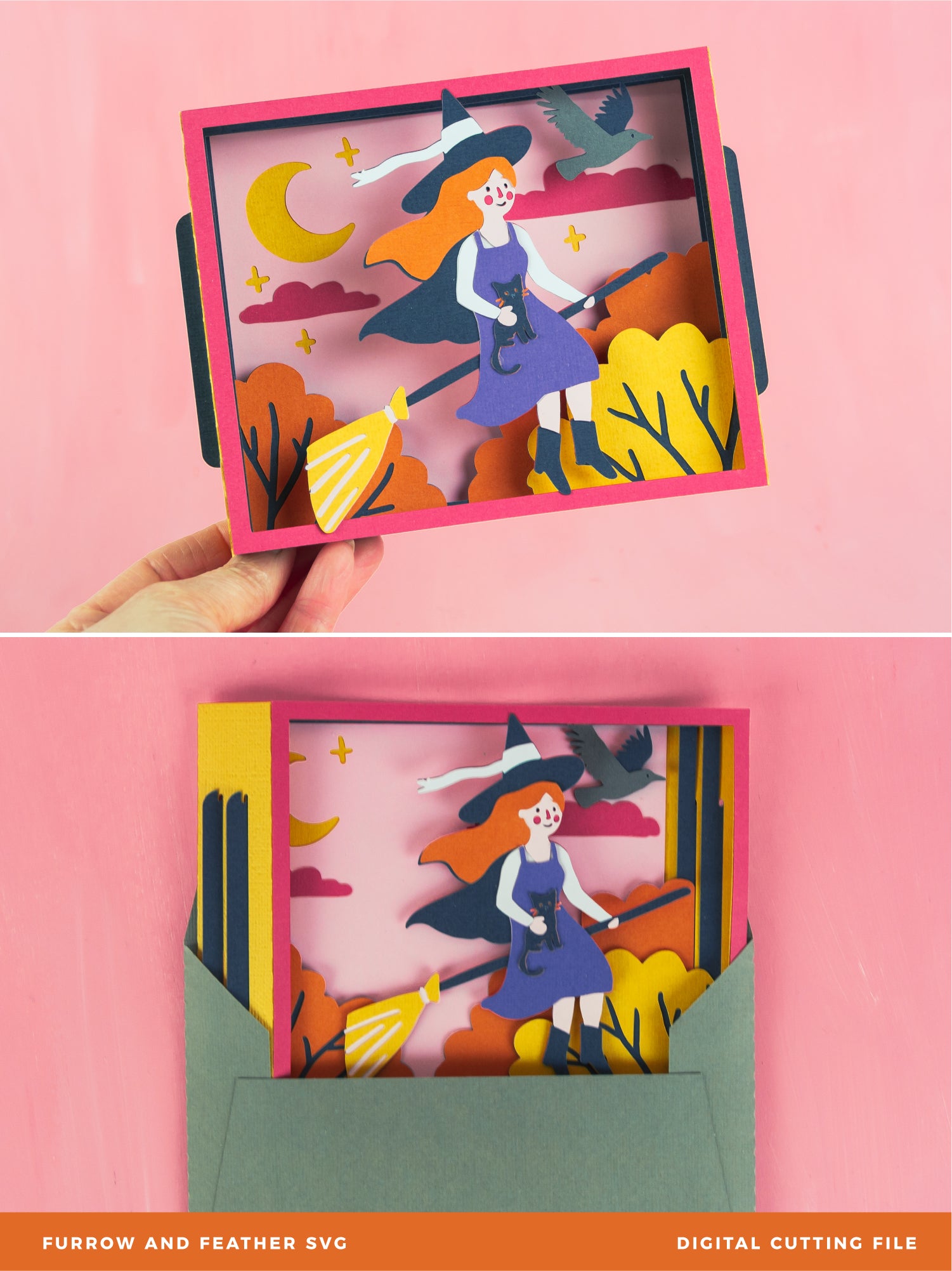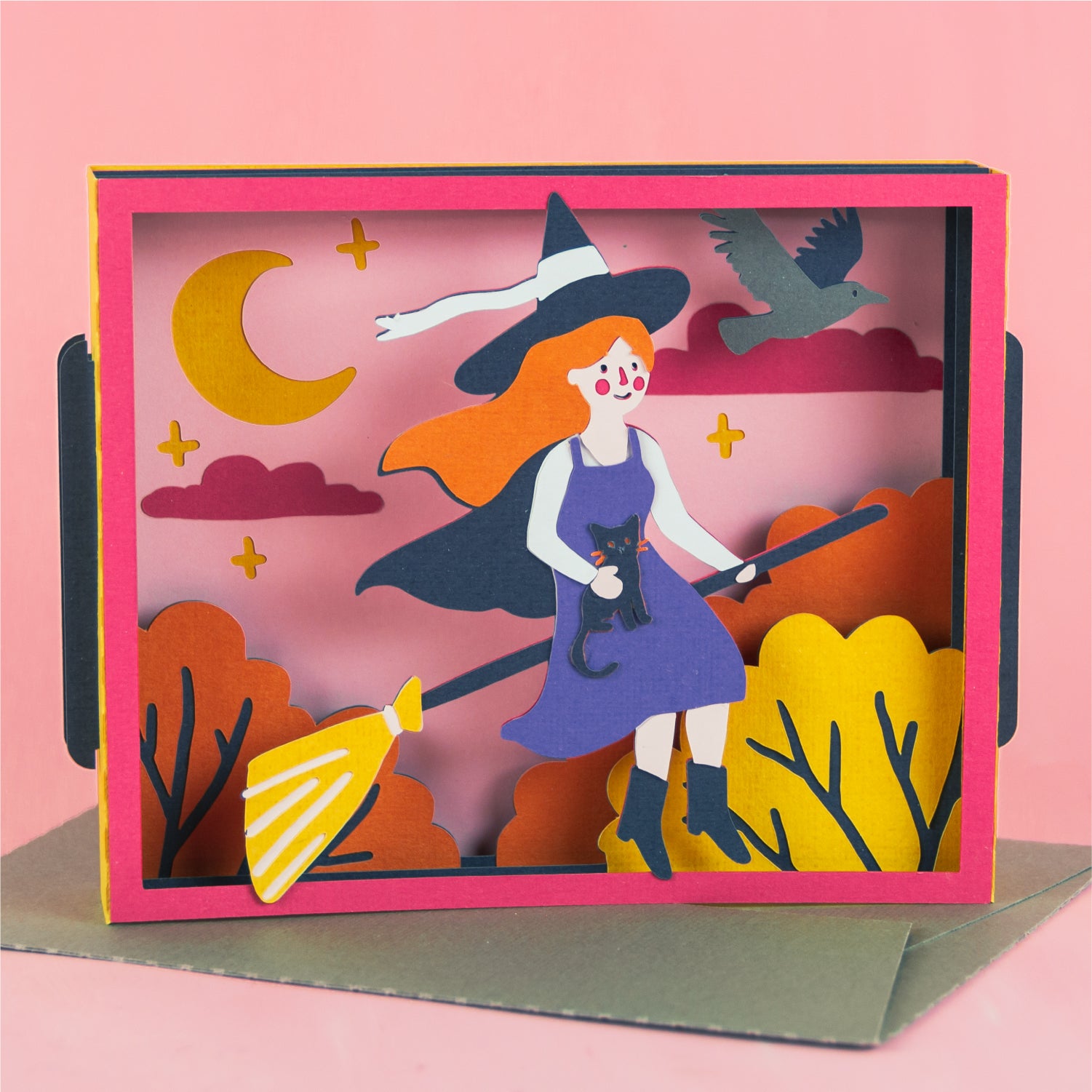 Seriously the cutest card for Halloween! Featuring a witch keeping a hold on her cat familiar. Change up the colors of the cardstock for a more unique look! I love all of the layers to this card.