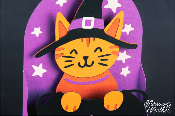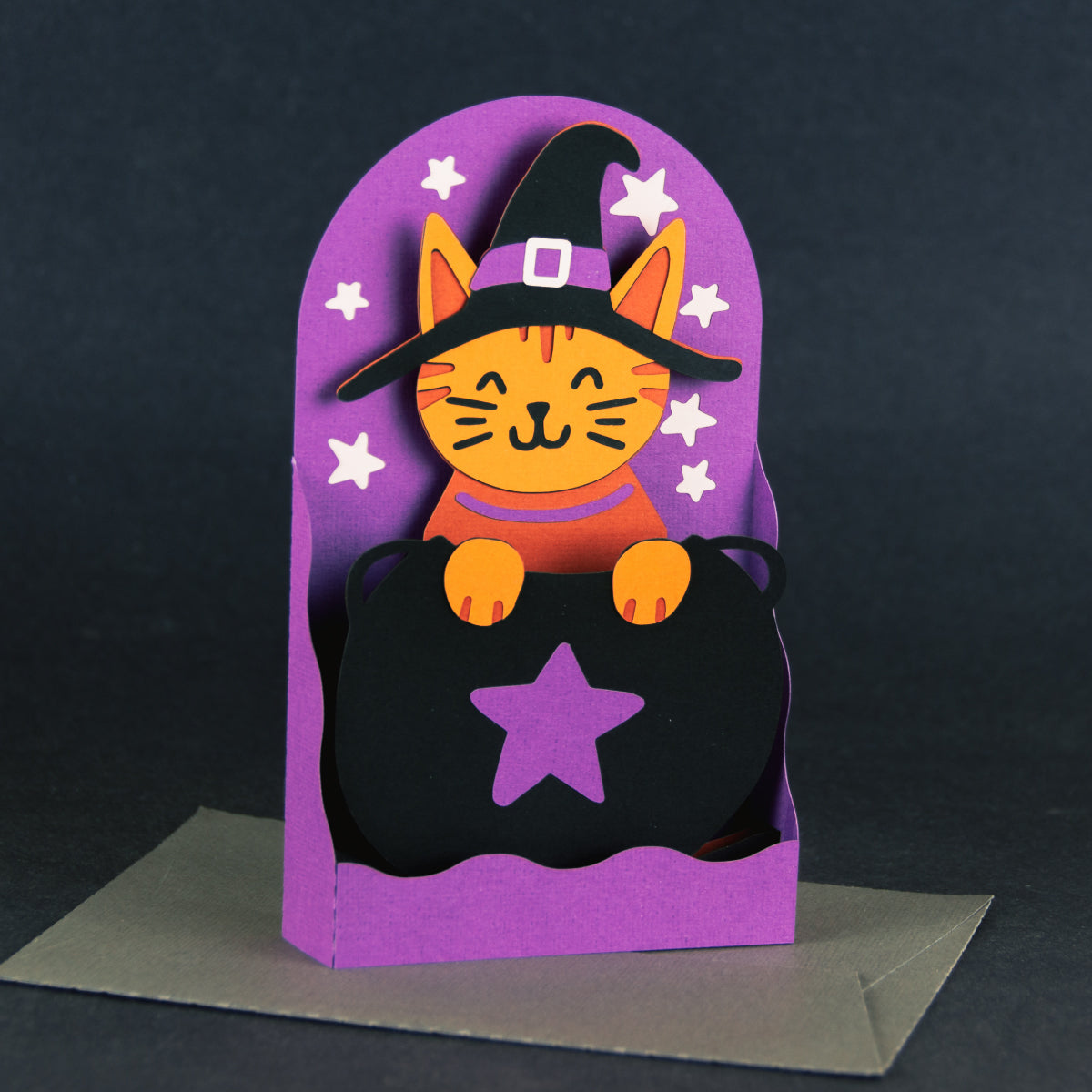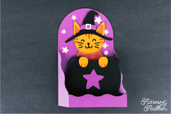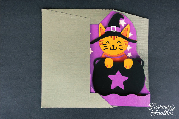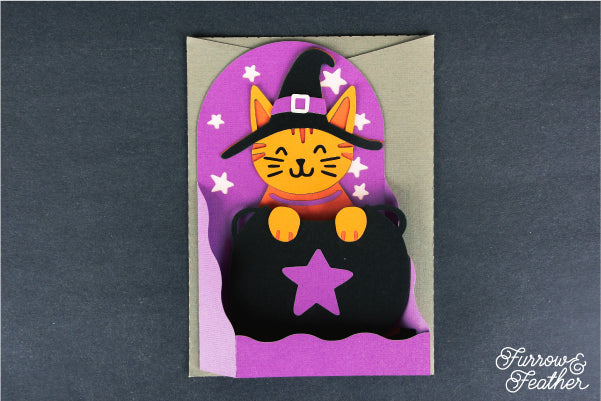 Super cute card for Halloween! Super easy to put together. Folds flat to fit in the included 5x7” envelope cut file.