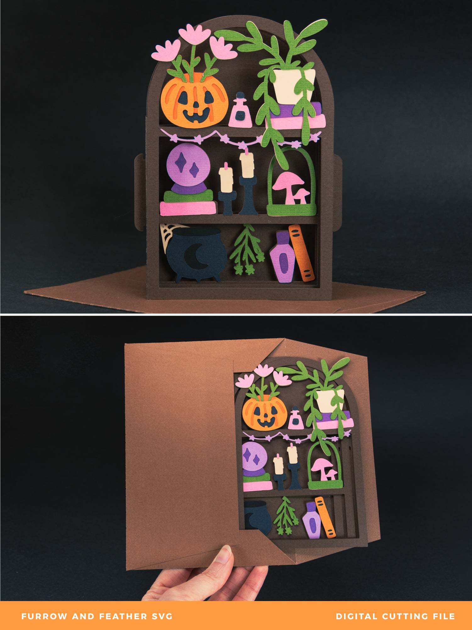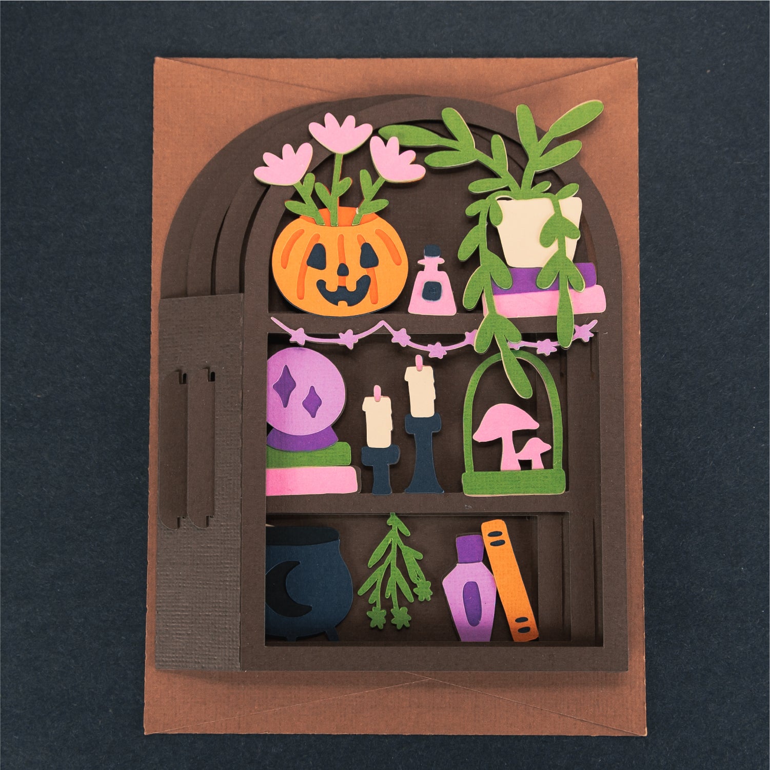 Create the cutest Halloween card with this Halloween Shelf card design - a 3D card SVG! This design features a bookshelf with books, potions, a cauldron, pumpkins, and more! I love updating the cardstock color of the shelves and background. This cutting file is perfect for Cricut and Silhouette cutting machines. The card folds flat for easy mailing and fits perfectly in the included 5x7” envelope cut file. Explore more of my card designs for even more cute and creative papercraft ideas!