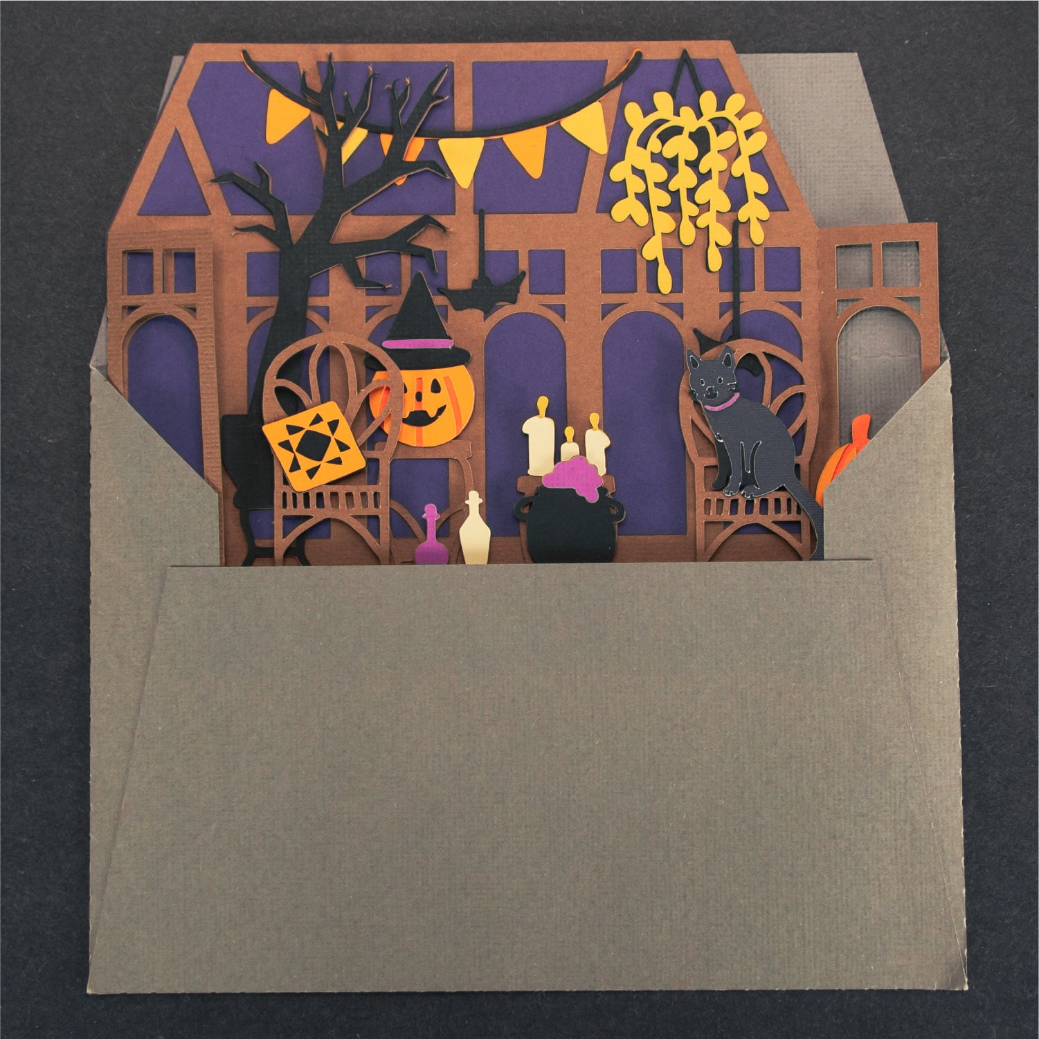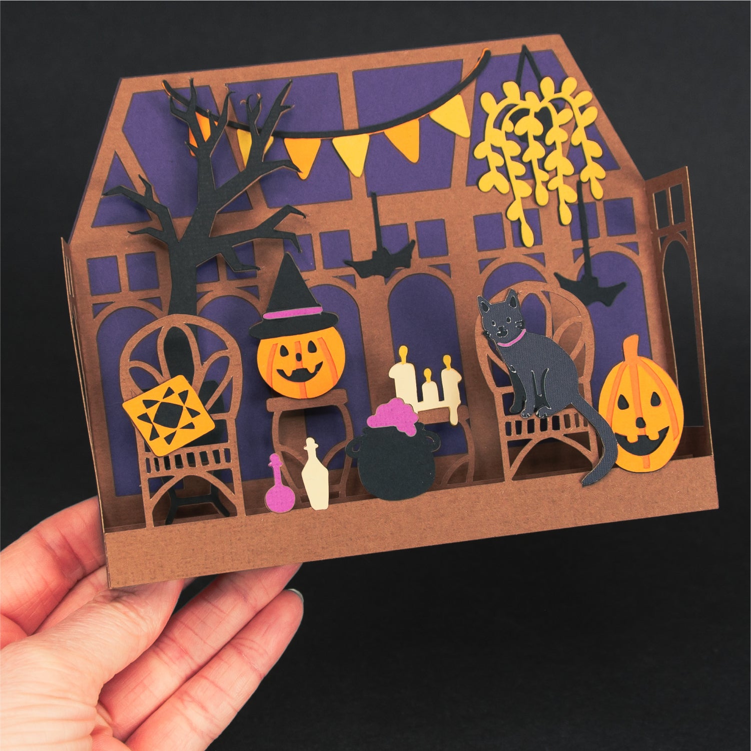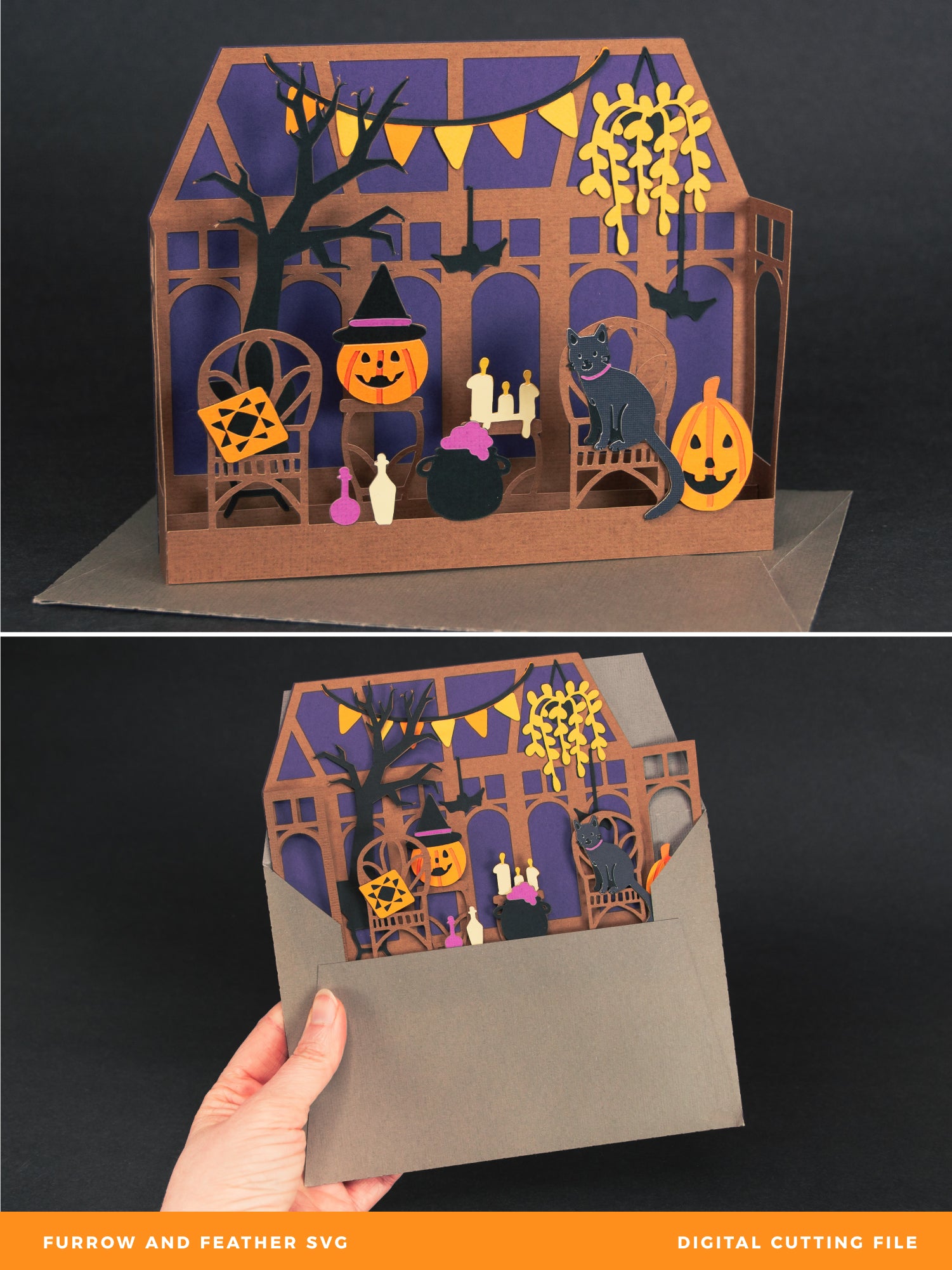 Create the cutest halloween card with this Halloween Sunroom Card - a 3D Autumn Card SVG! Featuring a sunroom decked out for Halloween, this cutting file is perfect for Cricut and Silhouette cutting machines. The card folds flat for easy mailing and fits perfectly in the included 5x7” envelope cut file. Change the color of the kitty or base cardstock, and add your own words to the front! Explore more of my designs for even more cute and creative papercraft ideas!