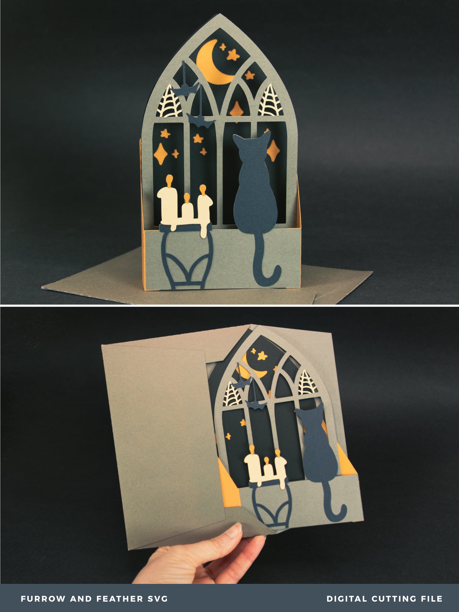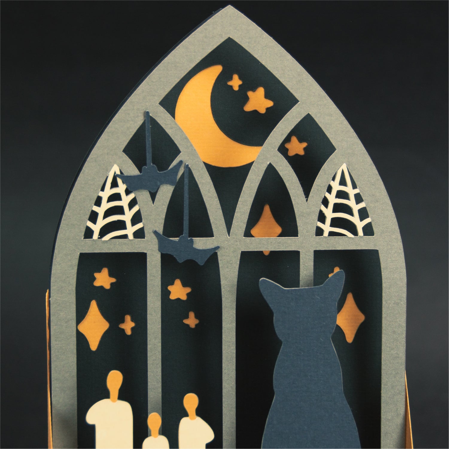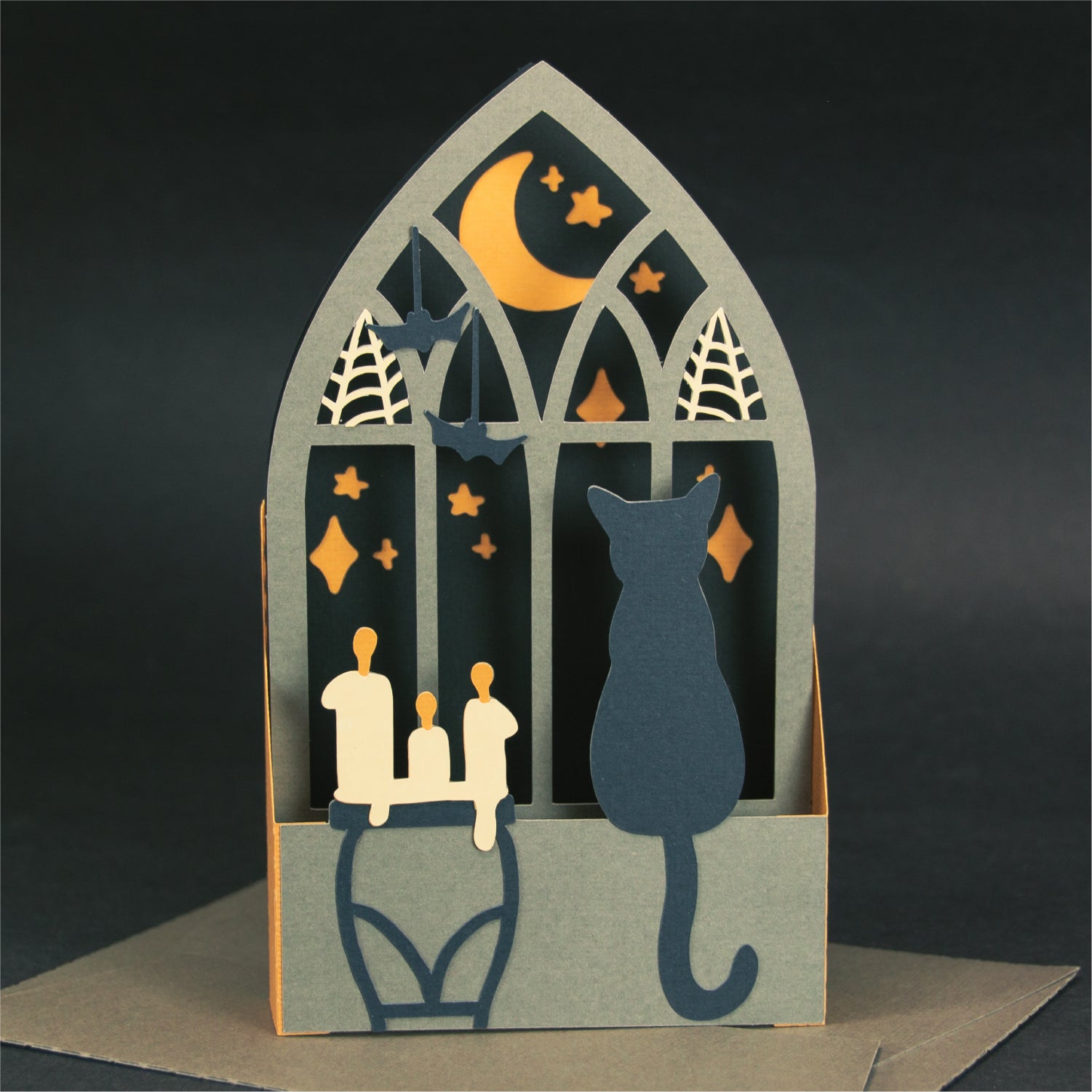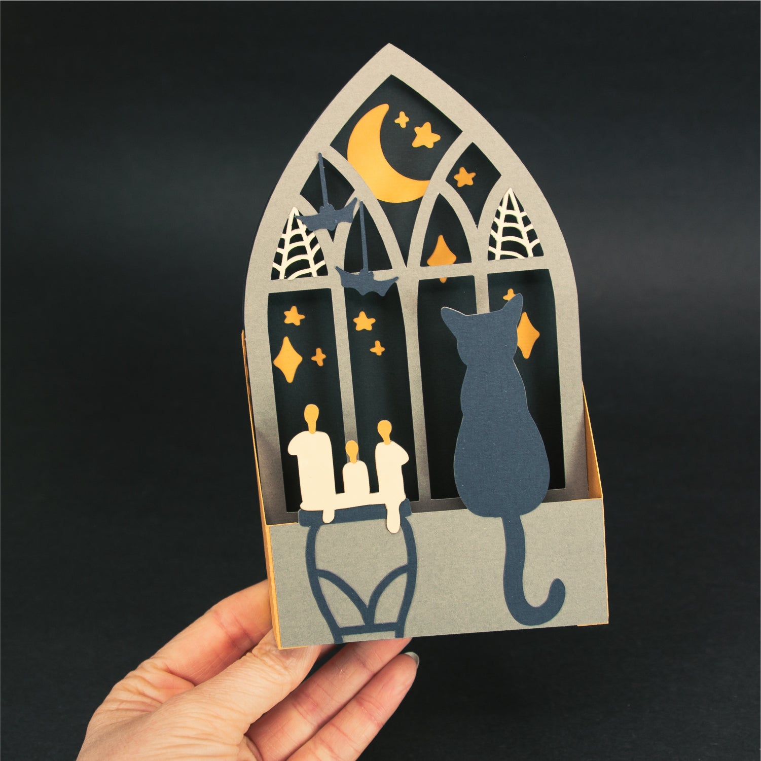Create an easy and fun card with this Halloween Window card design - a 3D card SVG! This design features a cat looking out of a window, with a moon and stars. You could change the color of the cat. This cutting file is perfect for Cricut and Silhouette cutting machines. The card folds flat for easy mailing and fits perfectly in the included 5x7” envelope cut file. Explore more of my card designs for even more cute and creative papercraft ideas!