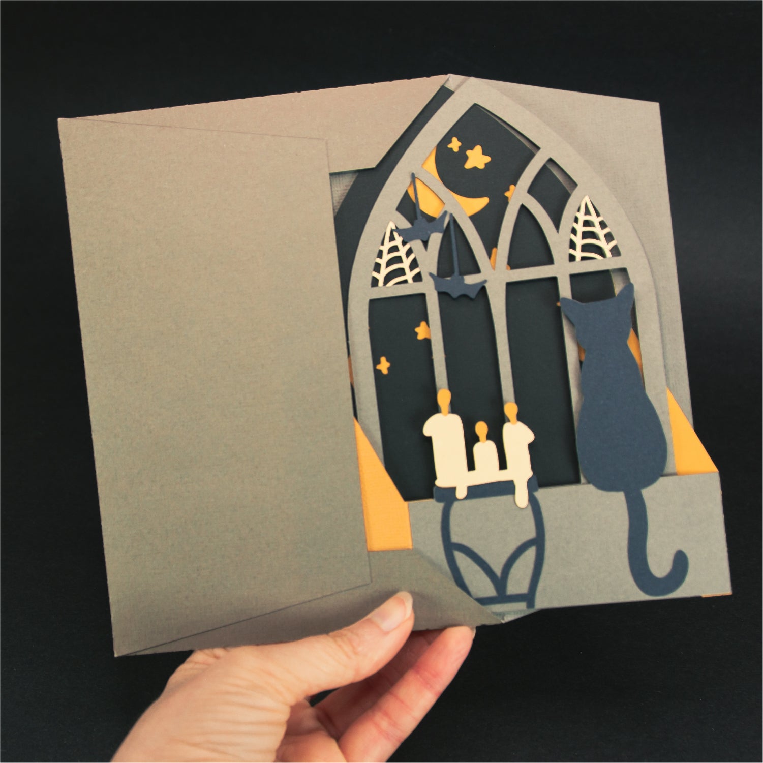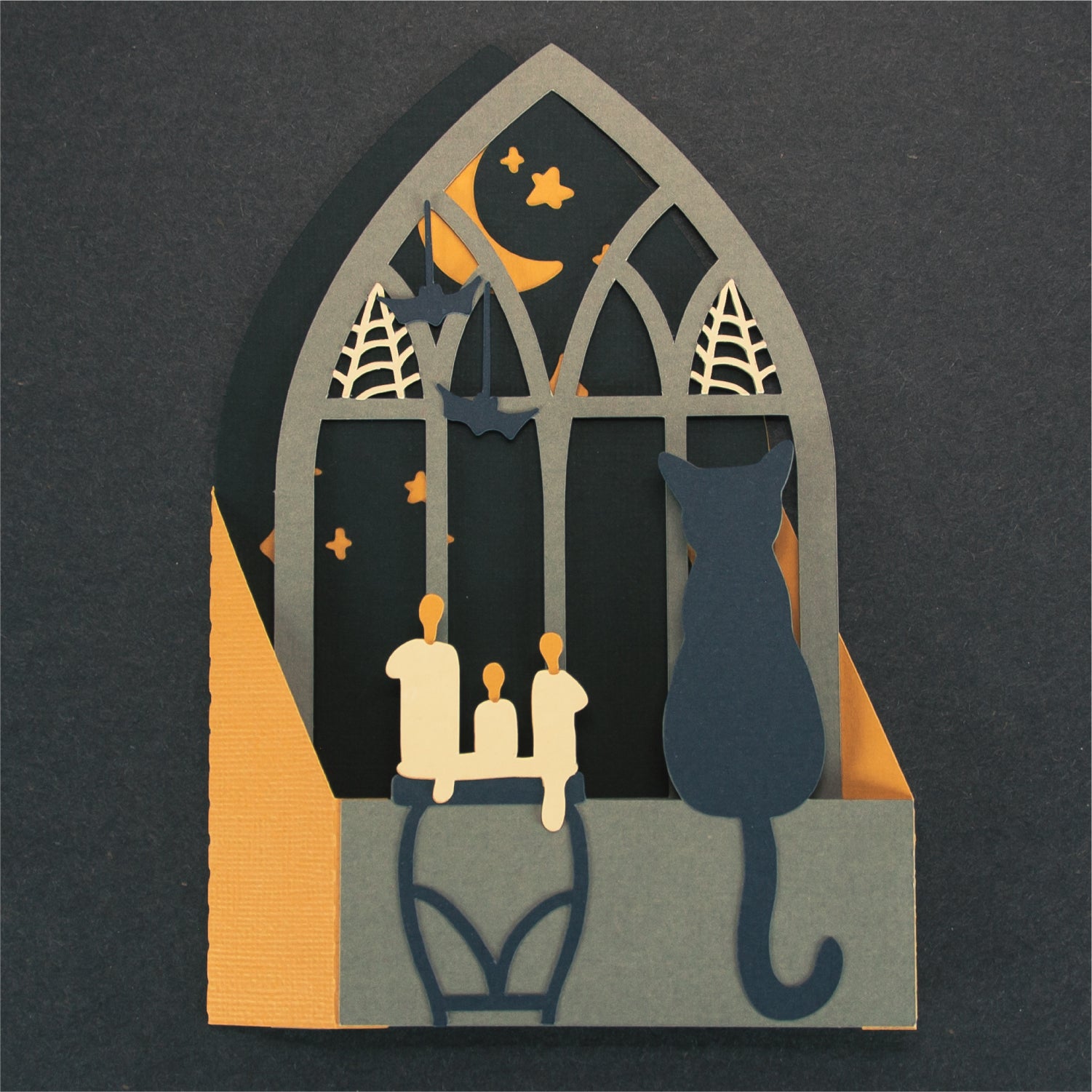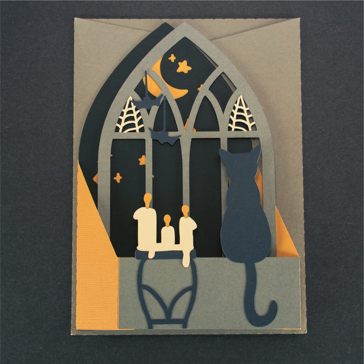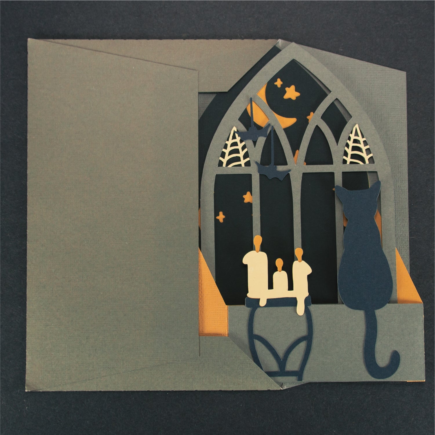 Create an easy and fun card with this Halloween Window card design - a 3D card SVG! This design features a cat looking out of a window, with a moon and stars. You could change the color of the cat. This cutting file is perfect for Cricut and Silhouette cutting machines. The card folds flat for easy mailing and fits perfectly in the included 5x7” envelope cut file. Explore more of my card designs for even more cute and creative papercraft ideas!