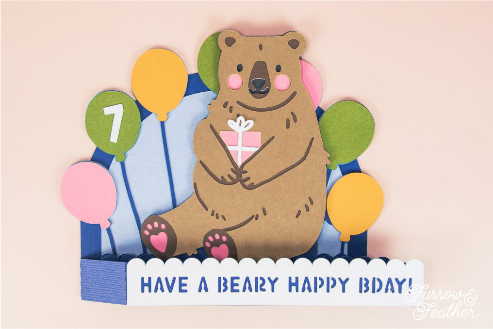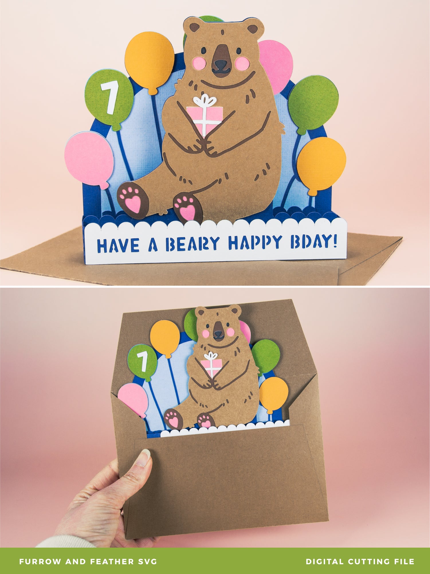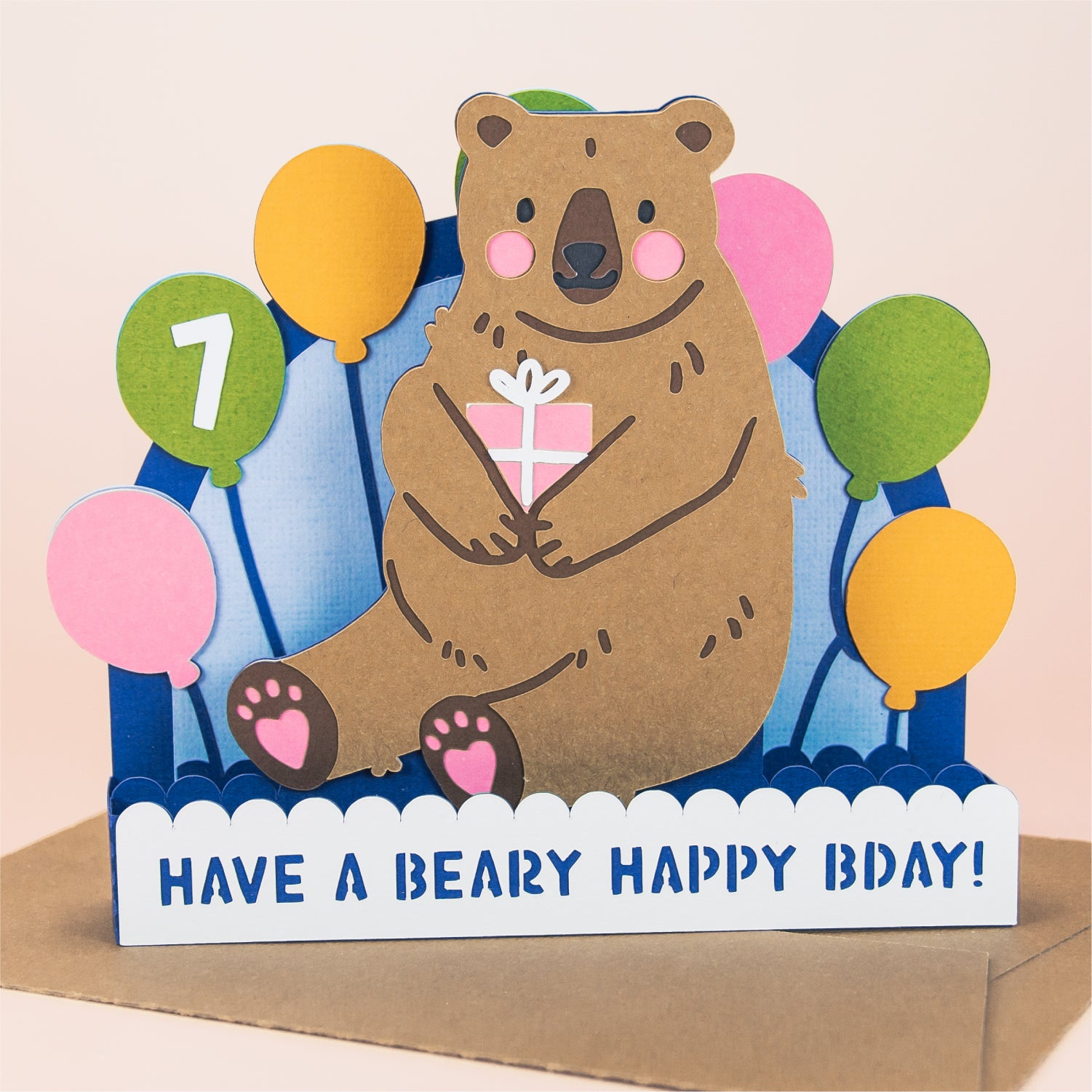 Create a super fun birthday card with this 'Have a Beary Happy Bday' card - a Bear Birthday Card SVG! This file includes optional numbers for the balloons, and a plain 'front piece' if you want to include your own phrase. Change the cardstock color of the balloons & gift! Featuring a cute bear in front of some colorful balloons, this card is perfect for Cricut and Silhouette cutting machines. This design folds flat for easy mailing and fits perfectly in the included 5x7” envelope cut file. Explore more of my birthday card designs for even more cute and unique crafting ideas!