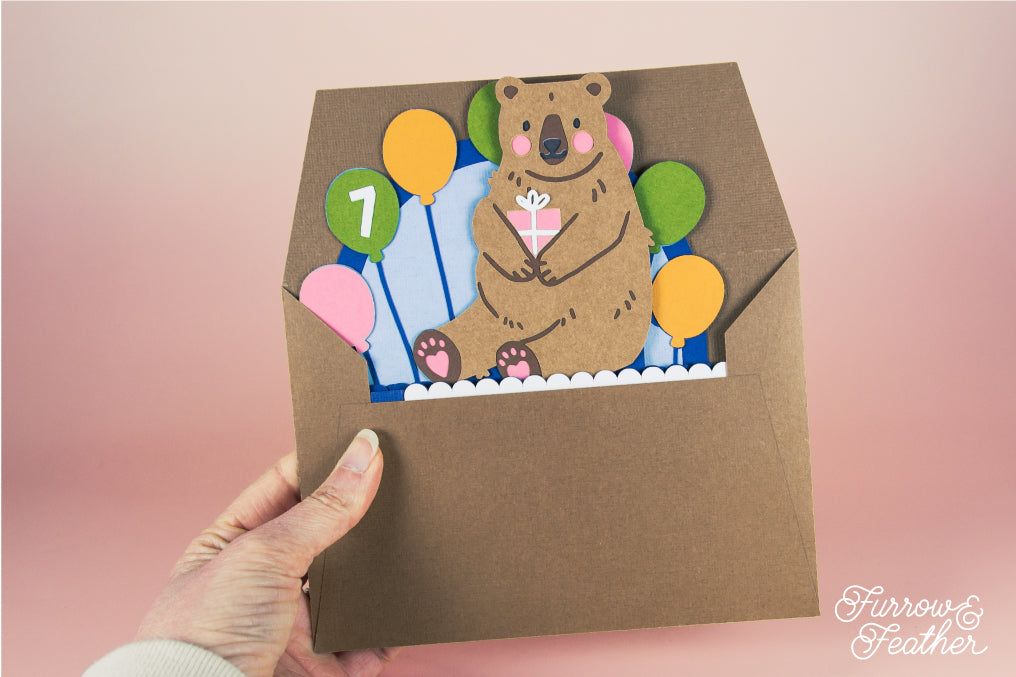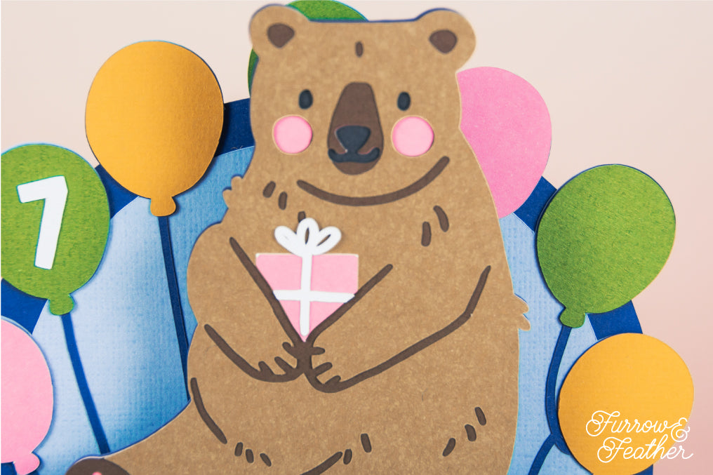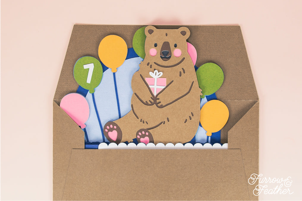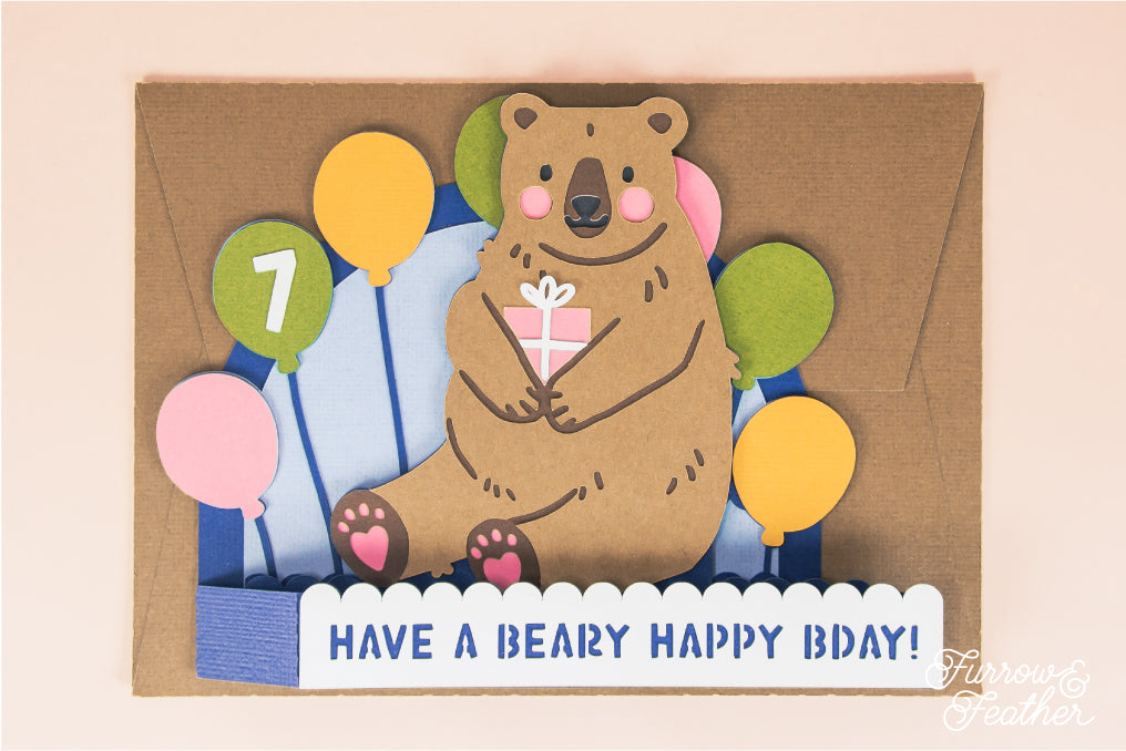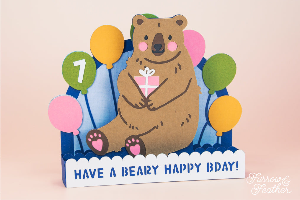 Create a super fun birthday card with this 'Have a Beary Happy Bday' card - a Bear Birthday Card SVG! This file includes optional numbers for the balloons, and a plain 'front piece' if you want to include your own phrase. Change the cardstock color of the balloons & gift! Featuring a cute bear in front of some colorful balloons, this card is perfect for Cricut and Silhouette cutting machines. This design folds flat for easy mailing and fits perfectly in the included 5x7” envelope cut file. Explore more of my birthday card designs for even more cute and unique crafting ideas!