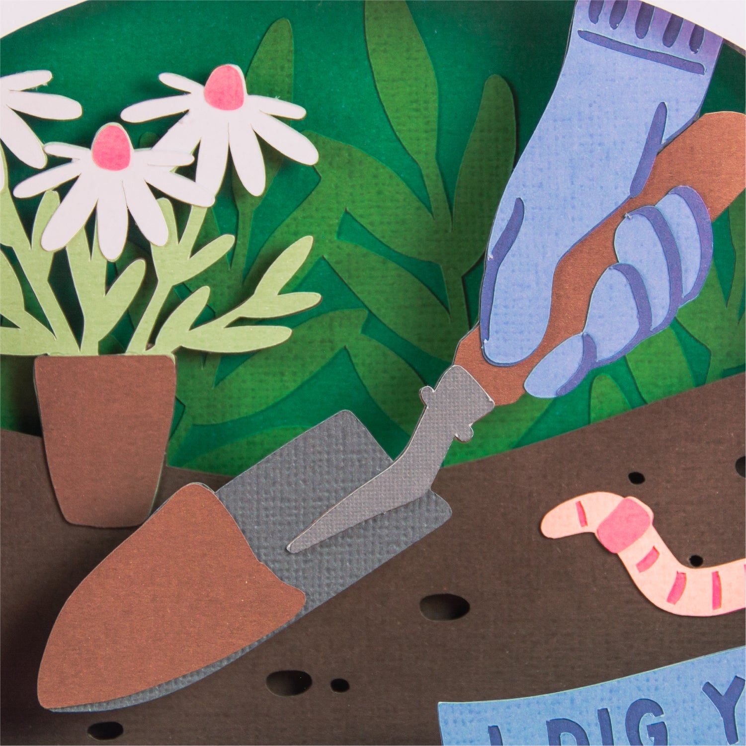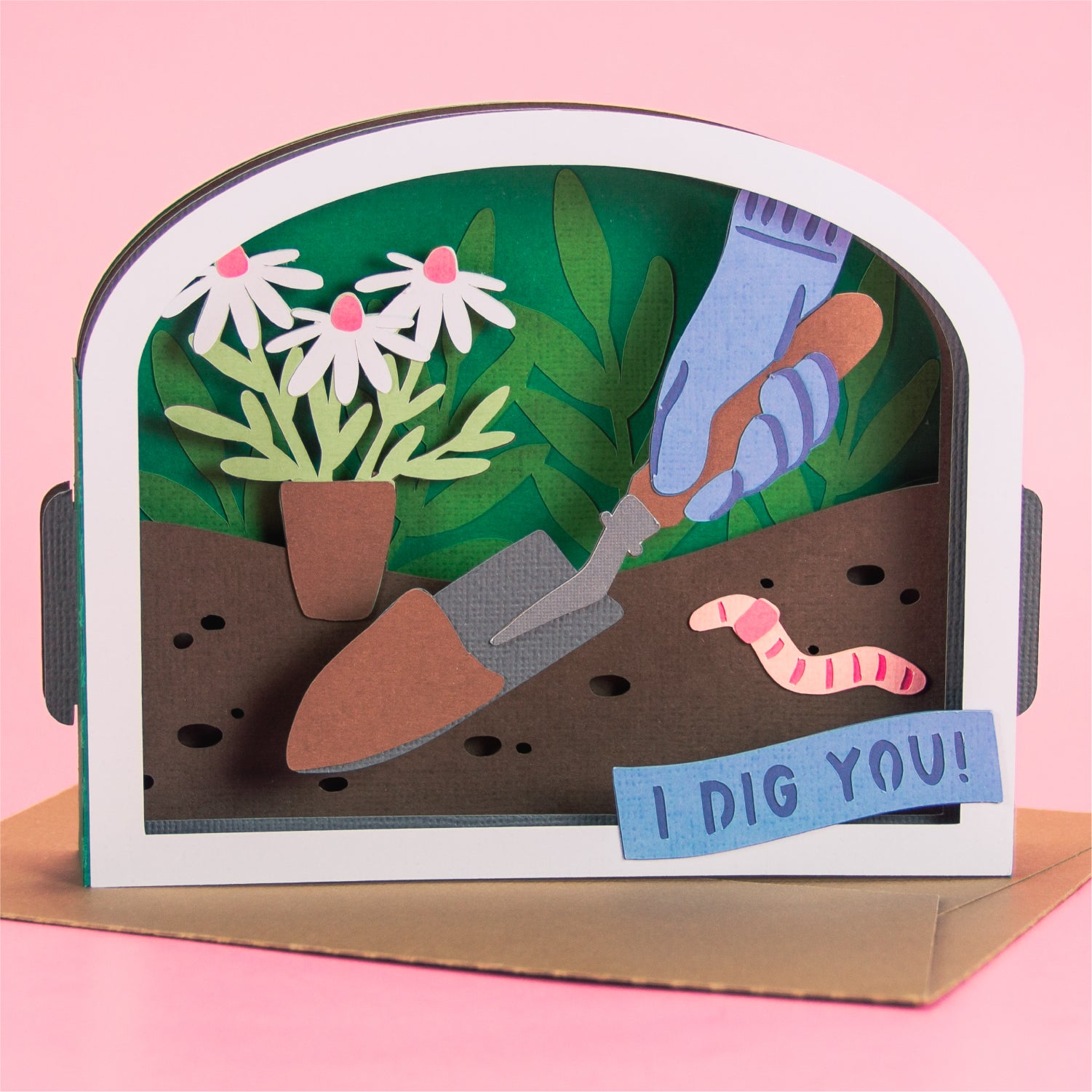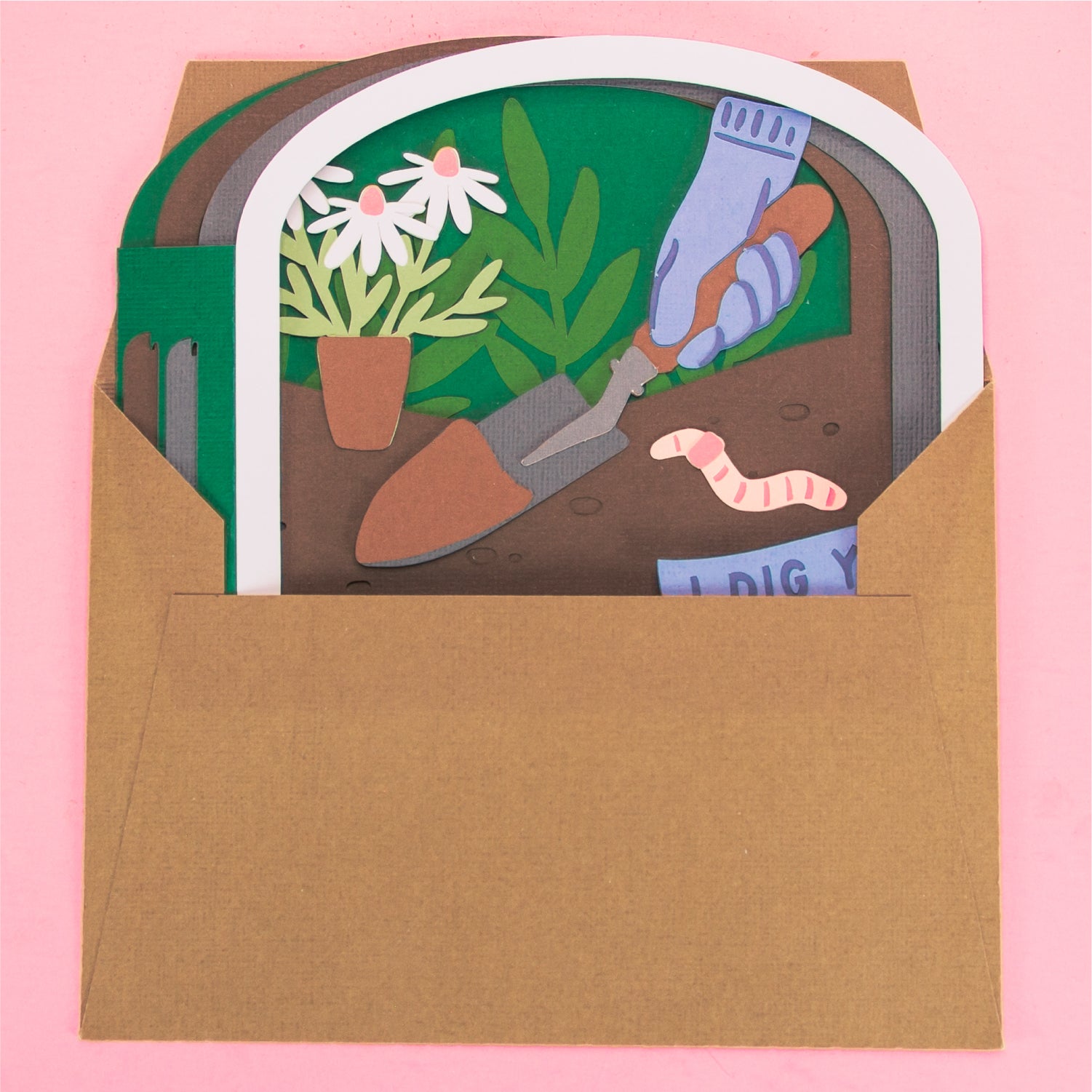 Create a super cute card with this 'I Dig You!' Garden Card SVG! This design features a gloved hand planting a flower with a trowel, and a cute earthworm! I love this one for Valentine's Day, an anniversary, a birthday, or just to say hi to a friend! Update the colors of the flowers and gloves for a more unique card. I’d love to see the gloves in a patterned paper! Includes an optional 'I Dig You!' sentiment. This cutting file is perfect for Cricut and Silhouette cutting machines. This design folds flat for easy mailing and fits perfectly in the included 5x7” envelope cut file. Explore more of my card designs for even more cute and creative ideas!