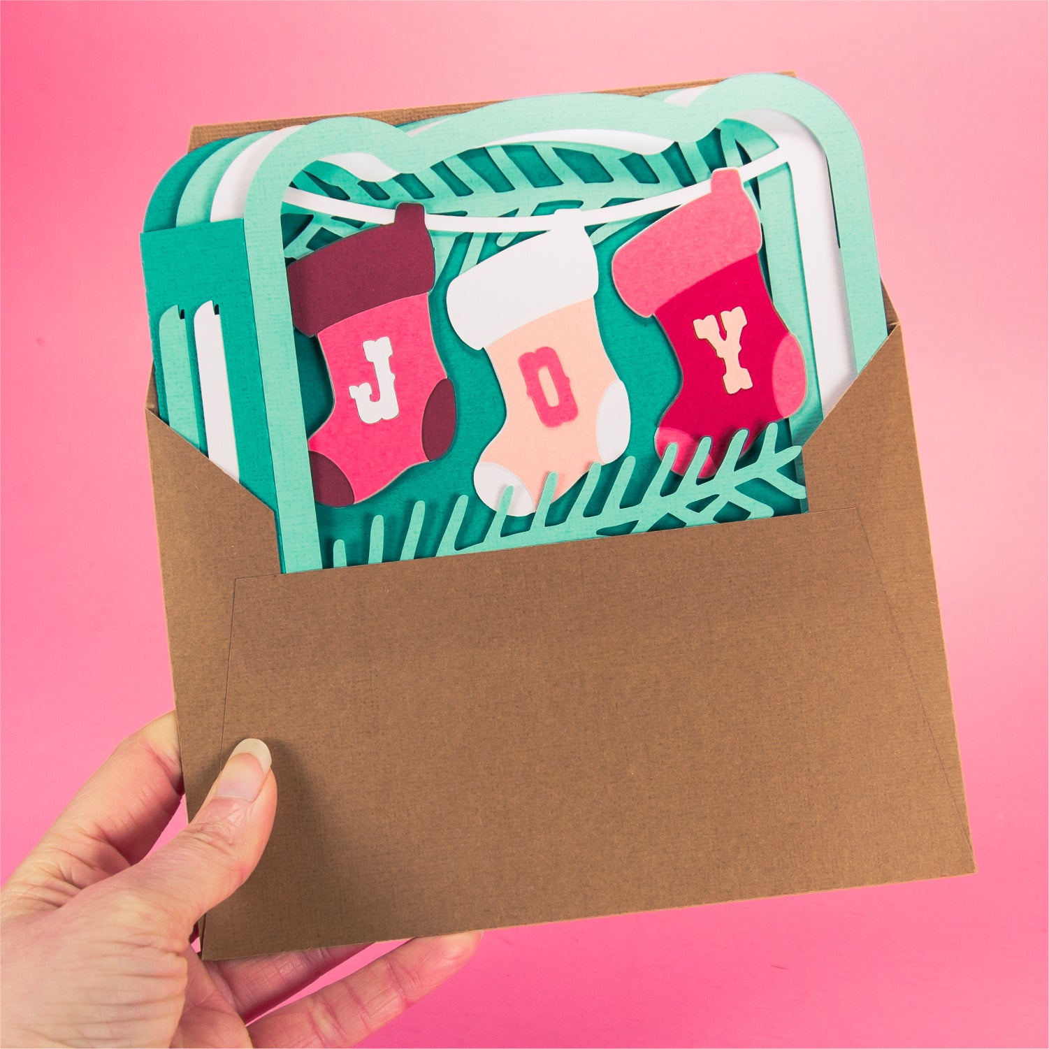 Create a super easy card for Christmas with this Joy Stockings card design - a 3D Christmas card SVG! This is a layered design, with three colorful stockings spelling out Joy. There are pine branches in front of the stockings and behind. I love updating the cardstock colors for the stockings! This cutting file is perfect for Cricut and Silhouette cutting machines. The card folds flat for easy mailing and fits perfectly in the included 5x7” envelope cut file. Explore more of my card designs for even more cute and creative Christmas papercraft ideas!
