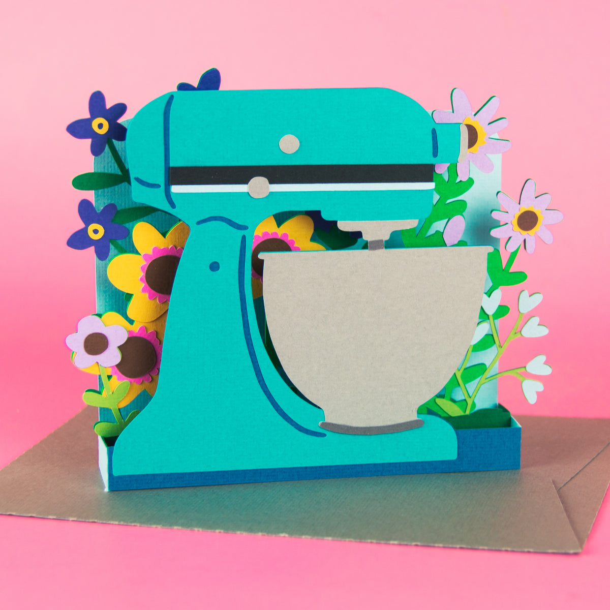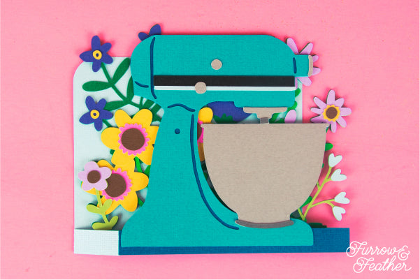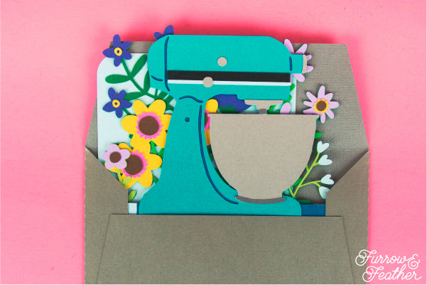 A fun card for your favorite baker! Works for any occasion, just add your own sentiment! Change the color of the mixer to customize the card, or use patterned paper! Folds flat to fit in the included 5x7” envelope cut file.