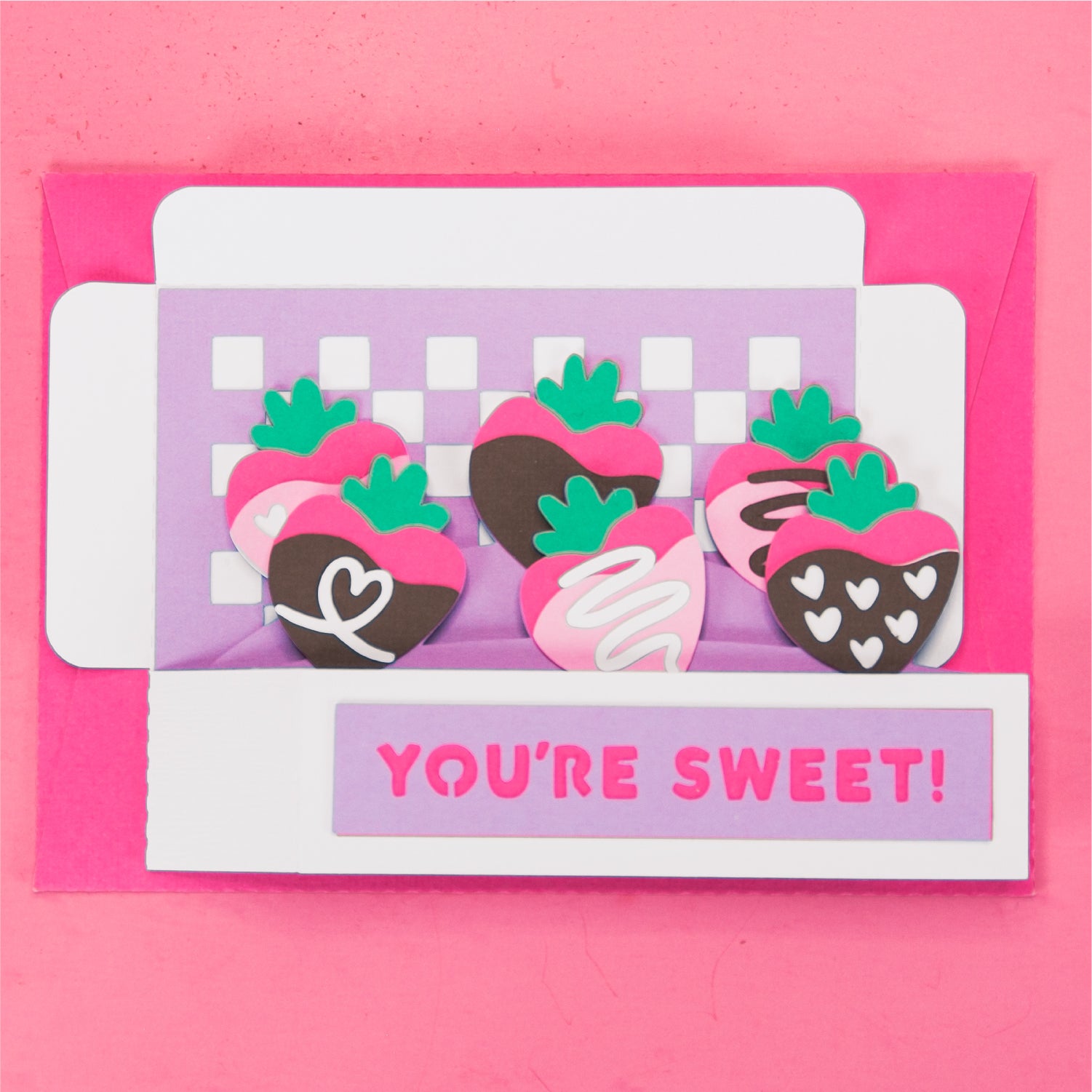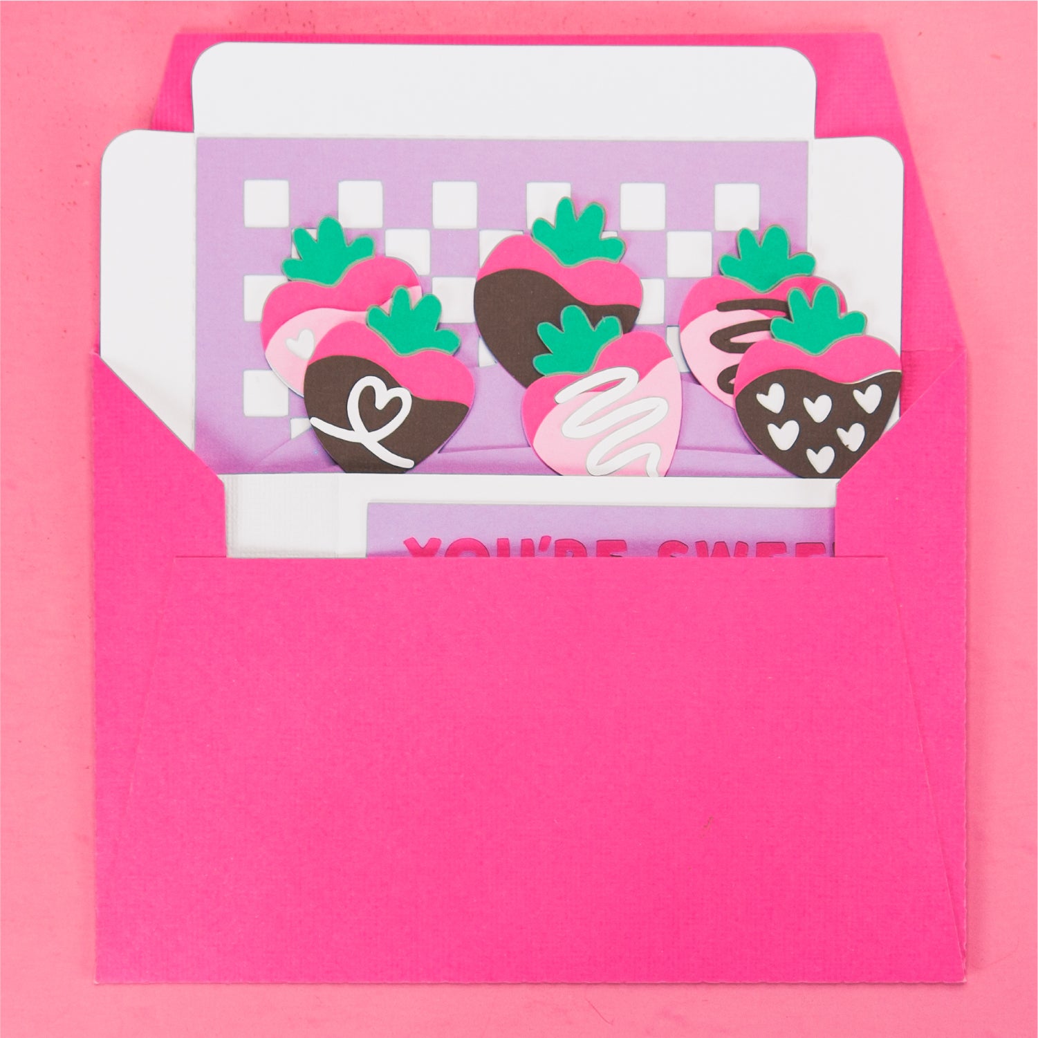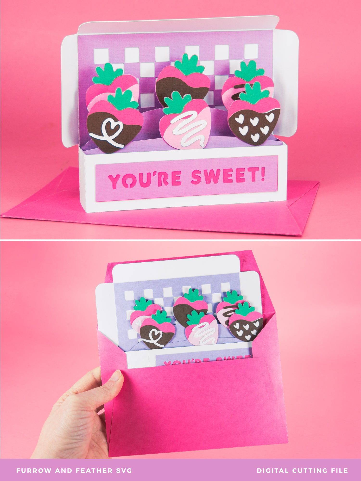 Create a super fun Valentine's Day card with this Layered Chocolate Covered Strawberries Card SVG! This design features six chocolate covered strawberries layered in a box. It includes the optional phrase 'You're Sweet!'. I love this one for Valentine's Day or an anniversary! You could change up the purple accent color to whatever you'd like. This cutting file is perfect for Cricut and Silhouette cutting machines. This design folds flat for easy mailing and fits perfectly in the included 5x7” envelope cut file. Explore more of my card designs for even more cute and creative ideas!