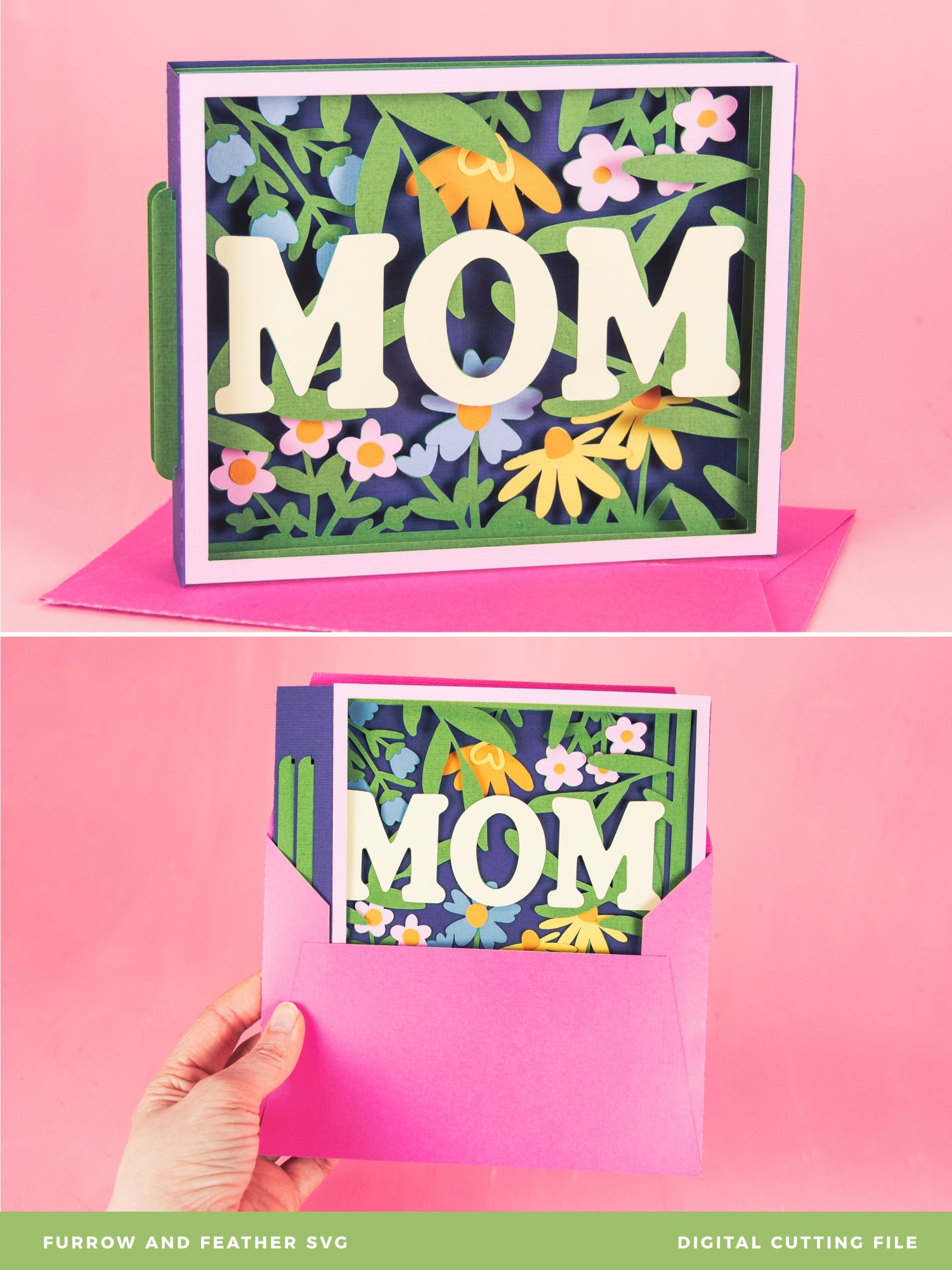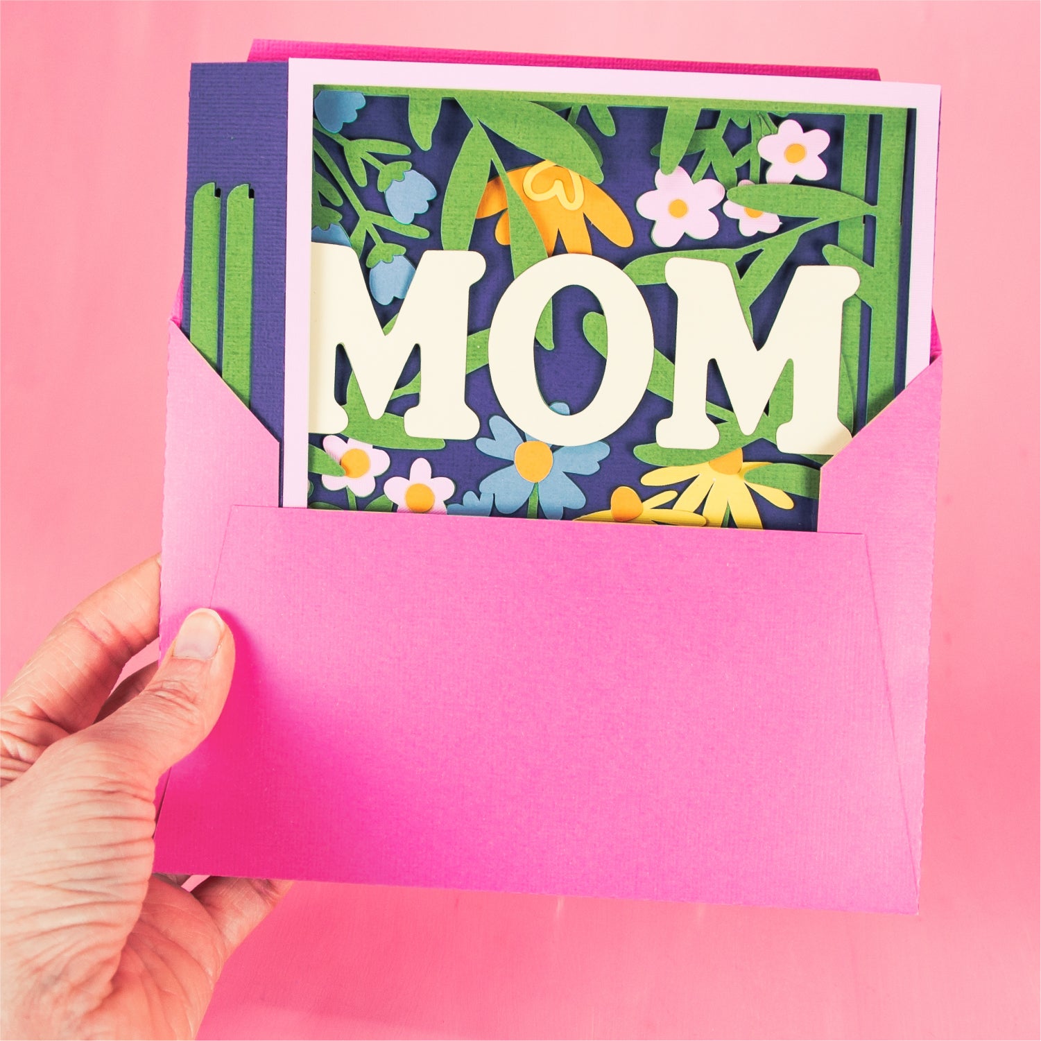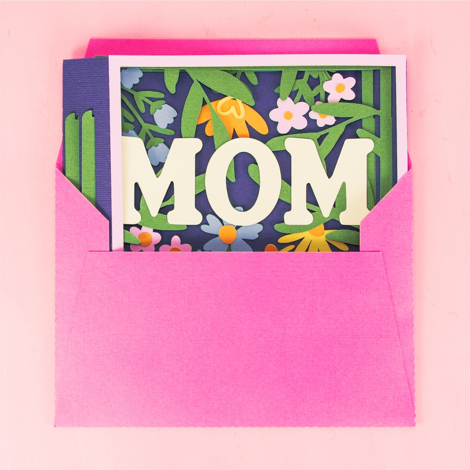 Create a stunning card for Mother's Day with this Layered Mom Card with Flowers - a 3D card SVG! This is a gorgeous card for Mother's Day, or a birthday card for mom. I love updating the cardstock colors to mom's favorite colors! This cutting file is perfect for Cricut and Silhouette cutting machines. The card folds flat for easy mailing and fits perfectly in the included 5x7” envelope cut file. Explore more of my card designs for even more cute and creative ideas!