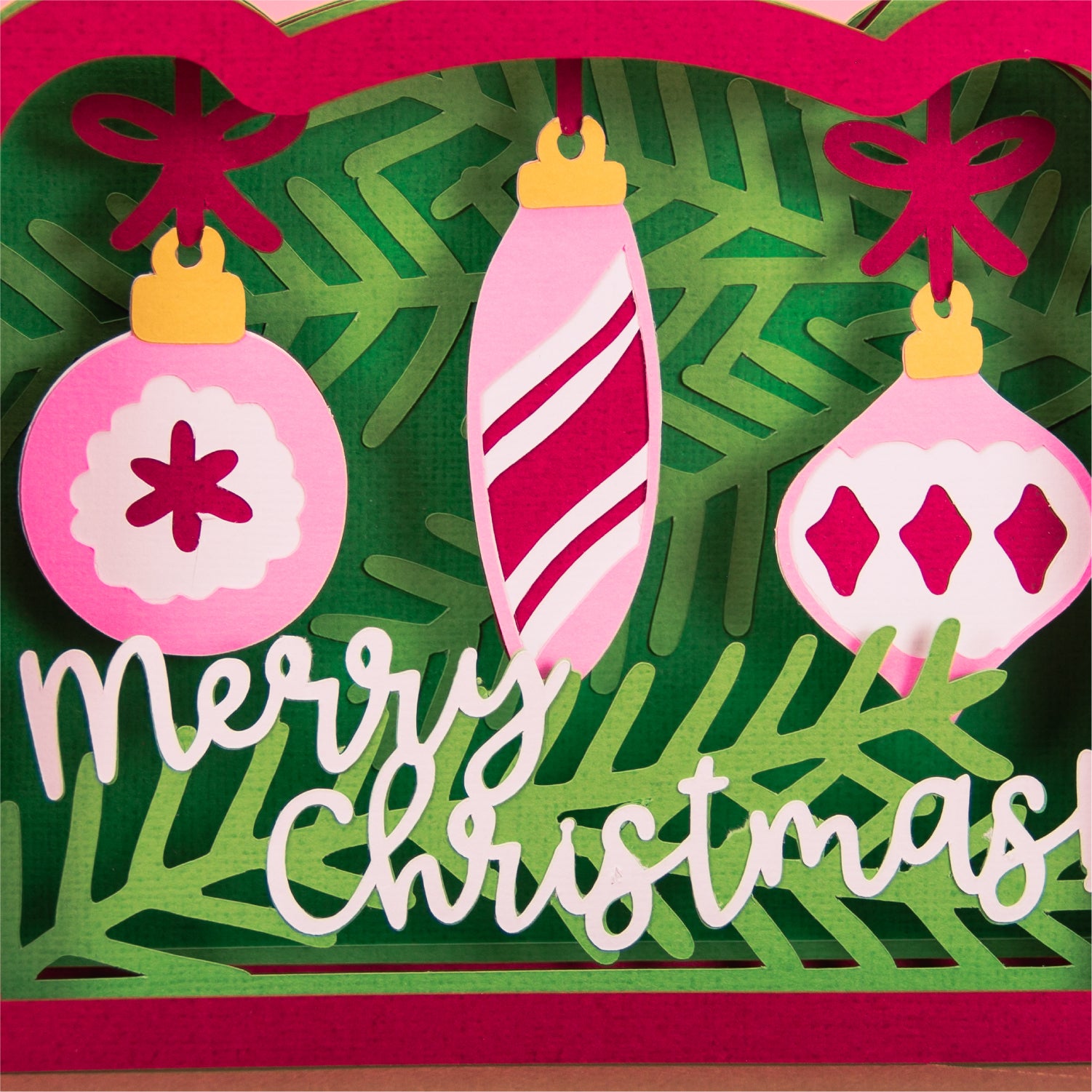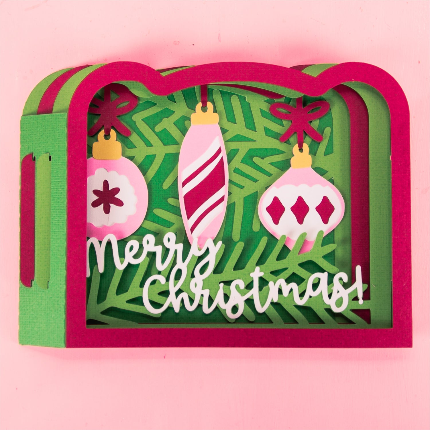 Create a super fun card for Christmas with this 'Merry Christmas!' Ornament card design - a 3D Christmas card SVG! This is a layered design, with the words 'Merry Christmas' in front of some colorful Christmas ornaments. This is a great scrap buster project! I love updating the colors for the ornaments, or use gold foil cardstock for the hangers! This cutting file is perfect for Cricut and Silhouette cutting machines. The card folds flat for easy mailing and fits perfectly in the included 5x7” envelope cut file. Explore more of my card designs for even more cute and creative Christmas papercraft ideas!